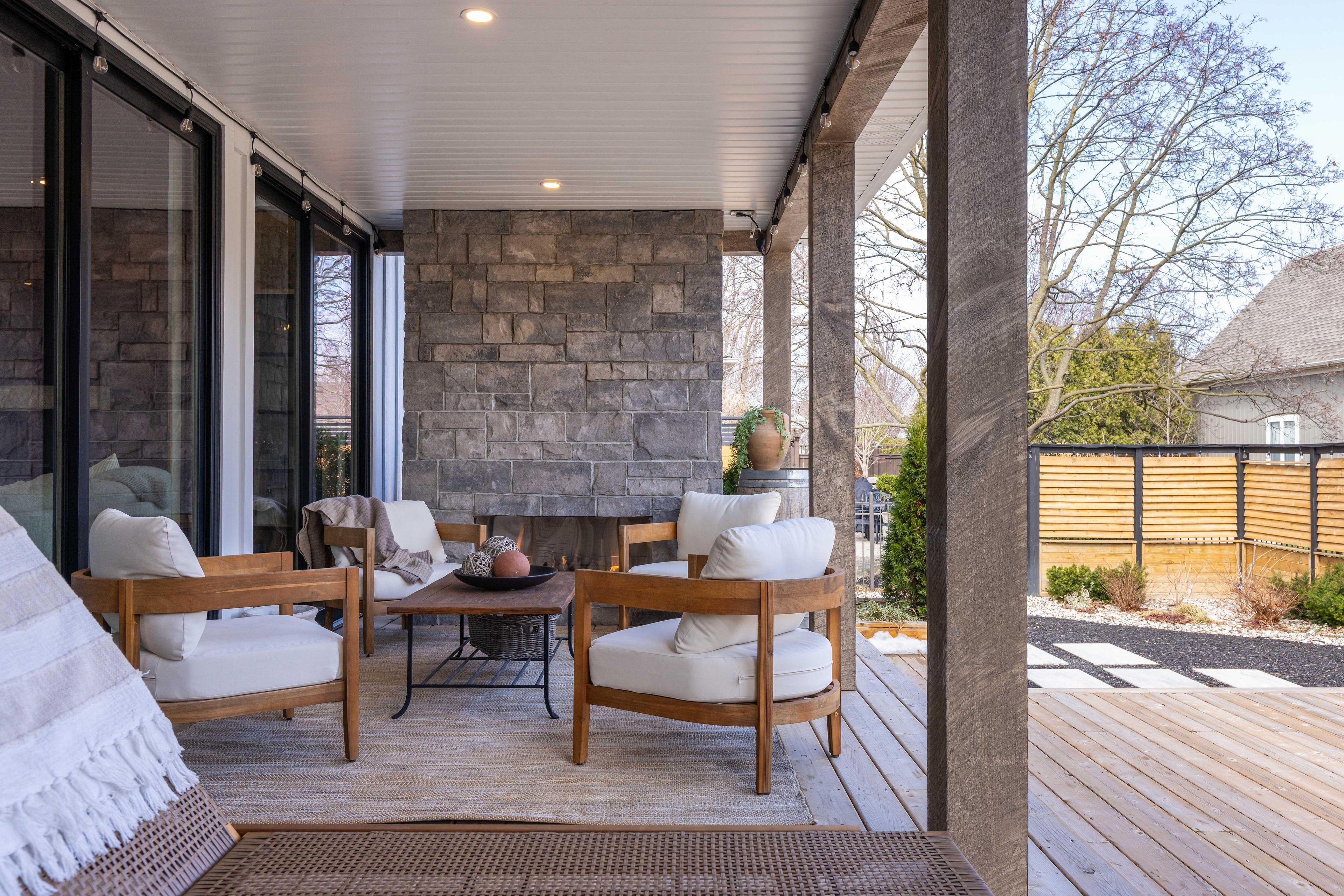 • Meticulously landscaped outdoor area featuring a gas fireplace for relaxation.