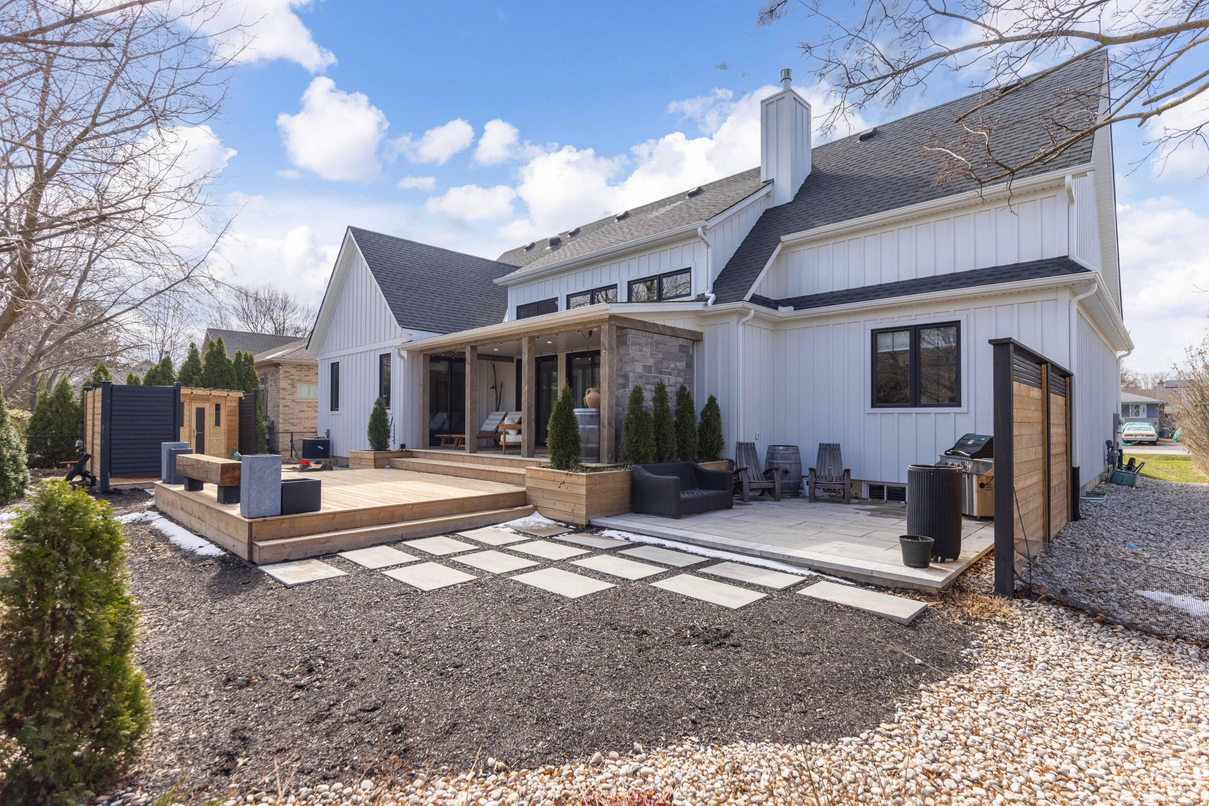 Experience the perfect blend of modern farmhouse charm and refined elegance in this exceptional, nearly new bungalow, nestled in a quiet and highly desirable location. Less than five years old and thoughtfully designed, this stunning residence offers approximately 1,800 square feet of beautifully curated living space. Featuring three spacious bedrooms and three luxurious bathrooms, every inch of this home showcases top-quality finishes and a distinctive, design-forward approach. Unique textures and creative details elevate the interiors, creating a warm yet sophisticated atmosphere that feels both inviting and elevated. At the heart of the home, a large, oversized island anchors the open-concept kitchen-perfect for entertaining and everyday living alike. Sunlight pours in from the south-facing exposure, enhancing the bright, airy feel throughout the main living spaces. Step outside to a meticulously landscaped setting designed for true outdoor living. The inviting outdoor space is complete with a gas fireplace, offering the perfect backdrop for relaxing evenings or hosting guests in style. This is a rare opportunity to own a modern farmhouse bungalow that seamlessly combines comfort, craftsmanship, and timeless design.