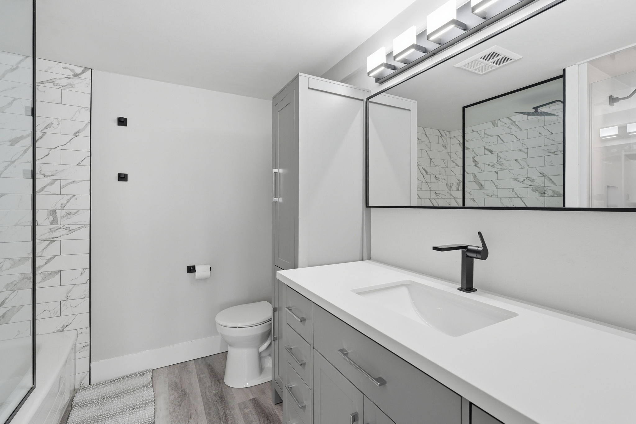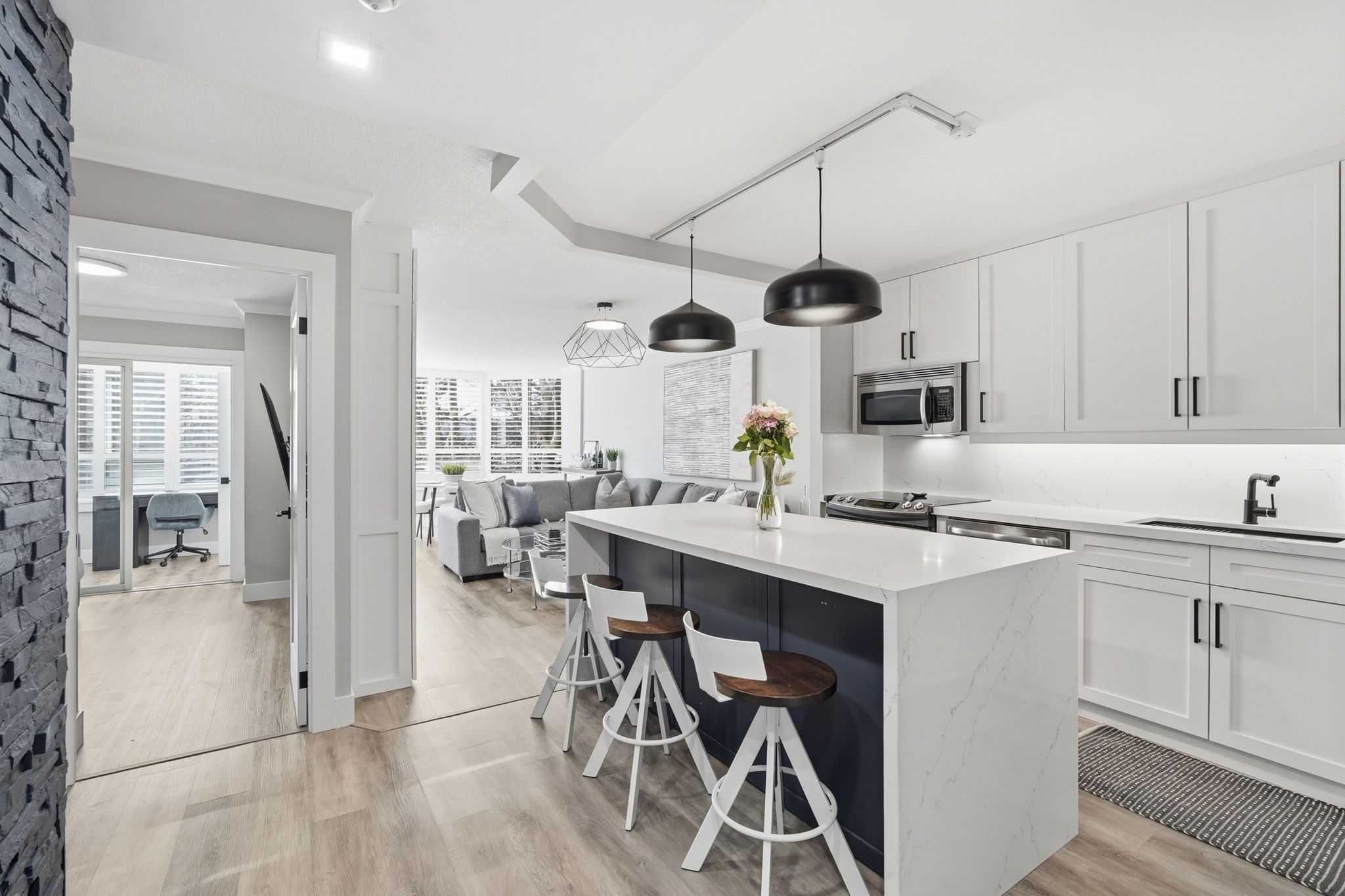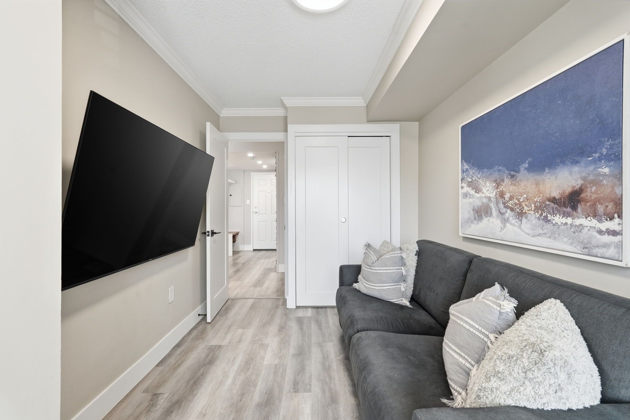 If walking distance to the lake is what you are looking for then look no further. Welcome to this beautifully renovated 3-bedroom + den unit, offering high-quality renovations throughout. This bright and thoughtfully redesigned unit showcases california shutters throughout, filling the space with natural light while adding timeless elegance and privacy. The fully updated kitchen features sleek stainless steel appliances, modern finishes, and carefully planned storage solutions to maximize functionality. Every detail of the renovation was intentionally executed to enhance both style and everyday practicality, with ample storage seamlessly integrated throughout. The three bedrooms are well-proportioned and inviting, while the open-concept living and dining areas create a warm, airy atmosphere ideal for both relaxing and entertaining. The versatile den, prominently positioned is perfect for a home office or private retreat. With 24-7 concierge, ample visitor parking and located just steps from the lake and close to shopping, dining, transit, and everyday amenities, this condo offers the perfect balance of lifestyle and convenience. Completely turnkey and move-in ready - simply unpack and enjoy.