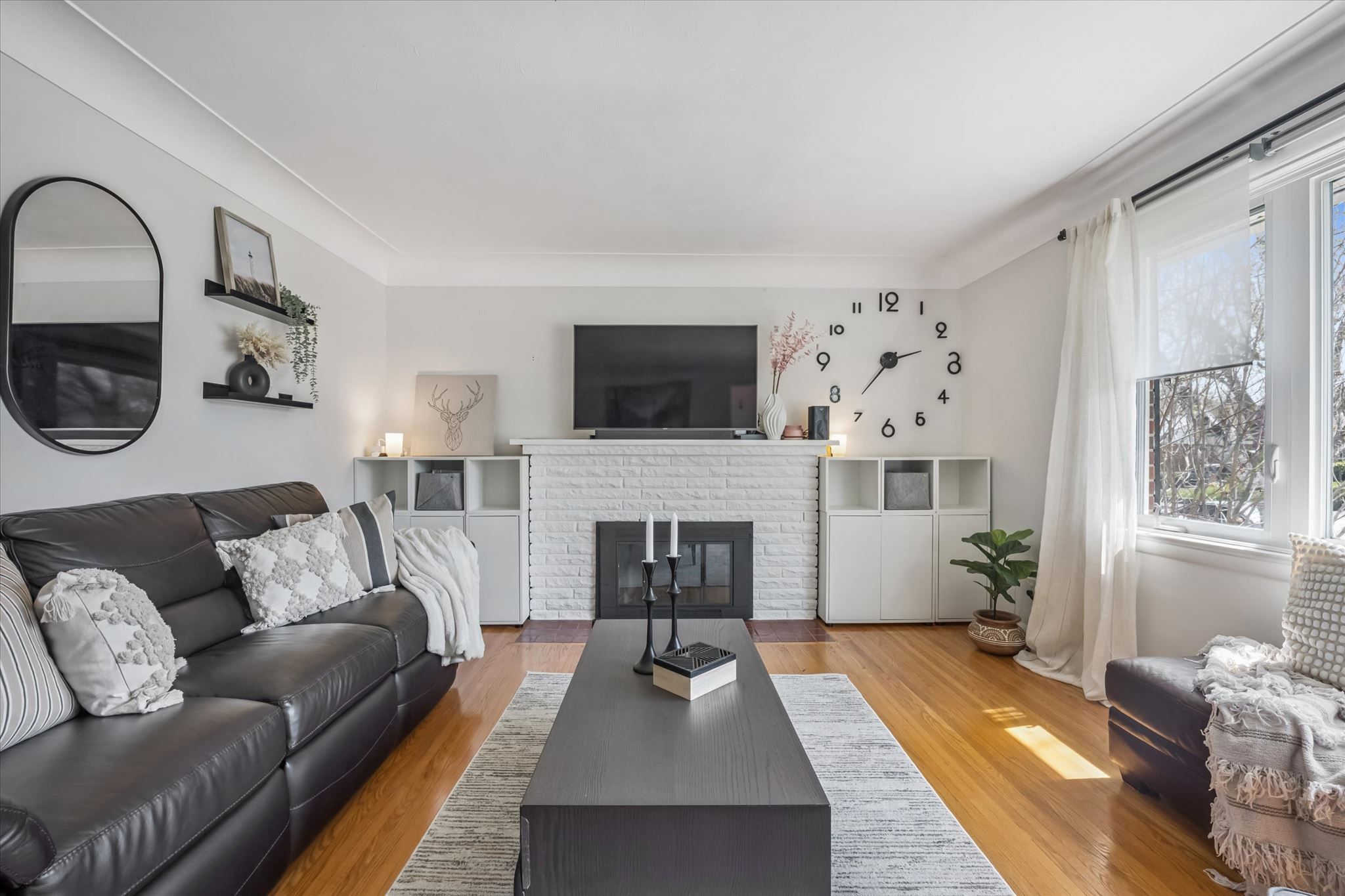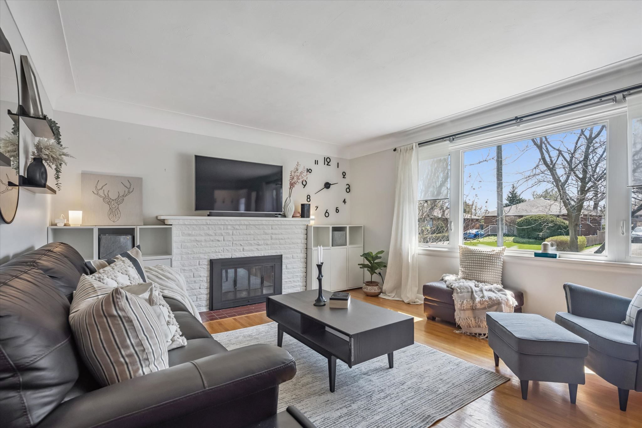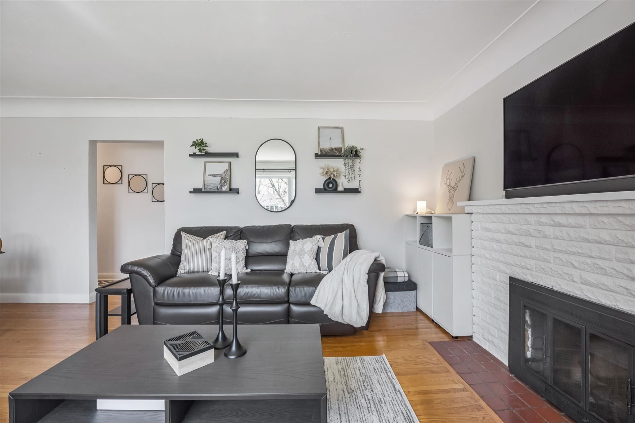 • Carpet-free layout features open-concept living and cozy fireplace.
