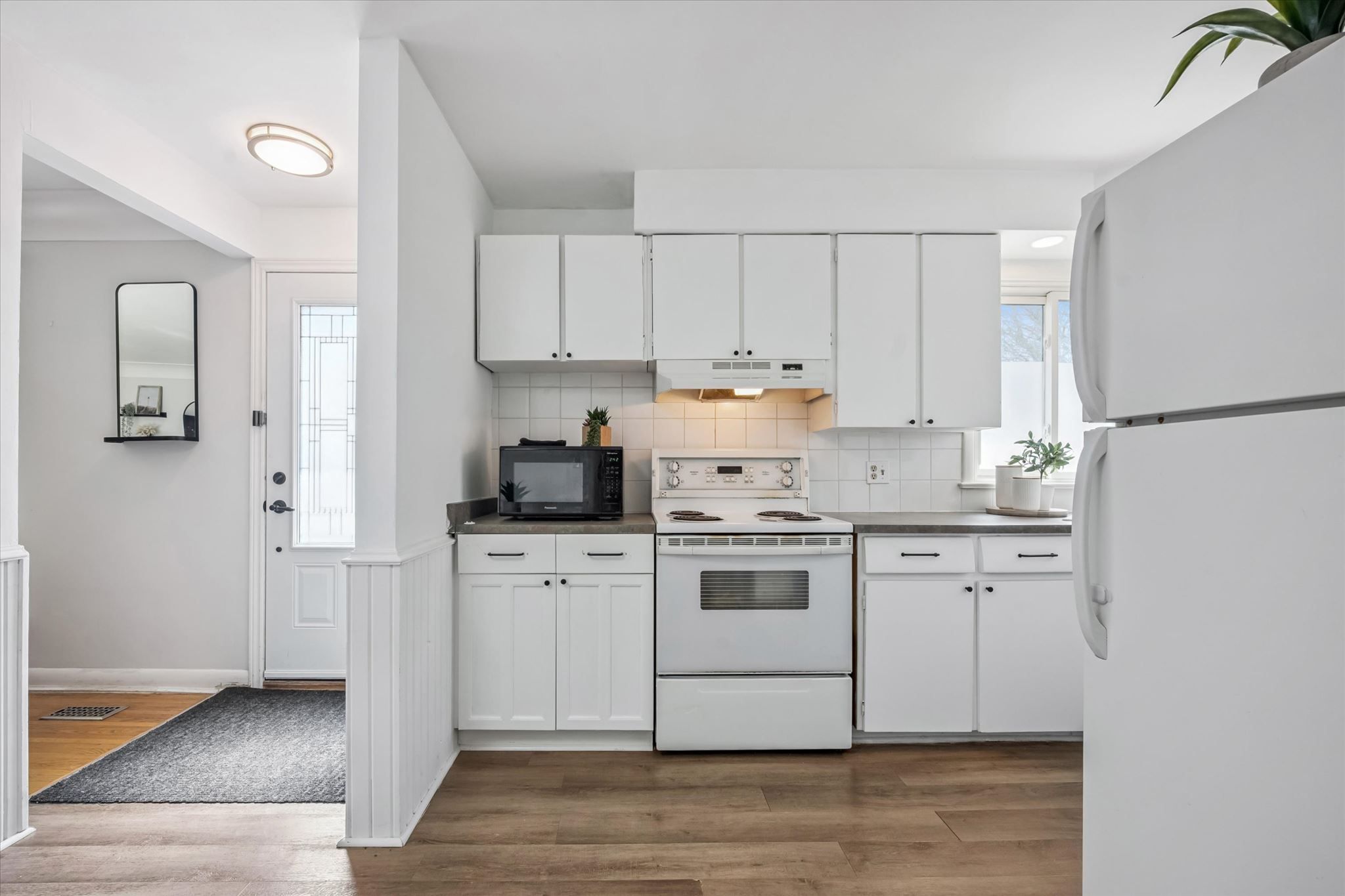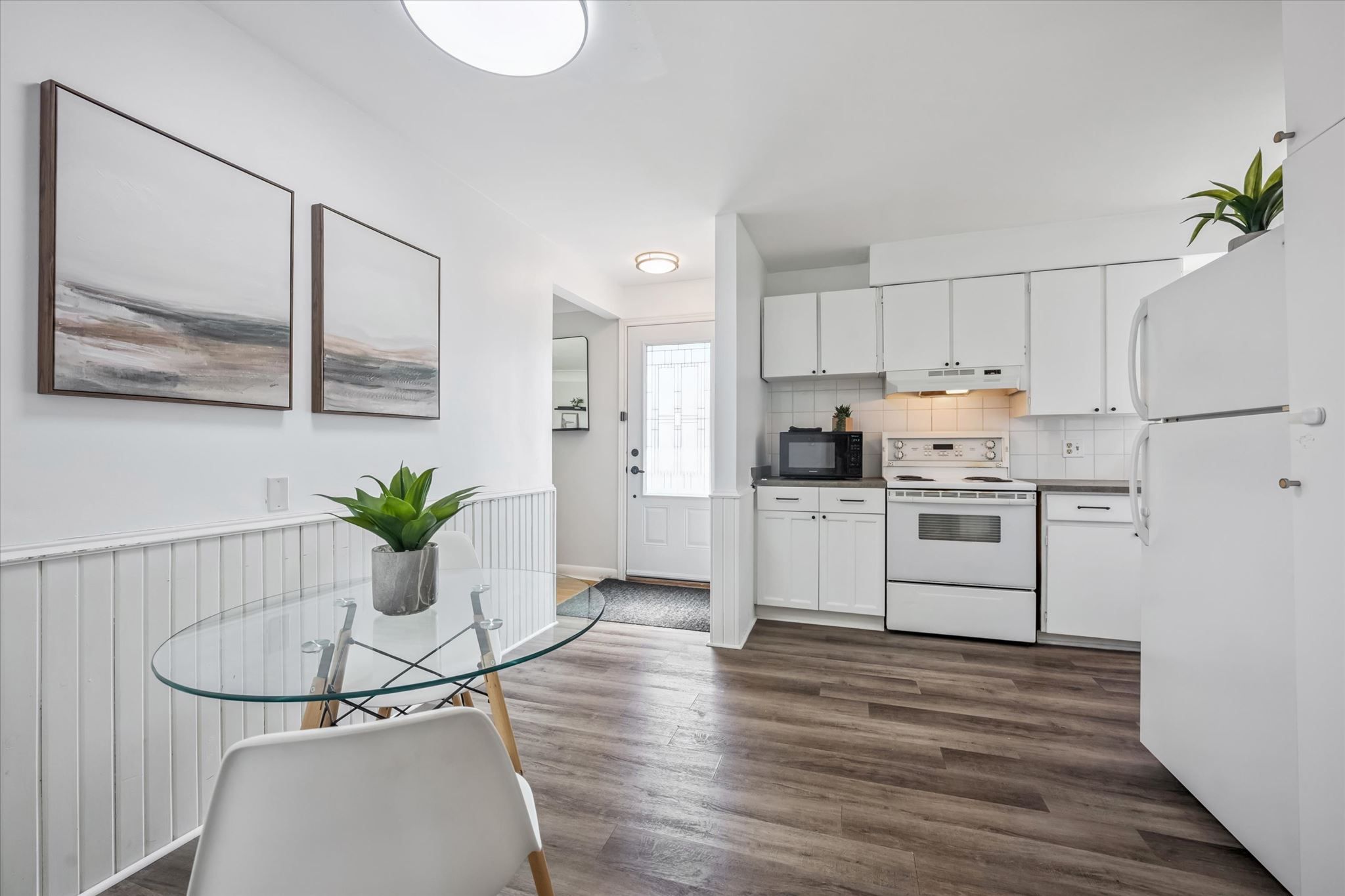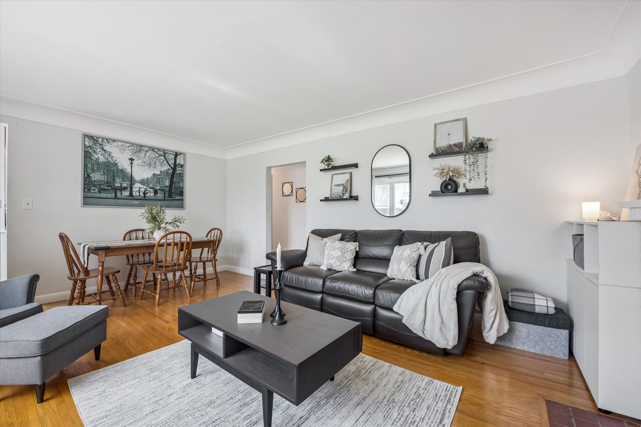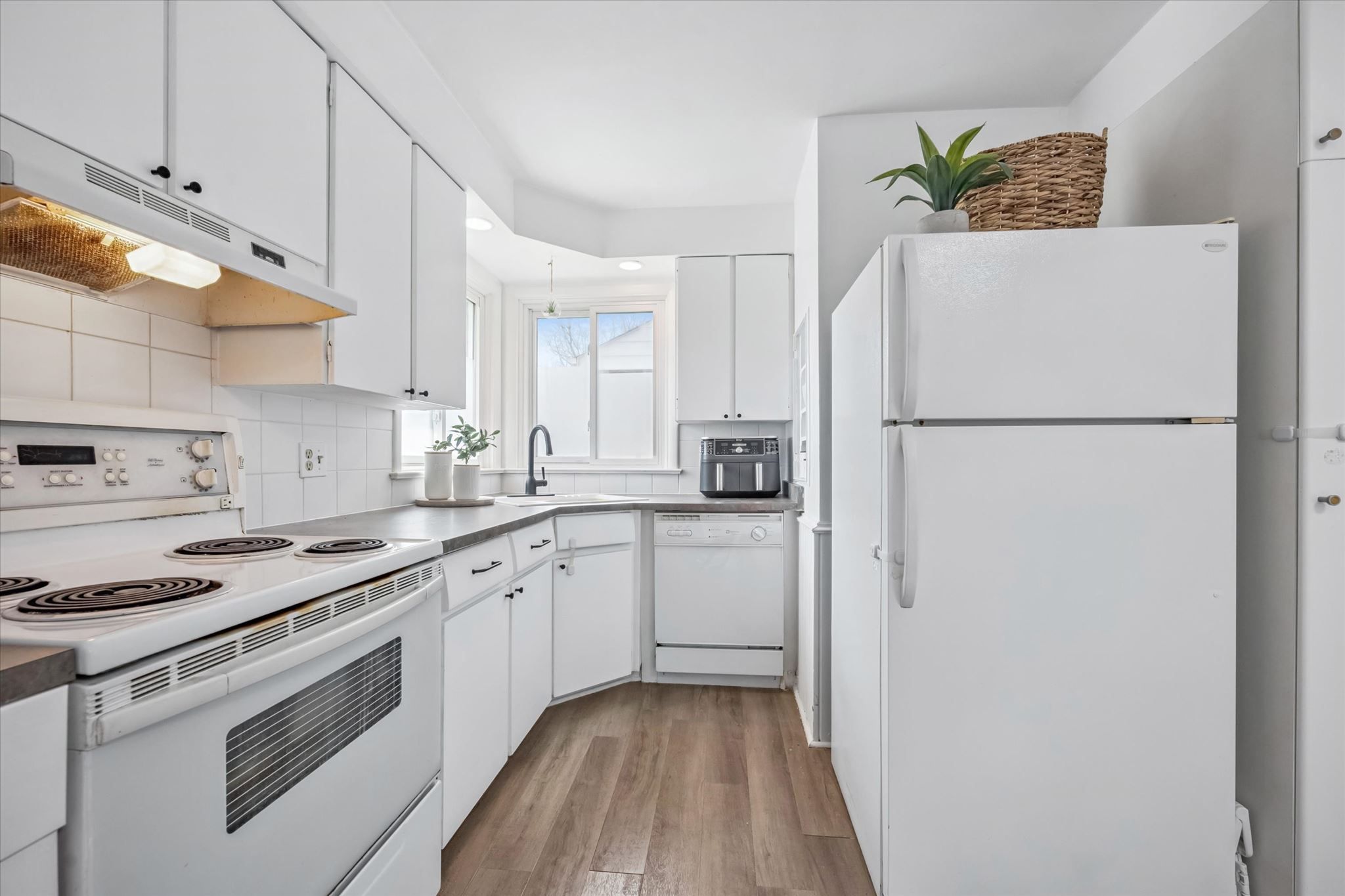 • Carpet-free layout features open-concept living and cozy fireplace.