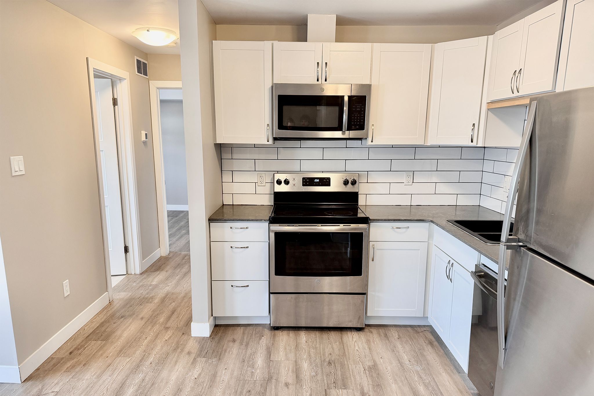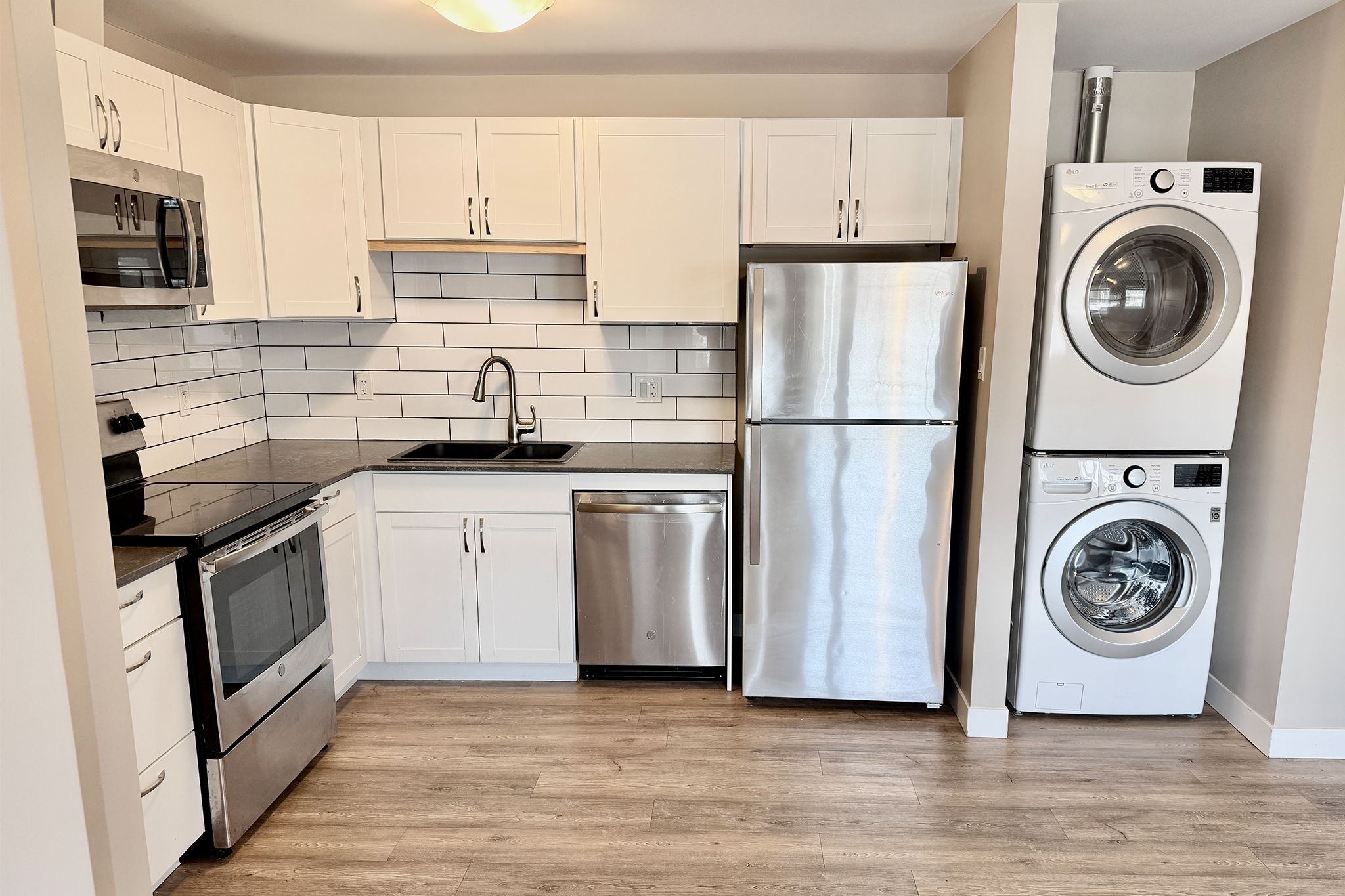 • Contemporary kitchen with stainless steel appliances and ample storage.