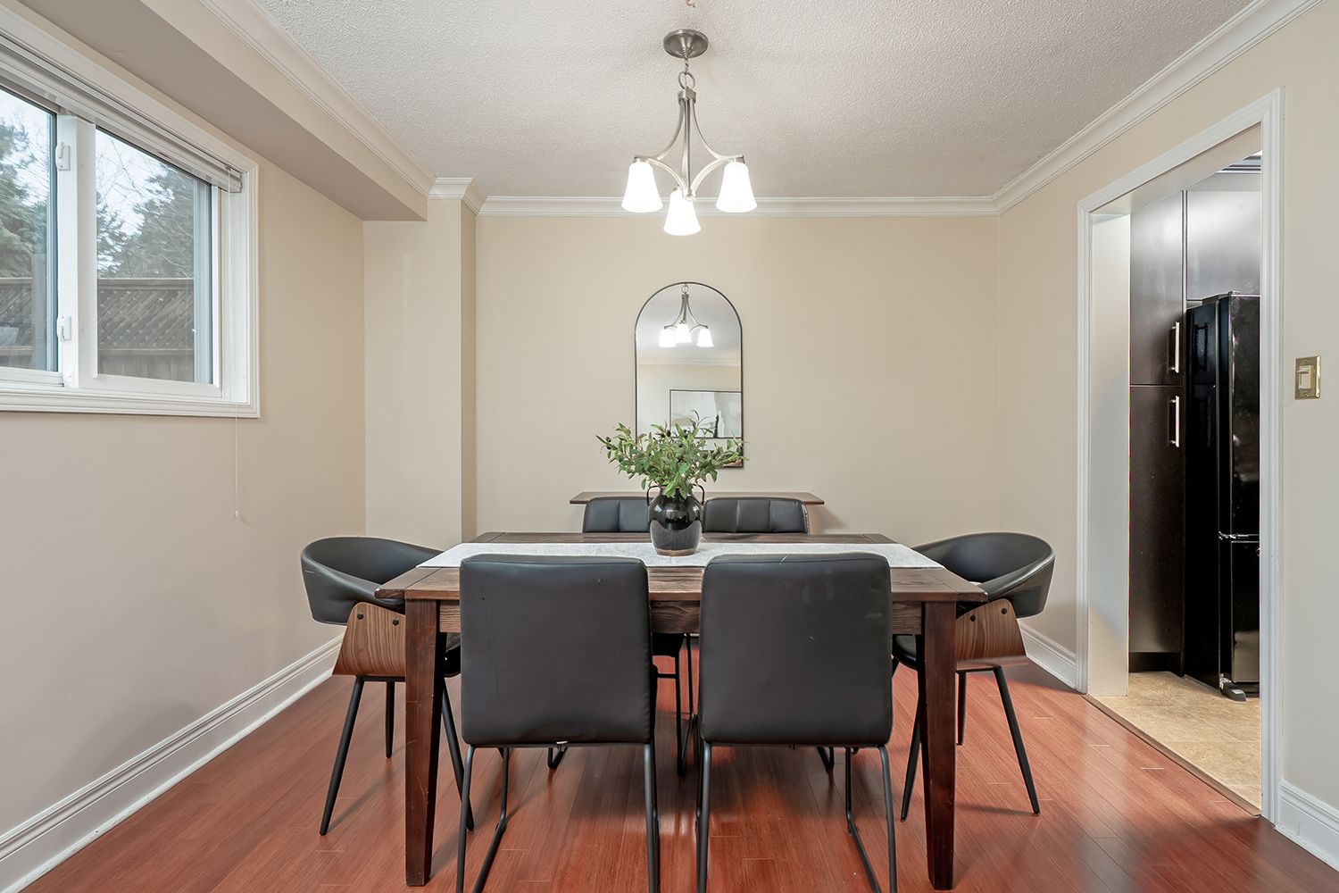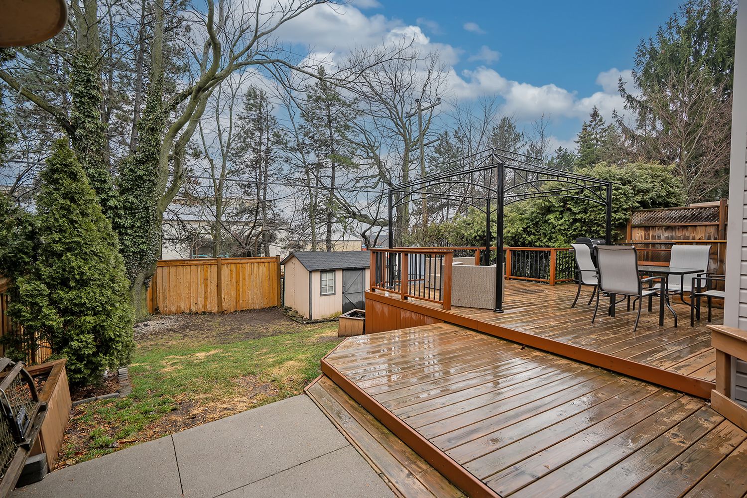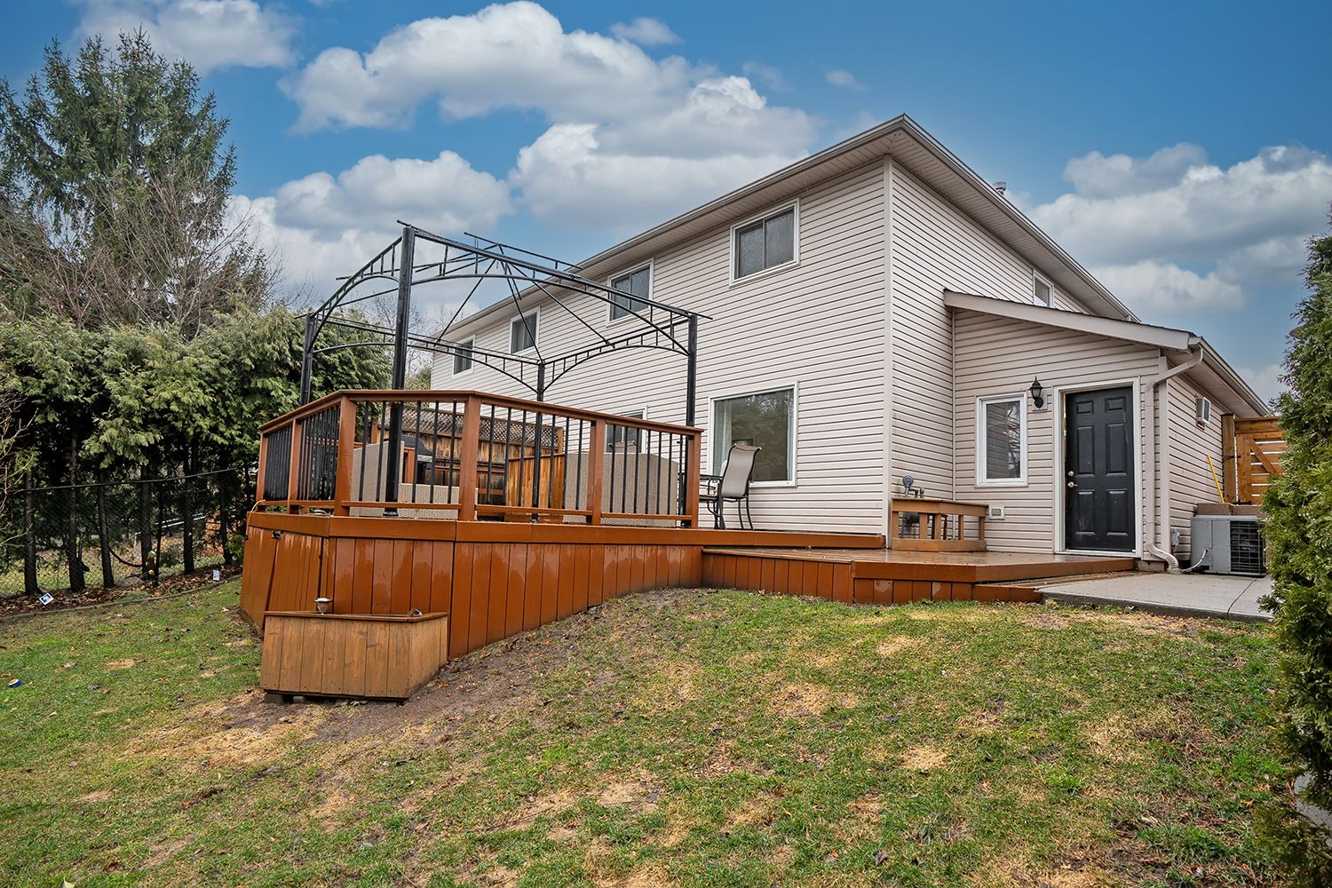 Welcome to this 3+1 bedroom, 1. 5 bathroom semi-detached home offering approximately 1855 sq ft of living space on a deep 25. 36 x 131. 21 ft lot in a family-friendly neighborhood. The eat-in kitchen is equipped with cabinetry with crown moulding and under-cabinet lighting, a custom backsplash, stainless steel double sink, black appliances, plus california style shutters. The living and dining room features wood-look flooring, crown moulding, and a large picture window creating a comfortable space for everyday living and entertaining. A small side addition with separate entrance provides flexible space ideal for a home gym, studio or additional storage. Upstairs, the spacious primary bedroom (previously two bedrooms) features two closets and could easily be converted back if desired. Two additional bedrooms offer double closets and updated light fixtures. The main bath includes a soaker tub with shower and a vanity with stone countertop. The finished lower level offers additional living space with a potential guest room or playroom, laundry area and ample storage. Enjoy the fully fenced backyard with mature trees, a large deck (2019) with gazebo, grassy area and a shed, perfect for relaxing or entertaining. Conveniently located close to schools, parks, amenities and with easy access to the qew, 403 and 407.
