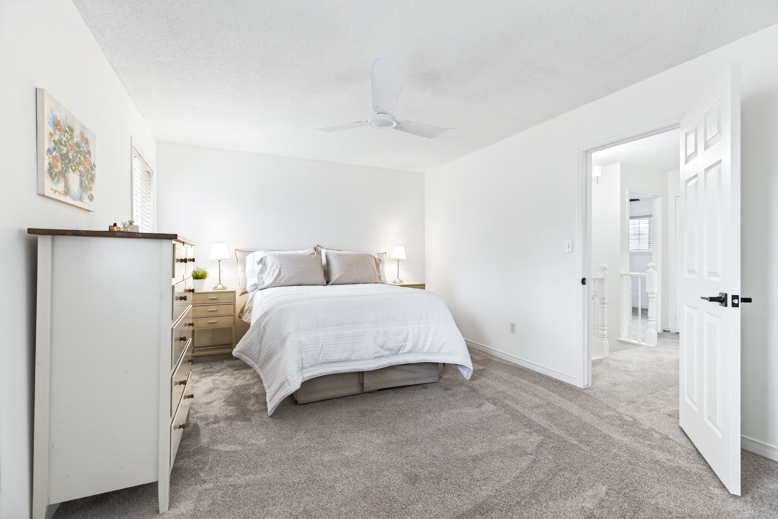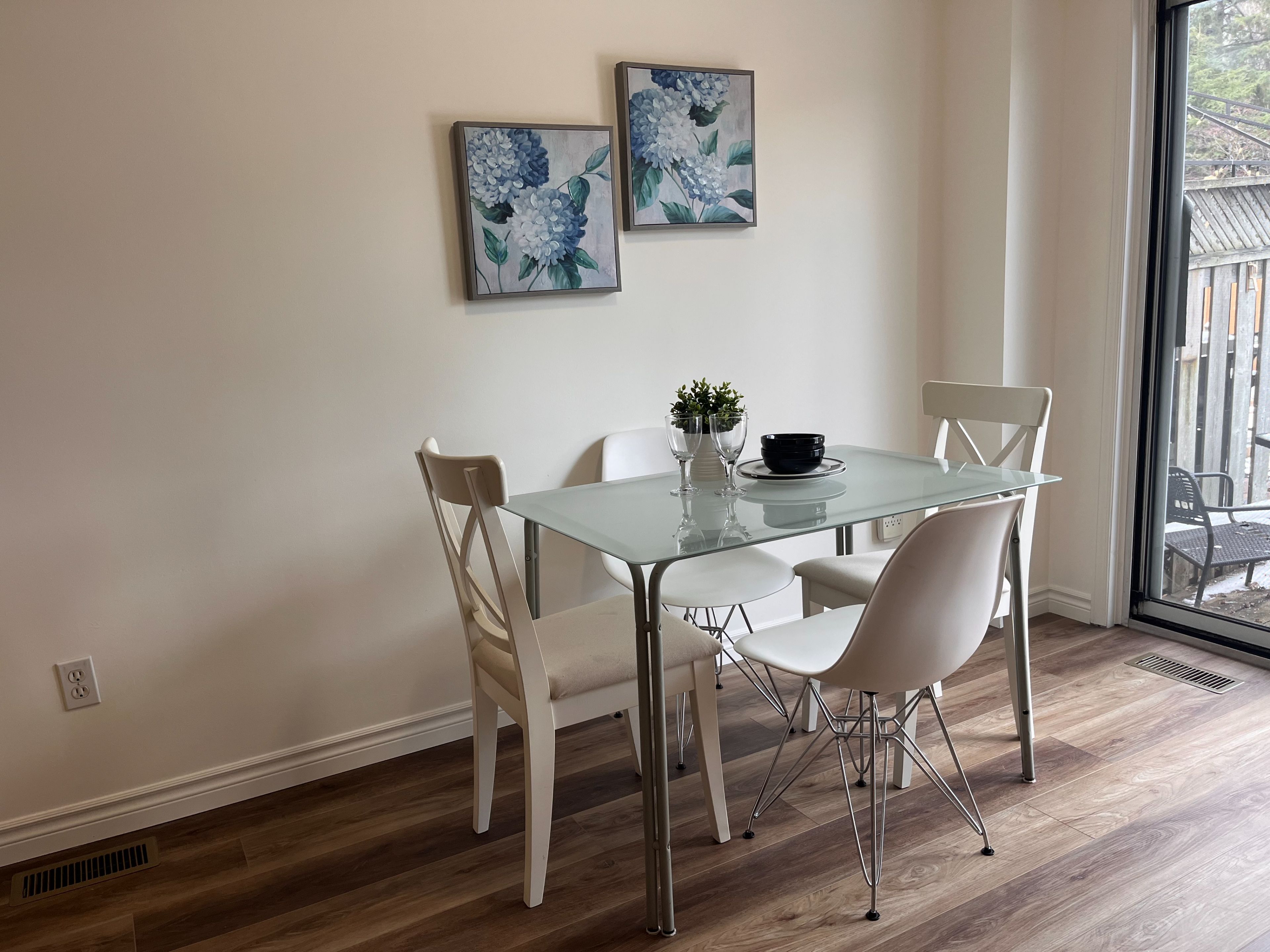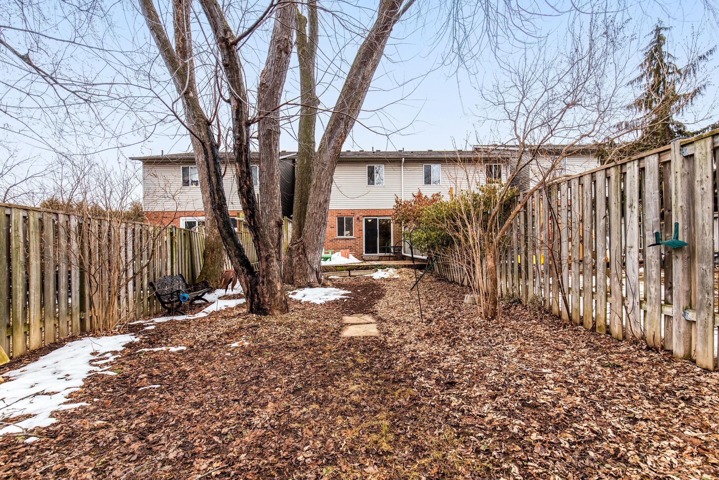 Welcome home. This beautifully maintained freehold townhouse in a family-friendly area invites you to experience a sense of flow. Notice the fresh paint and new luxury vinyl plank flooring as you move from the spacious foyer into the light-filled living and dining areas-perfect for entertaining. Discover the ease of the extended kitchen, offering ample prep and cupboard space for your daily life. Upstairs, feel the comfort of plush new carpeting and spacious landing. The primary bedroom features double closets and natural light, while the fully renovated washroom showcases premium finishes and a large vanity. With two more spacious bedrooms, there's room to grow. The basement offers extra living space with a 3-piece rough-in, ready for your finishing touches. Step outside to a lovely deck overlooking a deep, 150-ft treed lot. The fenced backyard provides exceptional privacy for children and pets. Complete with direct access to the garden through the attached garage and providing a total of 3 parking spaces. You're ideally located near schools, parks, shopping, and qew. With too many updates to list here (updates list provided upon request) this is a rare opportunity to secure a move-in ready home in a location that feels exactly right.