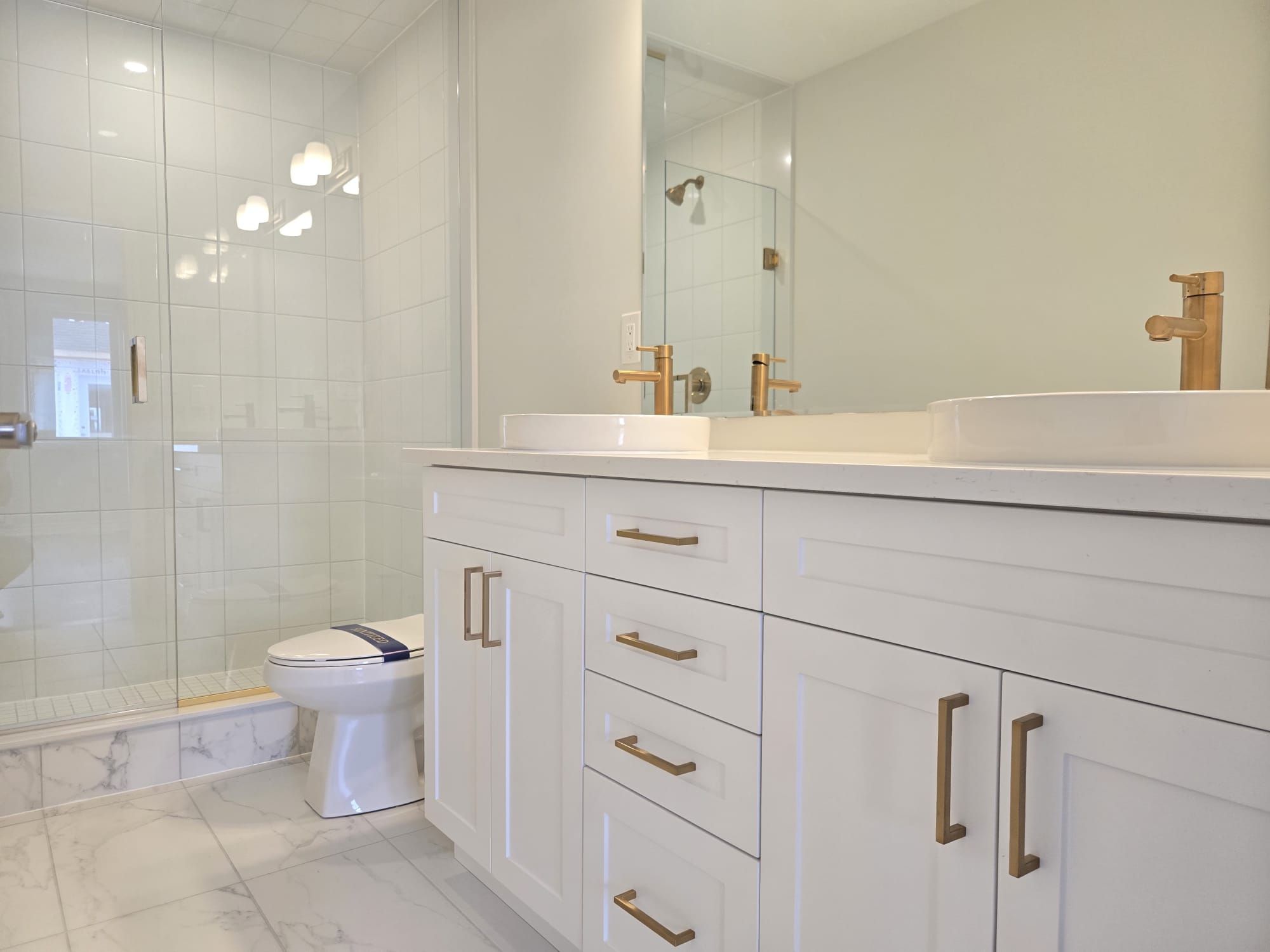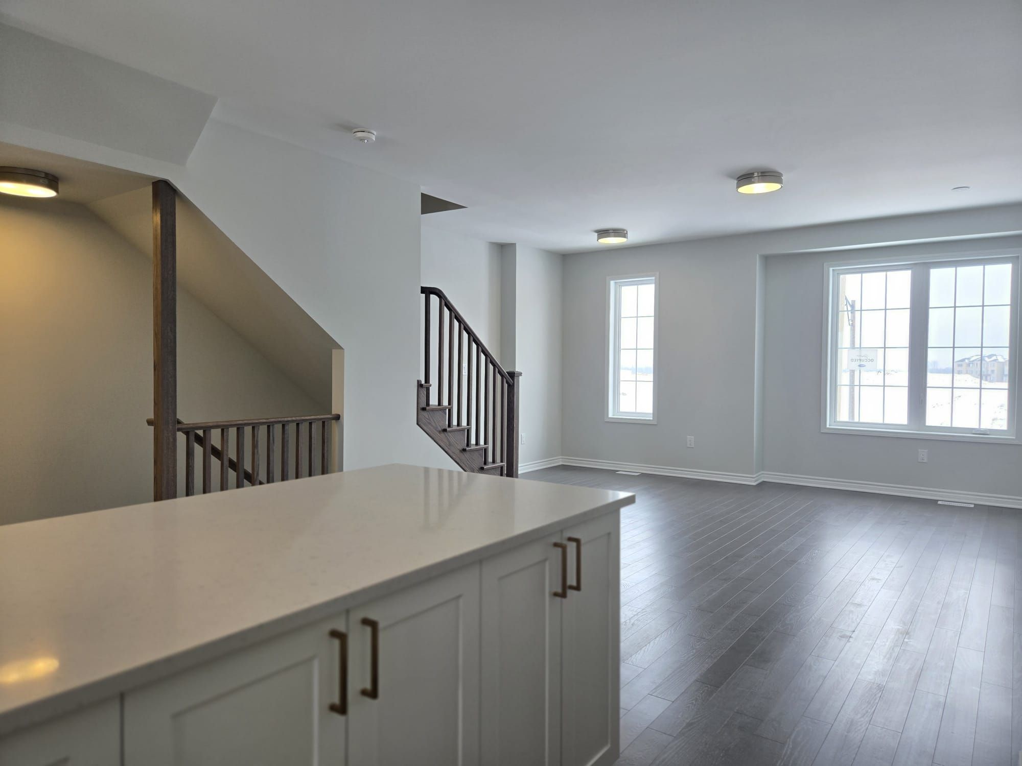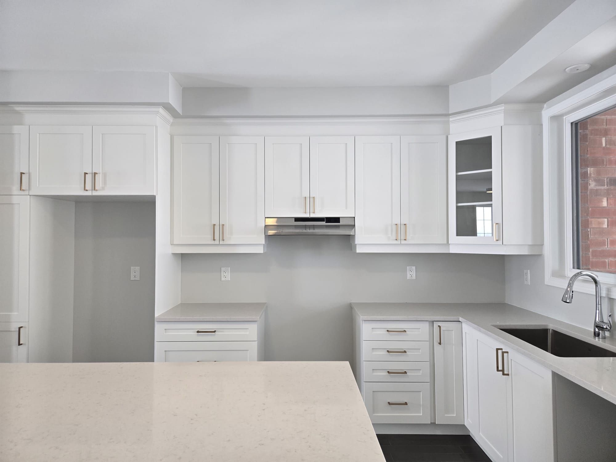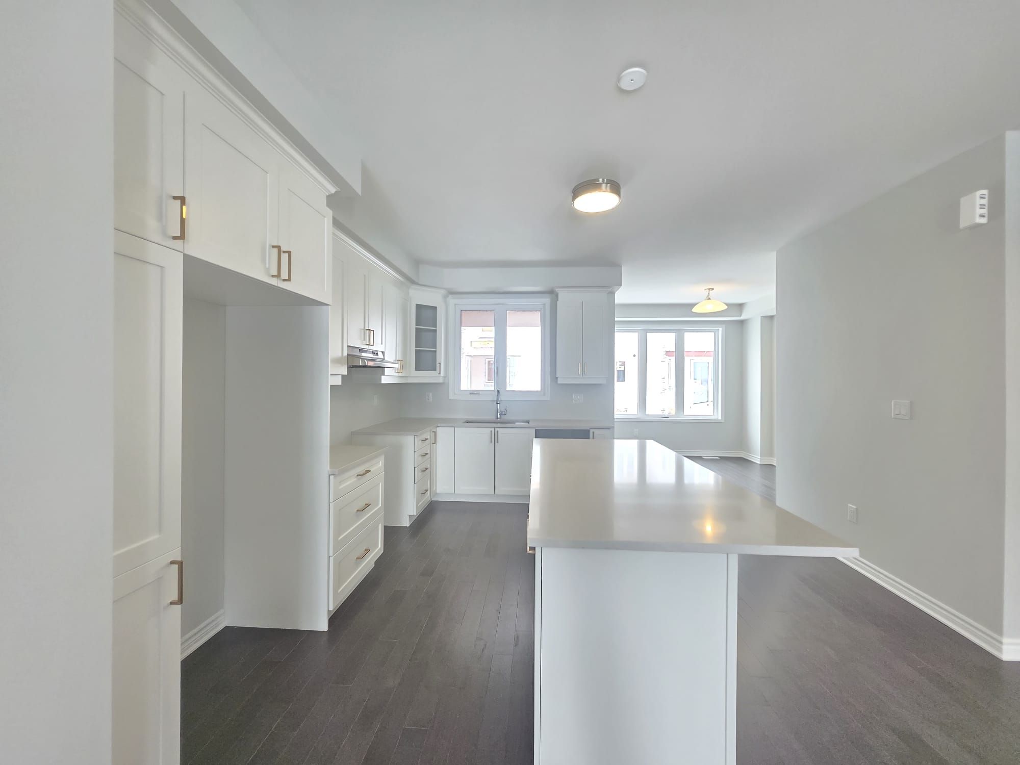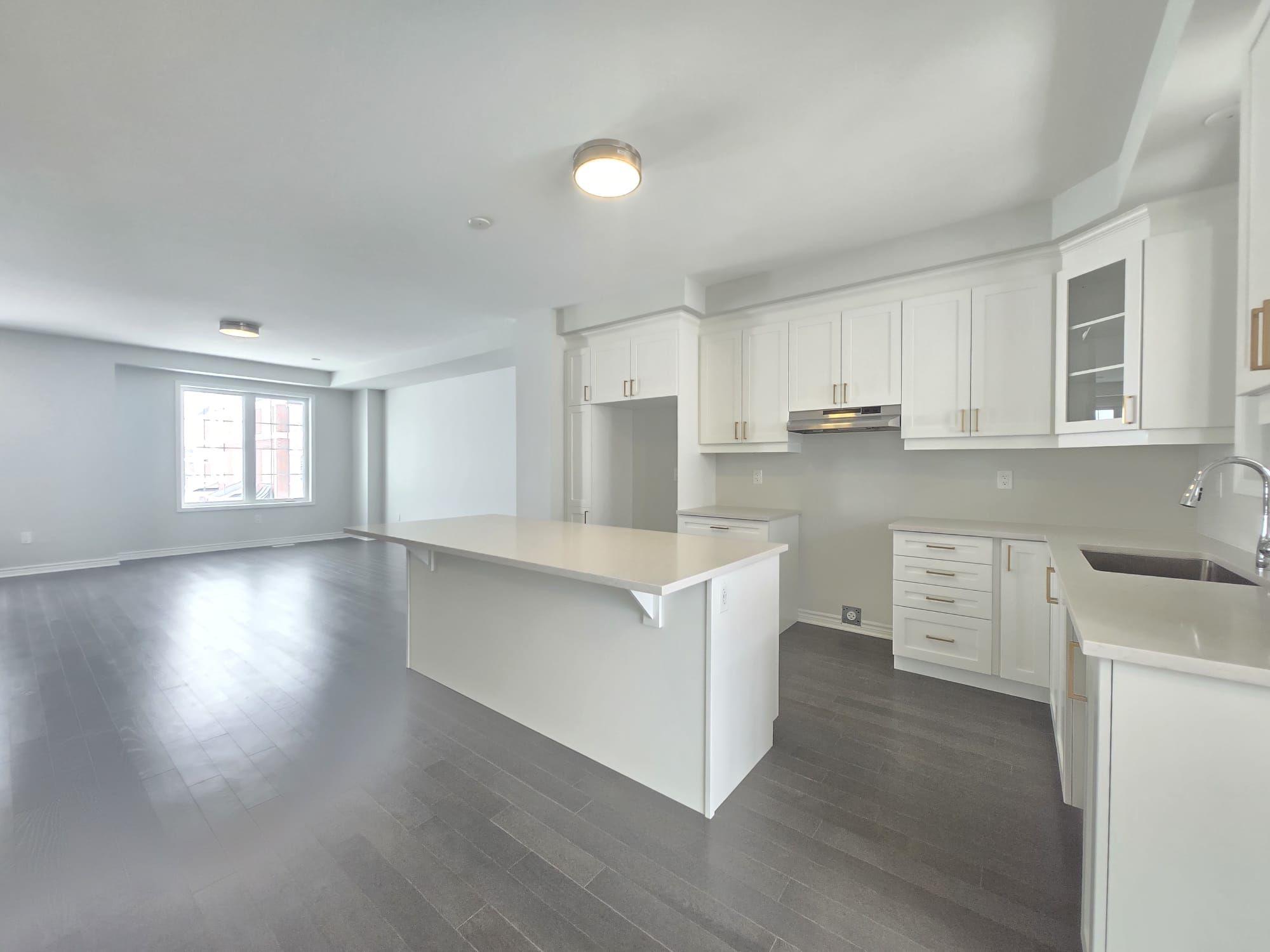 • Modern kitchen with quartz countertops and breakfast bar.