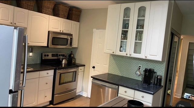 • Large renovated kitchen with custom glass backsplash and stone countertops.