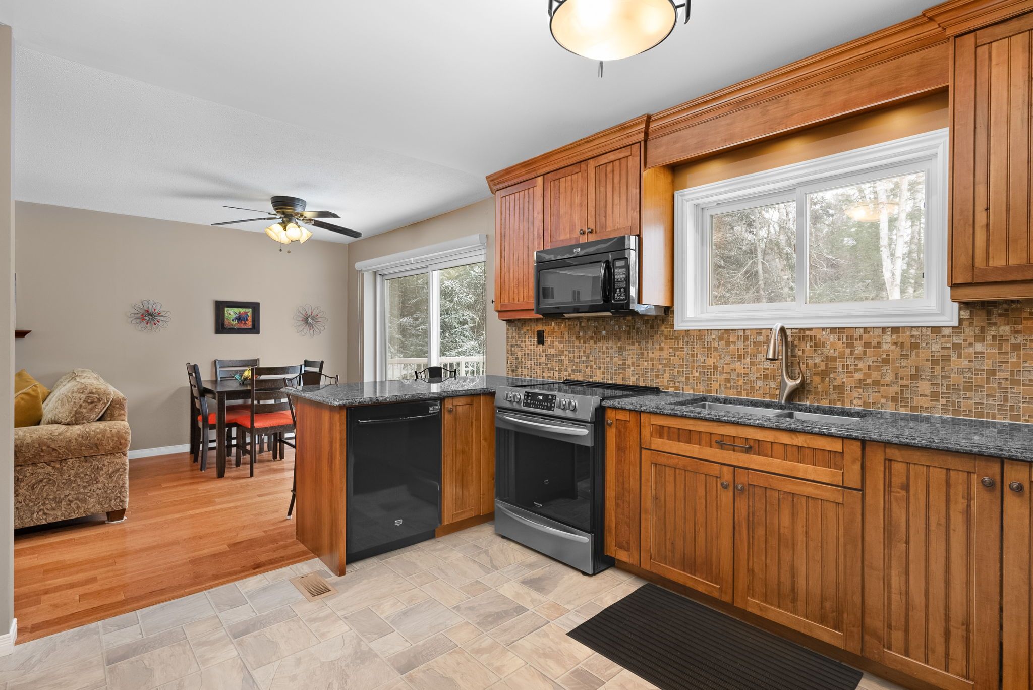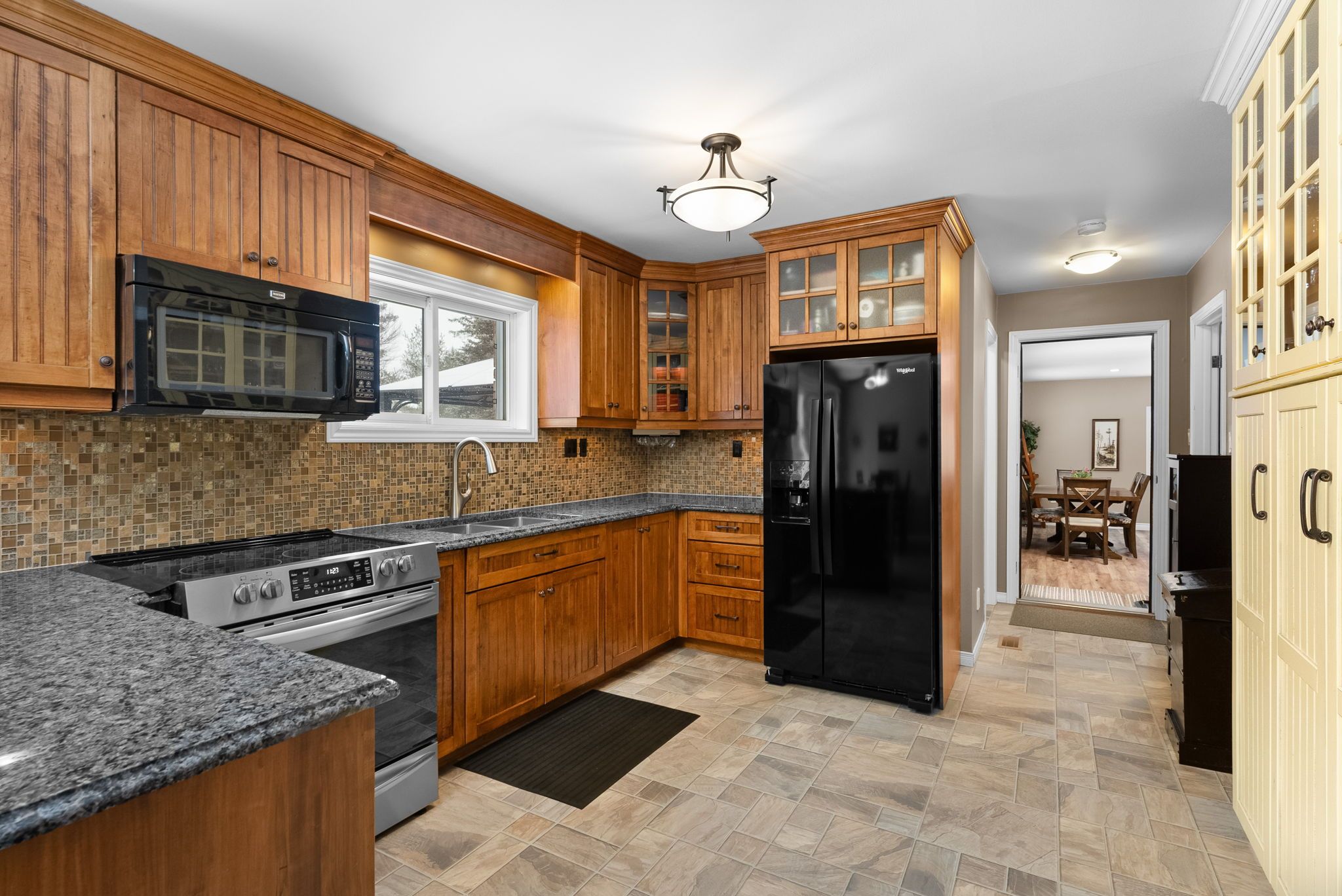 • Custom kitchen features solid wood cabinetry and high-end appliances.