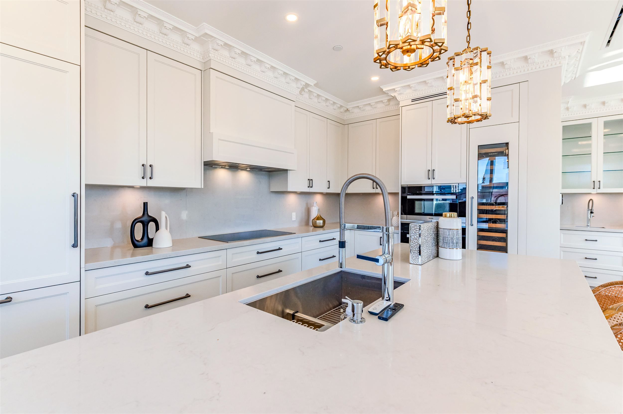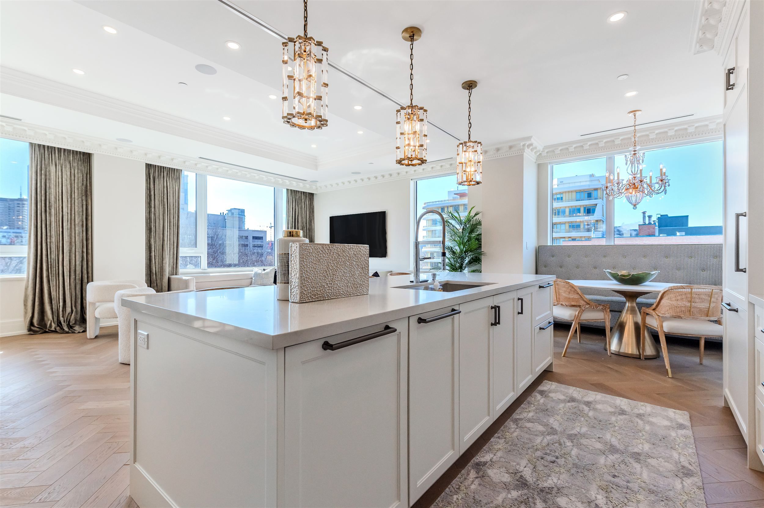 • Unique finishes including herringbone flooring and custom lighting fixtures.