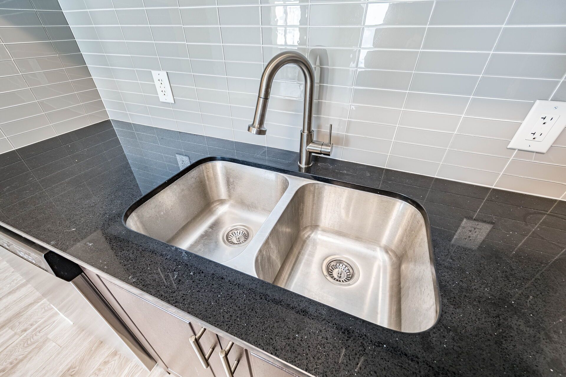 • Modern kitchen with quartz countertops and stainless steel appliances.