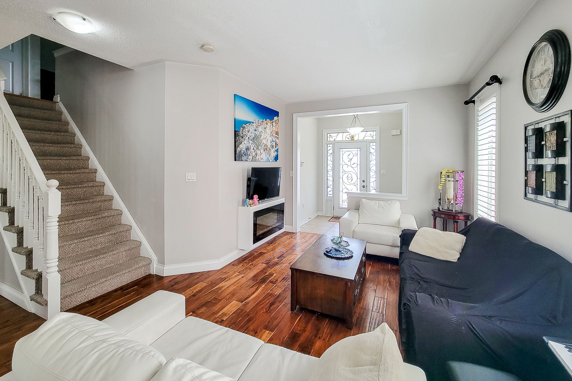 • Main floor is carpet-free with a cozy electric fireplace.