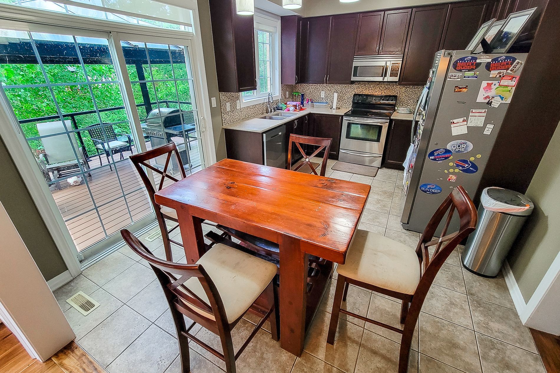 • Bright eat-in kitchen with stainless steel appliances and deck access.