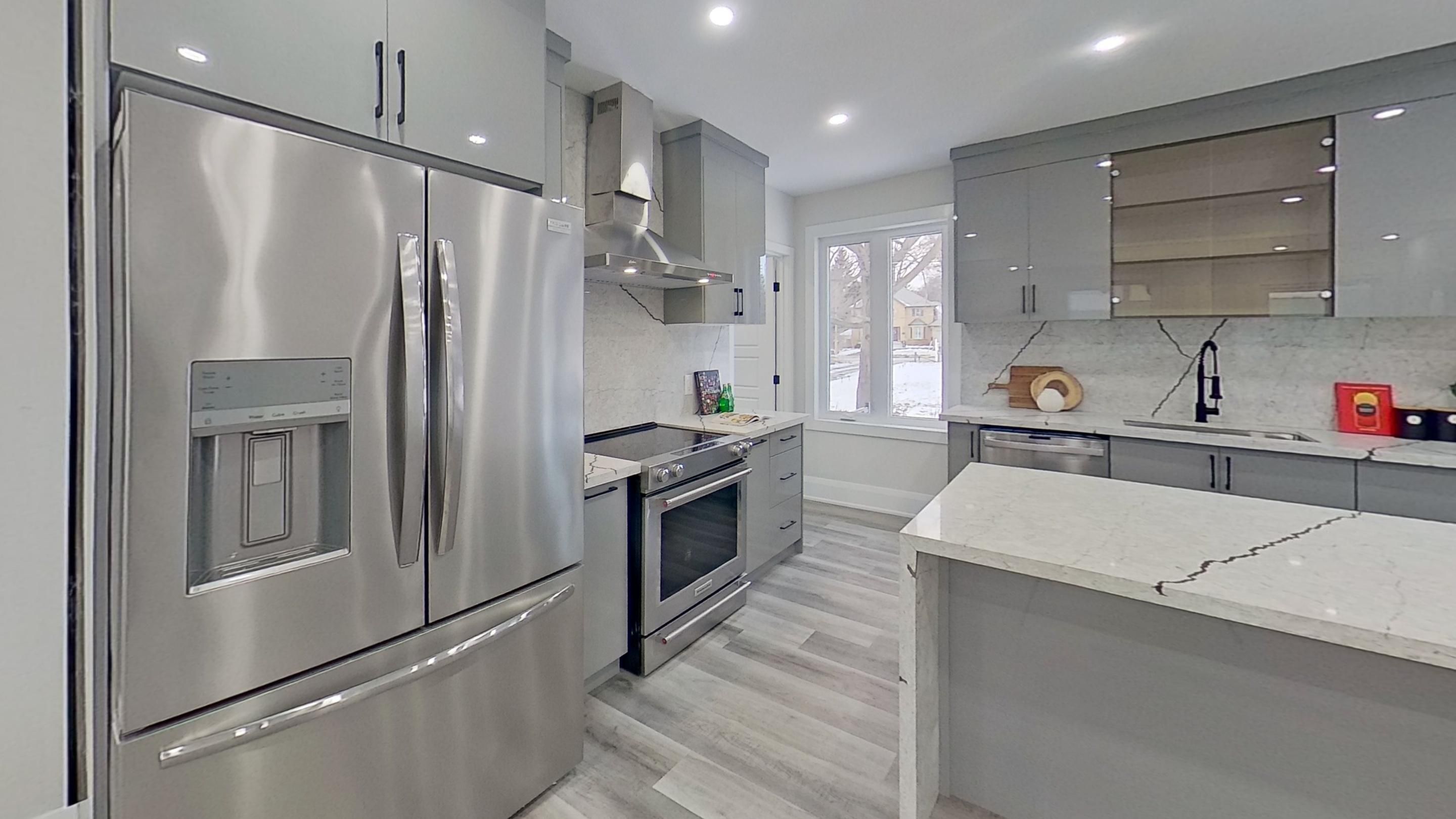 • Designer kitchen equipped with stainless steel appliances for cooking enthusiasts.