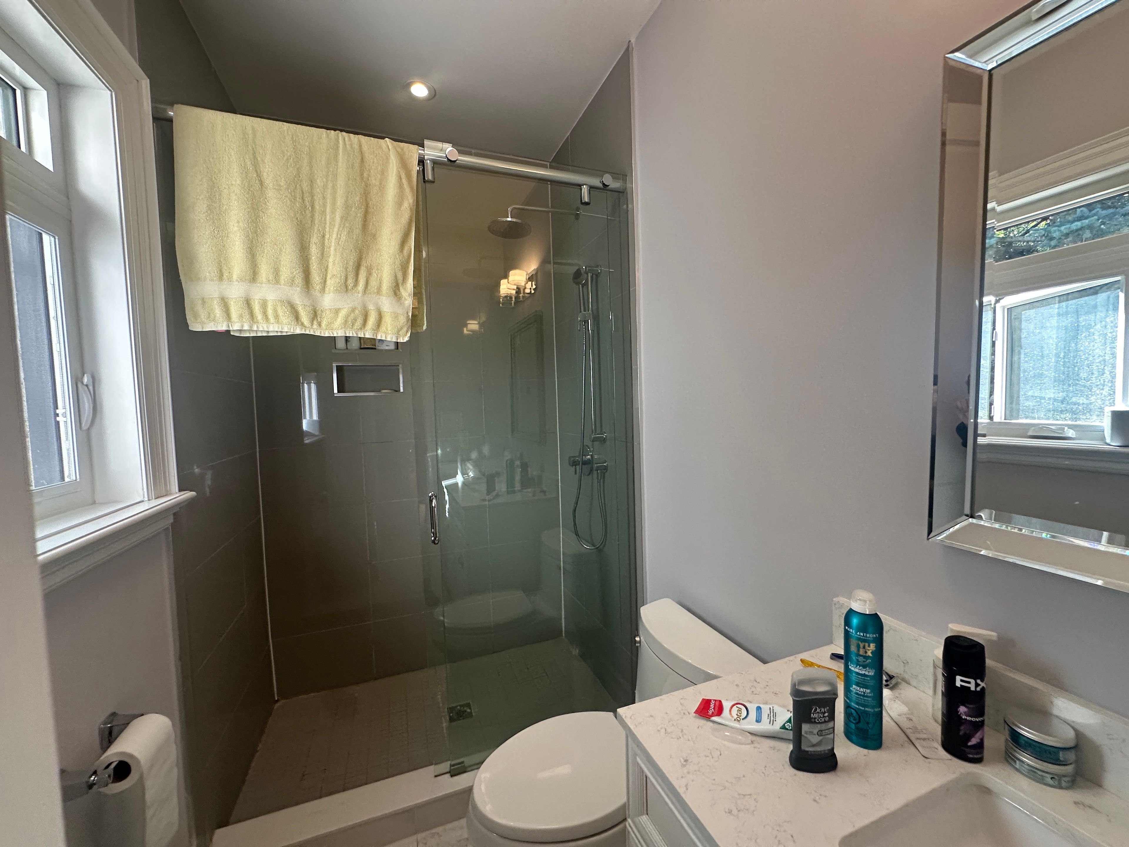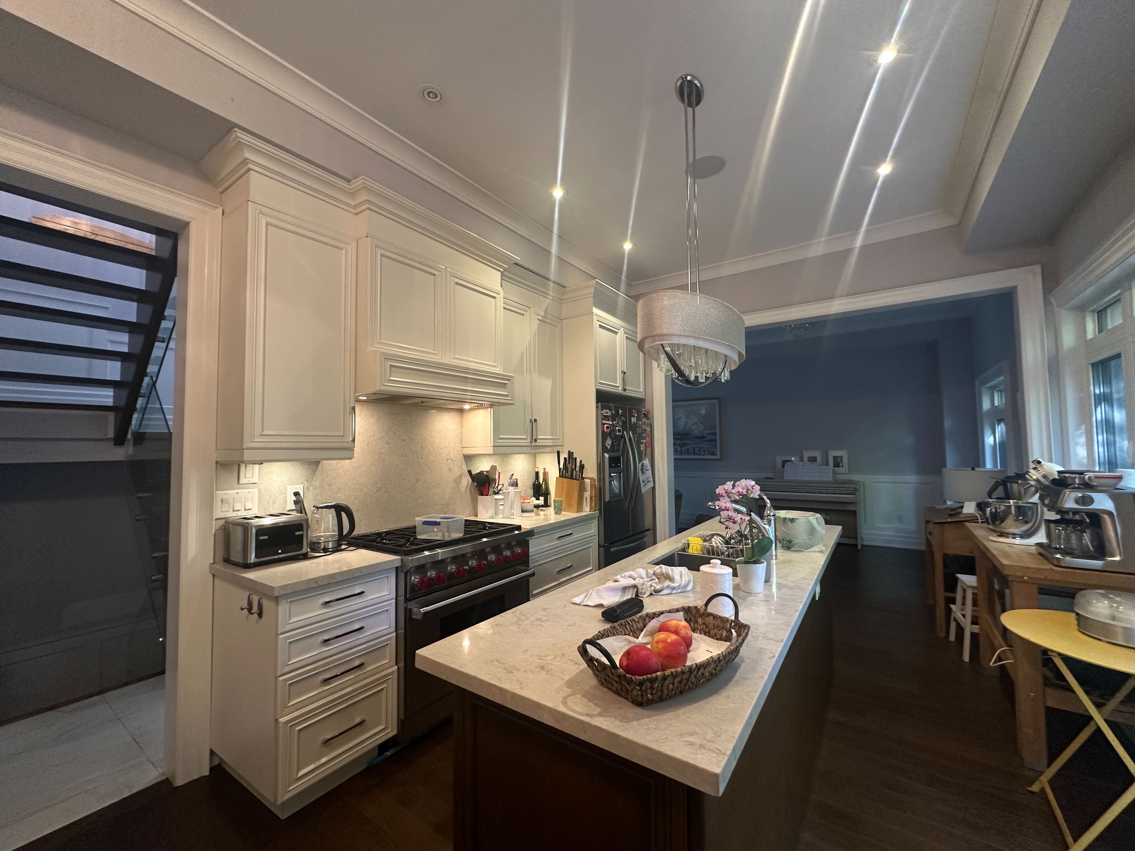 • Sleek open-concept kitchen with stylish Caesarstone countertops and walkout deck.