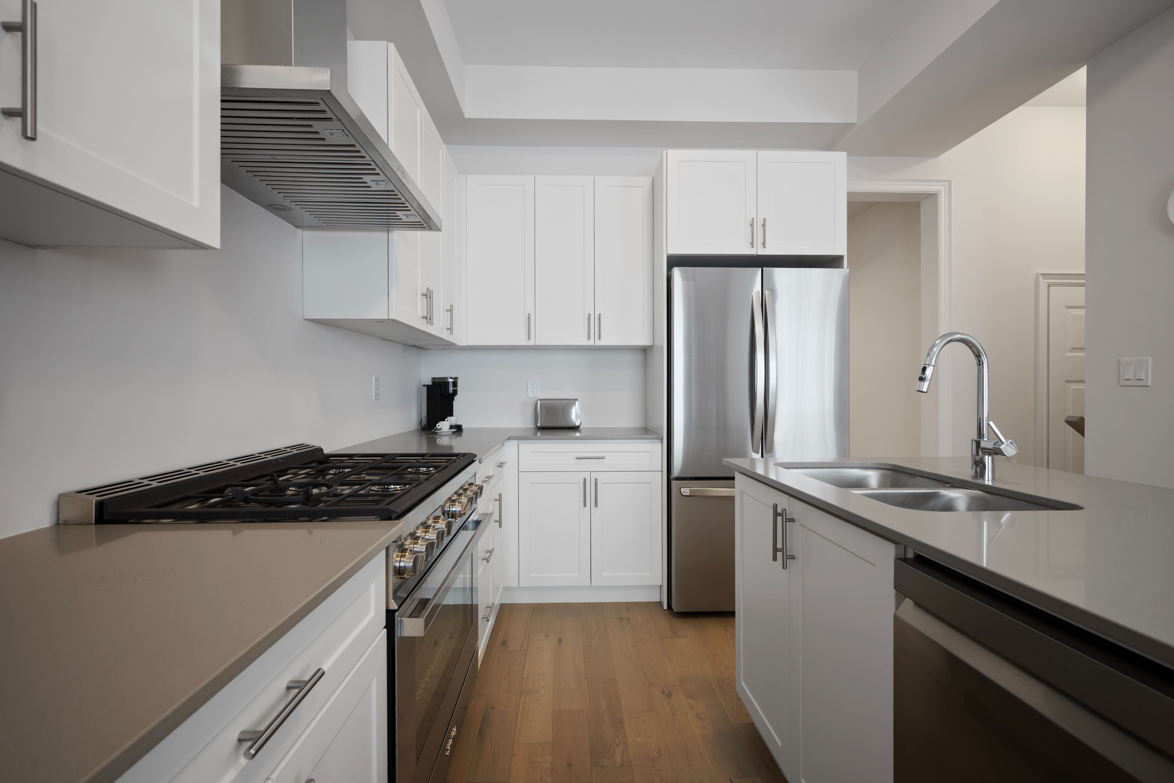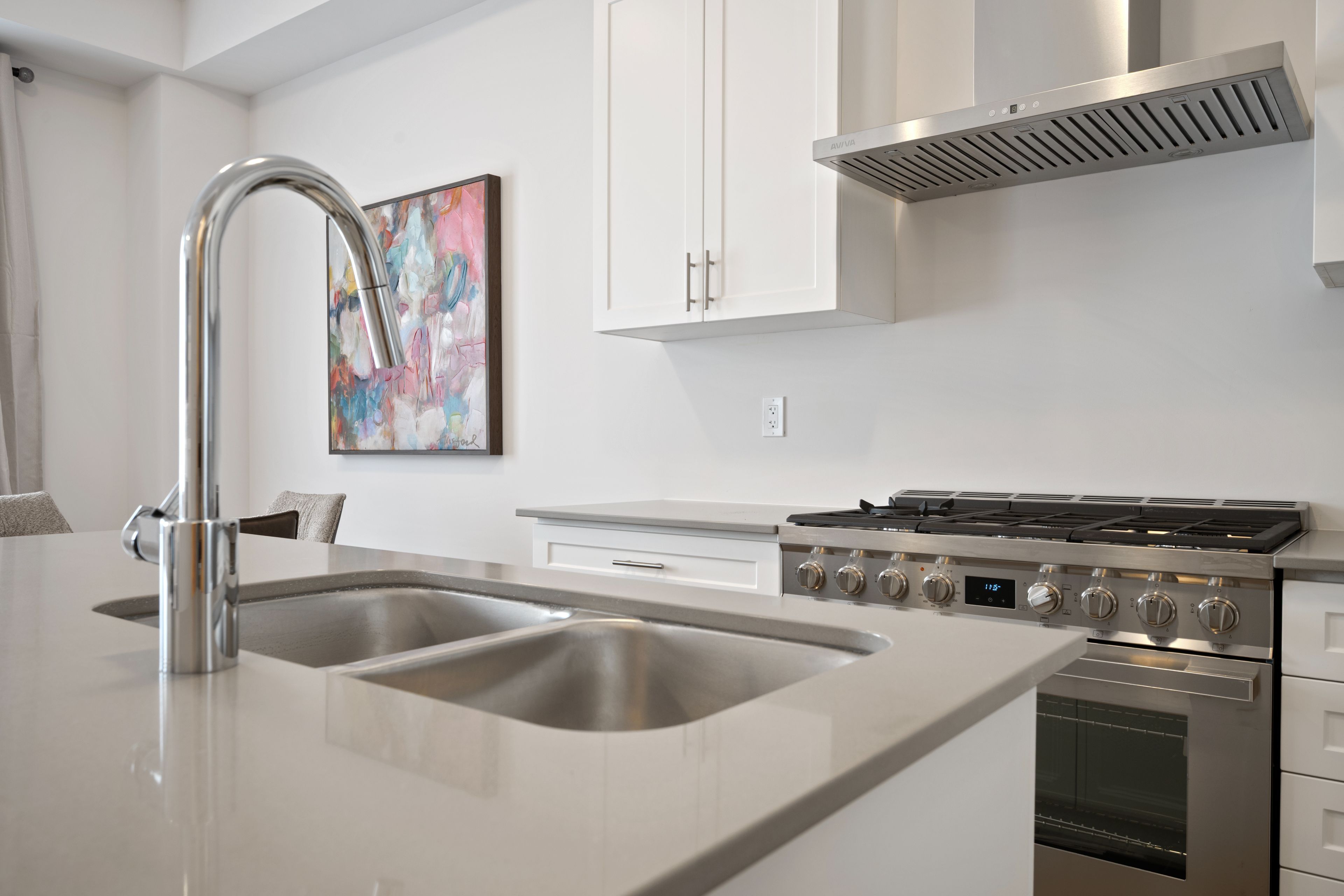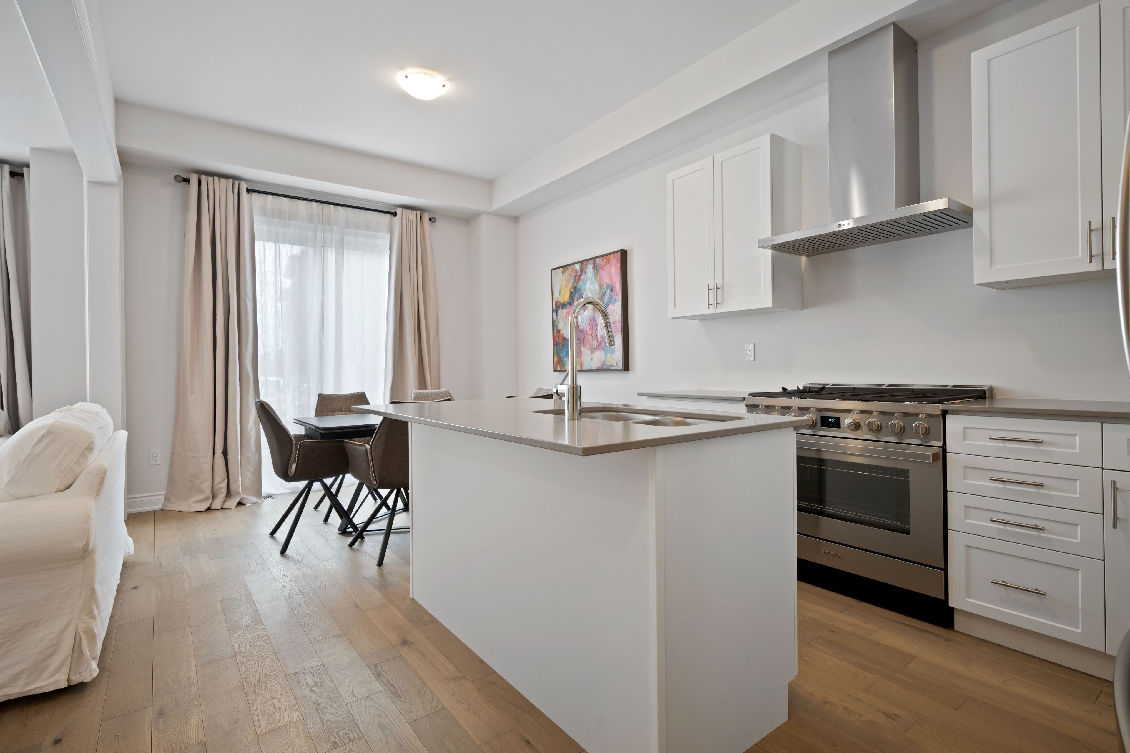 • Bright gourmet kitchen with gas stove and breakfast bar island.