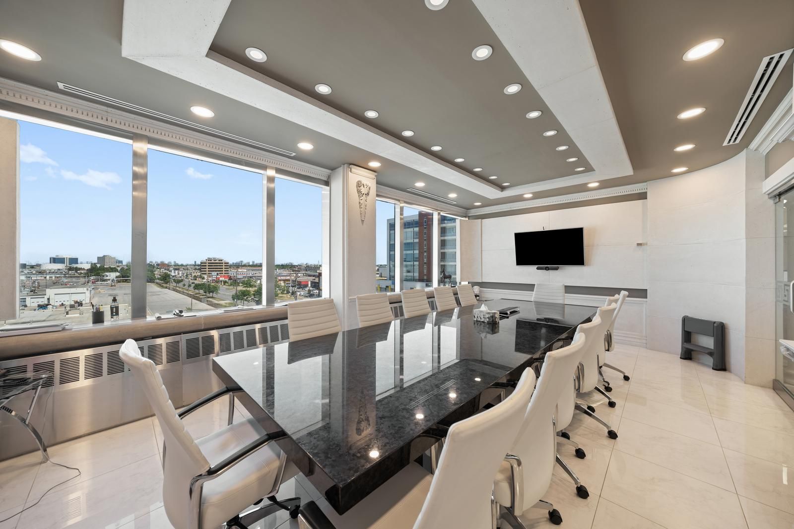 • Includes a glass-enclosed boardroom and several modern workstations.