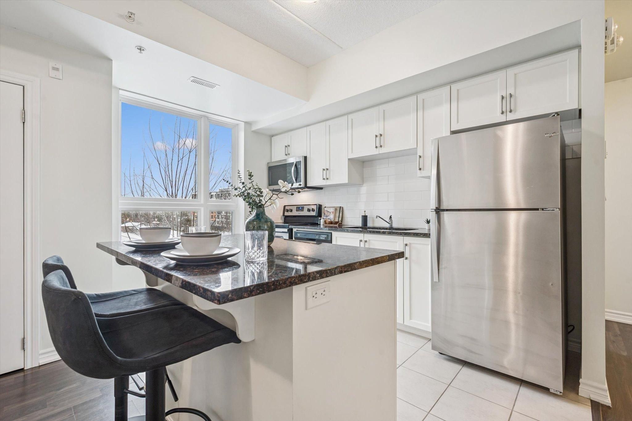 210-1280 gordon st is a modern 3-bdrm condo w/beautiful treed views located in a newer professionally managed building in guelph's highly sought-after south end! Steps from bus stop w/direct access to uofg & downtown, this property is exceptionally well-positioned for investors & parents buying for university-bound students. Instead of paying rent this is an opportunity to build equity in a tangible asset while benefiting from consistent student & professional rental demand. With current market conditions offering more favourable pricing, this unit presents a timely chance to secure a well-located investment w/long-term upside. Inside the open-concept living space seamlessly connects the living, dining & kitchen areas creating a welcoming & versatile environment suited to everyday living & entertaining. 9ft ceilings enhance the sense of space while large windows & sliding glass door flood space w/natural light & frame a peaceful treed backdrop that adds privacy & sense of calm rarely found in condo living. Modern kitchen anchors space w/centre island ideal for casual meals, studying & hosting. White cabinetry, stone counters, s/s appliances & backsplash offer timeless low-maint. Finish that appeals to both owners & tenants. Step outside to private balcony that extends living space outdoors & provides quiet place to relax & enjoy overlooking mature trees. 3 bdrms are each finished in neutral palette w/new wide-plank floors creating move-in-ready spaces. Large windows in primary bdrm bring in natural light & tranquil views. Layout is well-suited for maximizing rental income or for young professionals seeking flexibility w/guest room & dedicated office. Bathroom features modern vanity offering ample storage, stone counters & tub/shower. Unit includes 1 parking space w/an assumable mthly rental & locker for storage. Located mins from all amenities pergola commons & stone rd mall have to offer: restaurants, groceries, lcbo & beer store. Easy access to 401 for commuters!