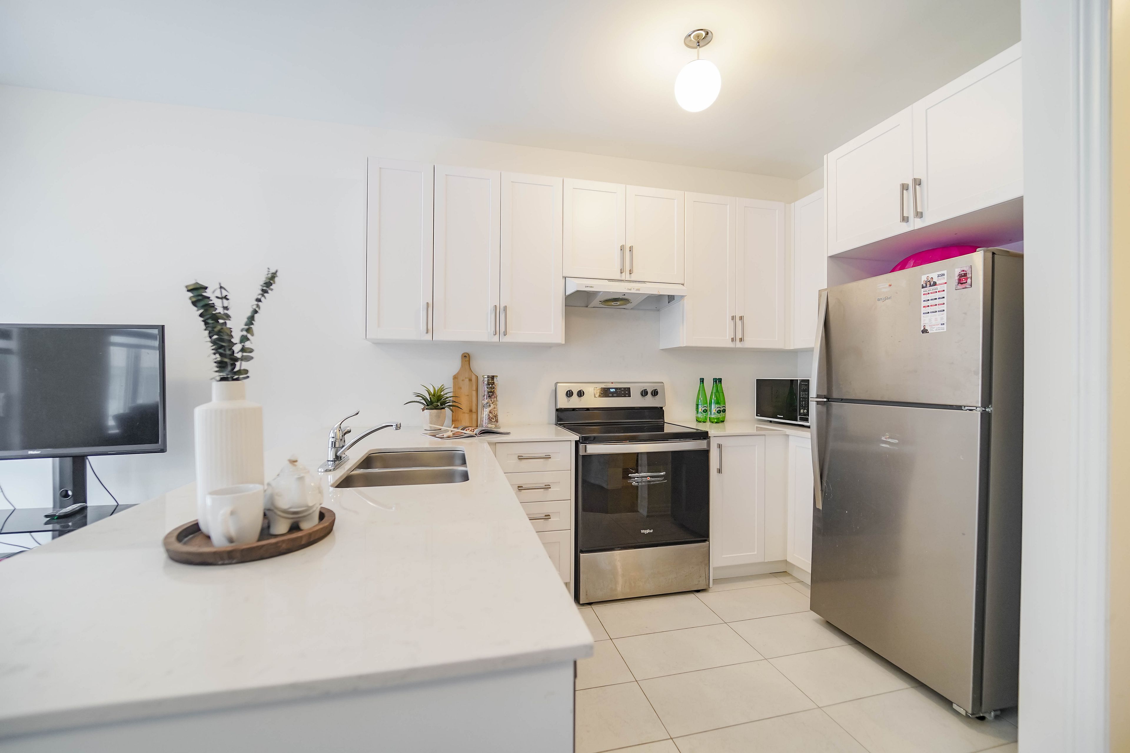 • Modern kitchen with stainless steel appliances and cozy breakfast area.