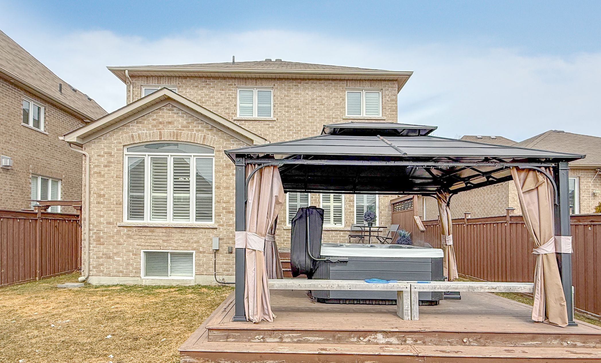 • Large backyard with two-tiered deck, hot tub, and metal pergola.