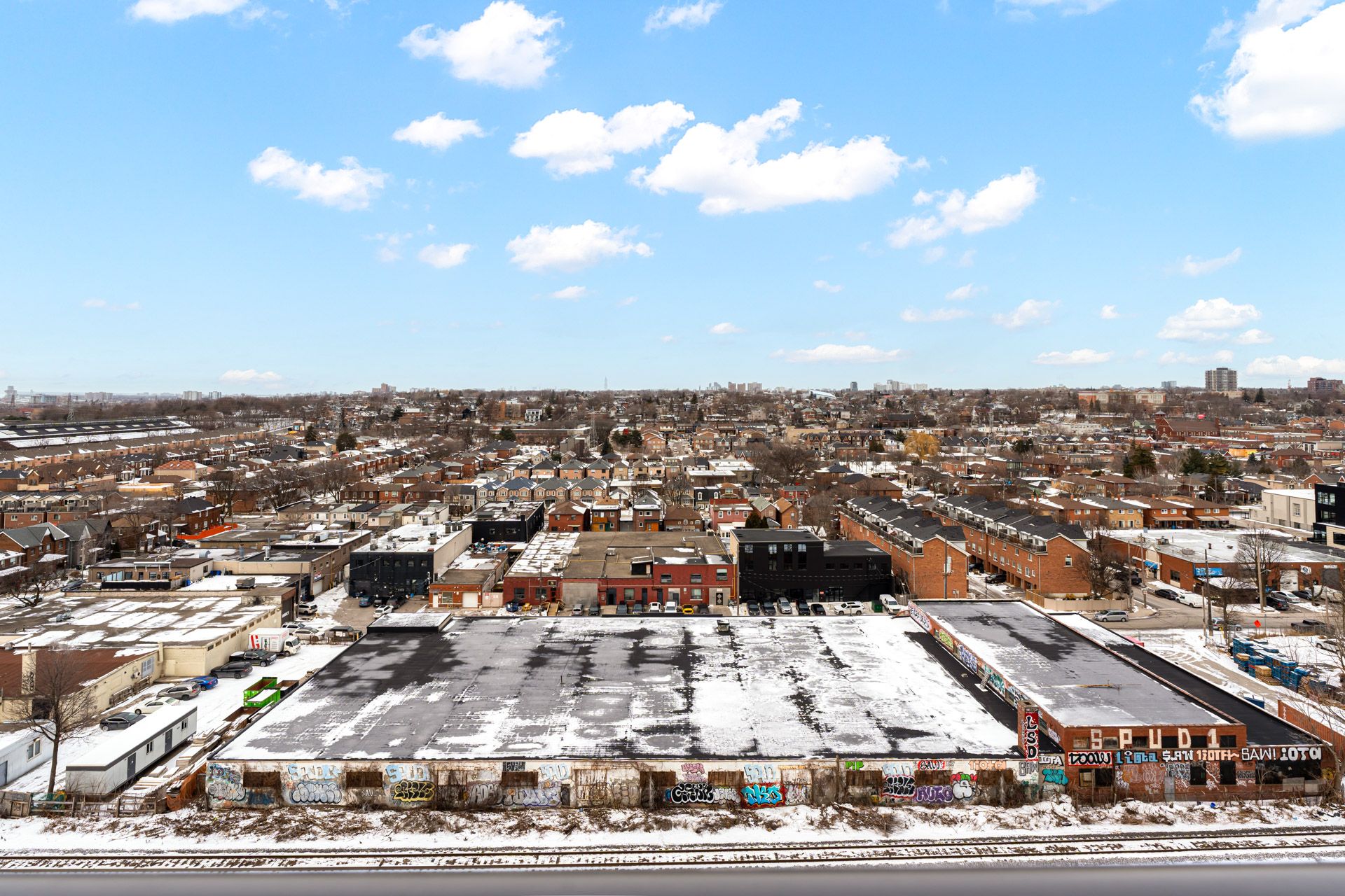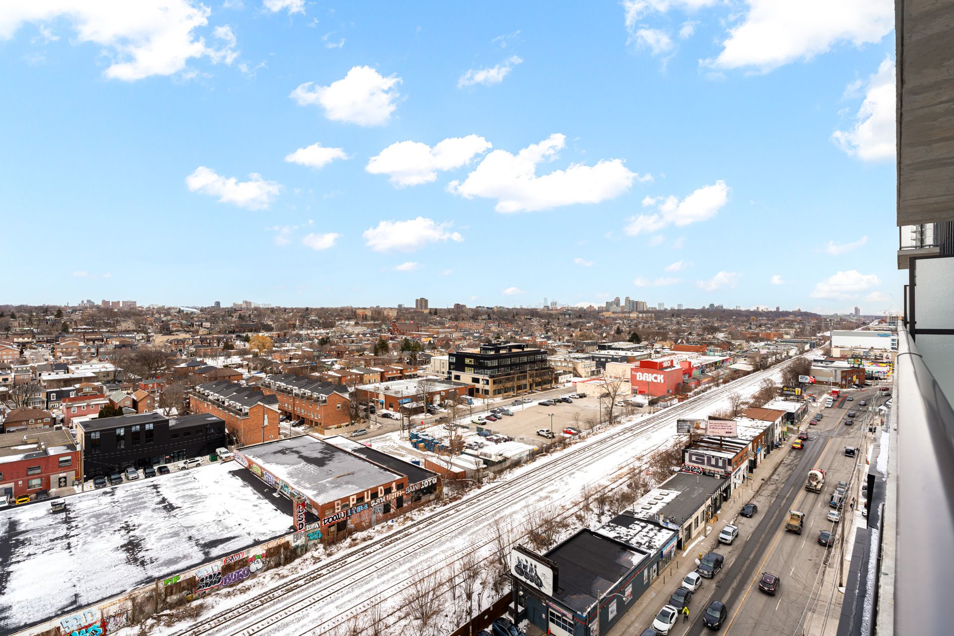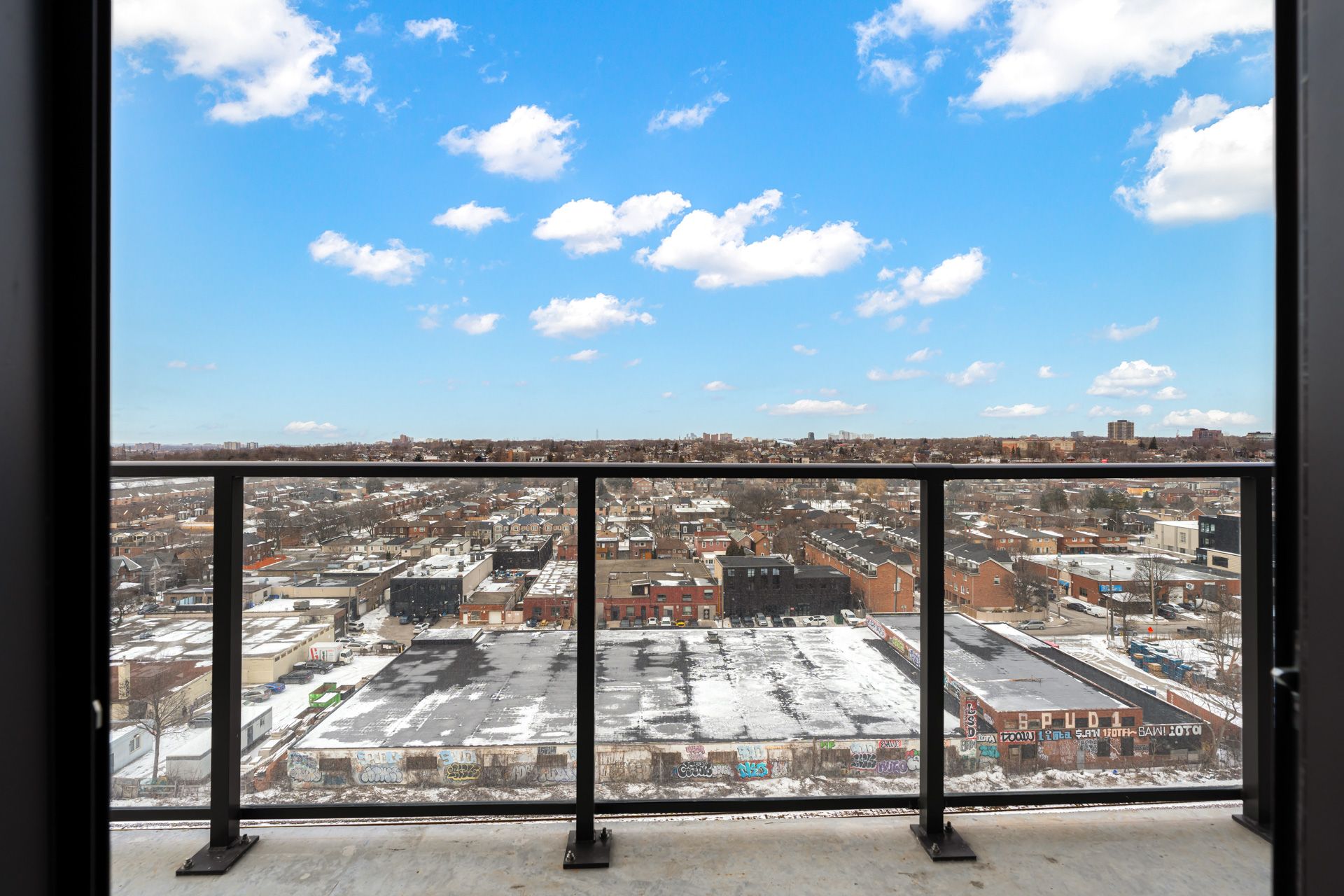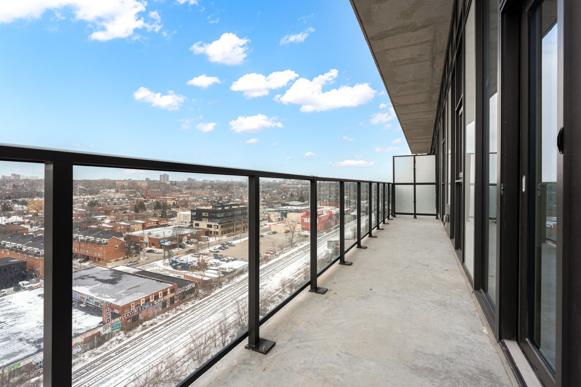 Welcome to galleria condos, ideally located at dupont and dufferin in toronto's vibrant wallace emerson community. This stunning one bedroom plus den luxury corner suite features impressive 10-foot ceilings and offers approximately 650 square feet of thoughtfully designed living space. The separate den includes its own window and door, making it perfect for a private home office or guest space. Enjoy breathtaking north-east views with glimpses of the water through expansive floor-to-ceiling windows that fill the unit with natural light. The modern open-concept kitchen is beautifully appointed with quartz countertops, stainless steel appliances, and ample storage cabinetry, while sleek laminate flooring flows throughout. Situated in a highly anticipated master-planned community surrounded by grocery stores, schools, restaurants, and everyday conveniences, residents enjoy exceptional amenities including 24-hour security, concierge service, a rooftop terrace, and a fully equipped gym. Convenient access to ttc bus routes and dufferin station makes commuting effortless.
