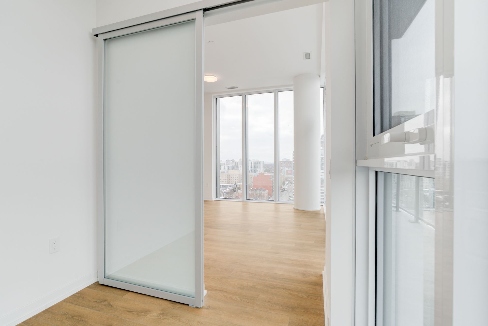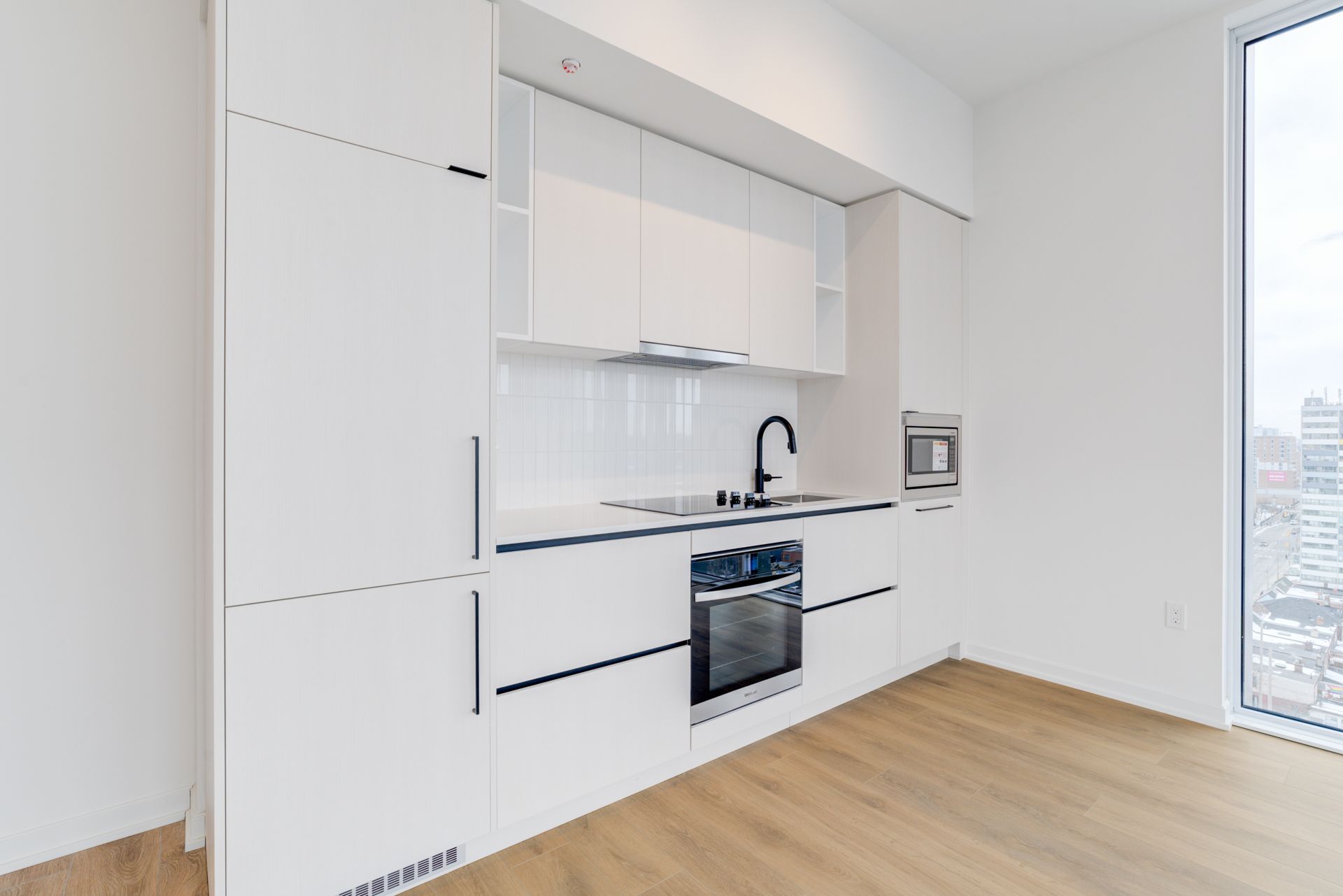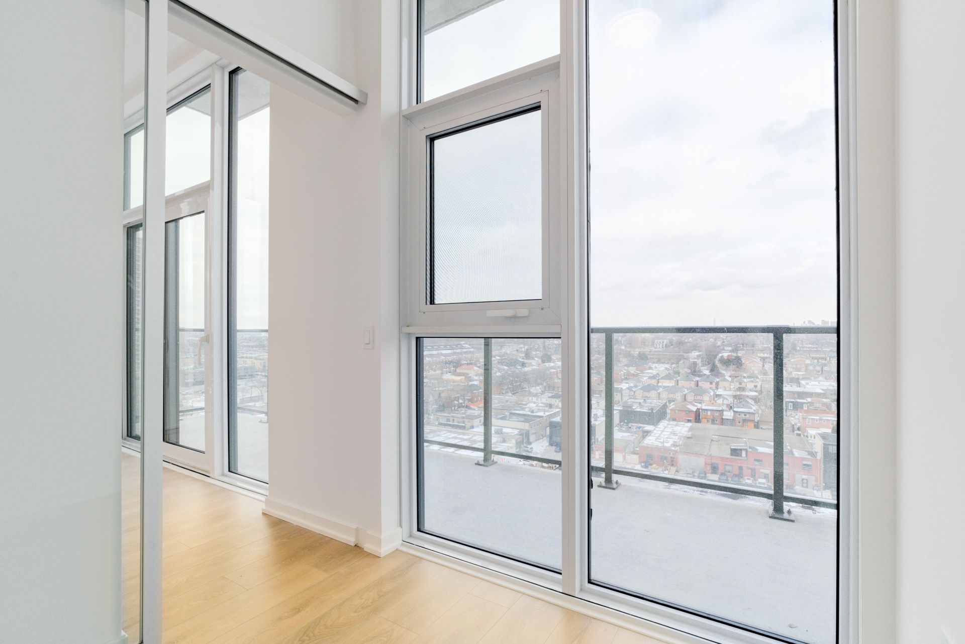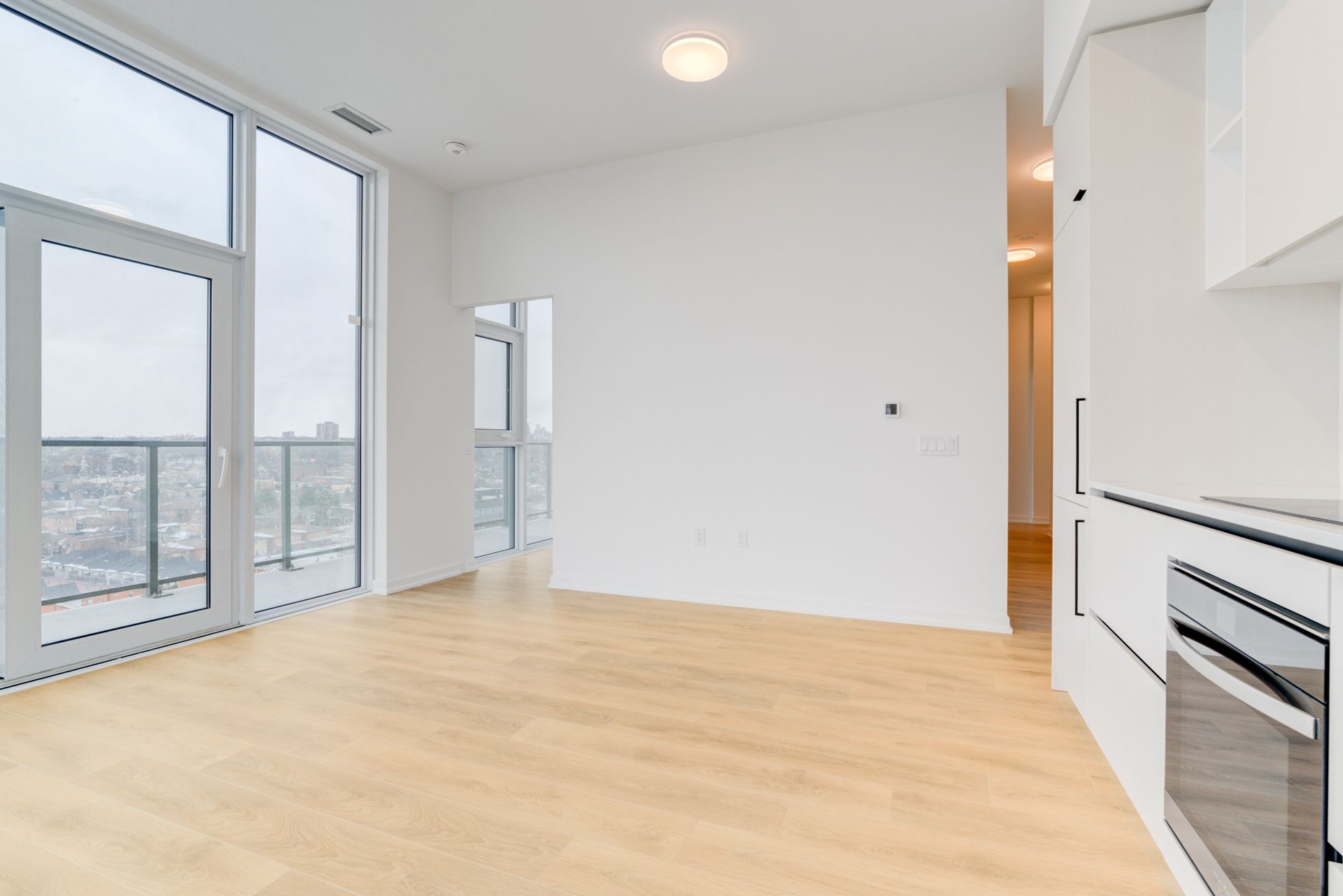 Welcome to galleria condos, ideally located at dupont and dufferin in toronto's vibrant wallace emerson community. This stunning one bedroom plus den luxury corner suite features impressive 10-foot ceilings and offers approximately 650 square feet of thoughtfully designed living space. The separate den includes its own window and door, making it perfect for a private home office or guest space. Enjoy breathtaking north-east views with glimpses of the water through expansive floor-to-ceiling windows that fill the unit with natural light. The modern open-concept kitchen is beautifully appointed with quartz countertops, stainless steel appliances, and ample storage cabinetry, while sleek laminate flooring flows throughout. Situated in a highly anticipated master-planned community surrounded by grocery stores, schools, restaurants, and everyday conveniences, residents enjoy exceptional amenities including 24-hour security, concierge service, a rooftop terrace, and a fully equipped gym. Convenient access to ttc bus routes and dufferin station makes commuting effortless.