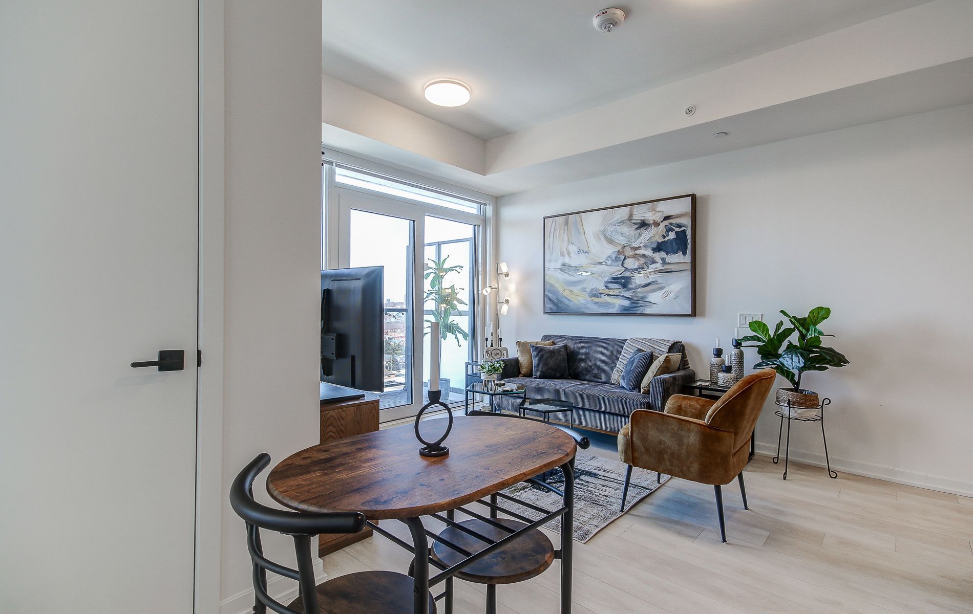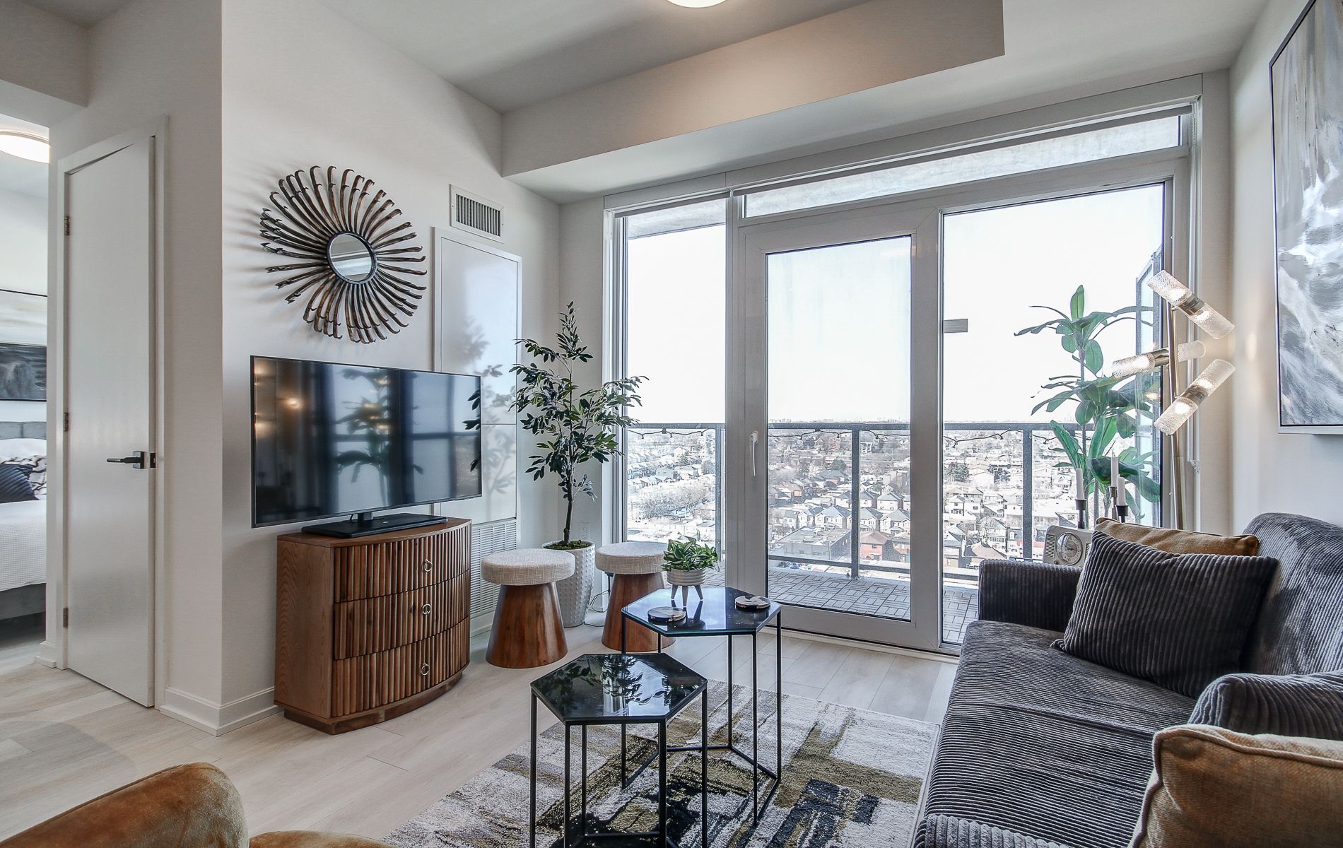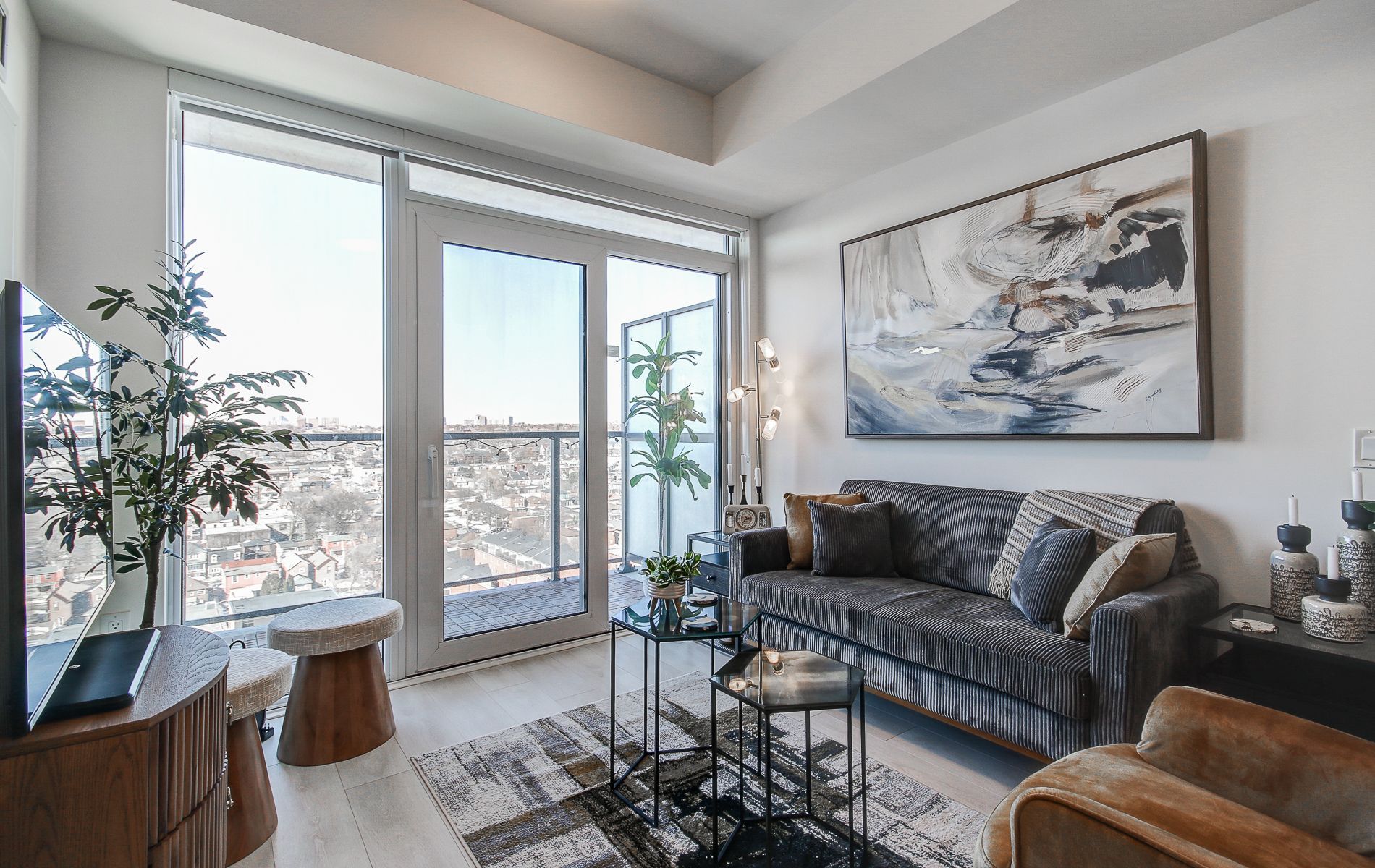 • Open-concept layout with a private balcony for city views.