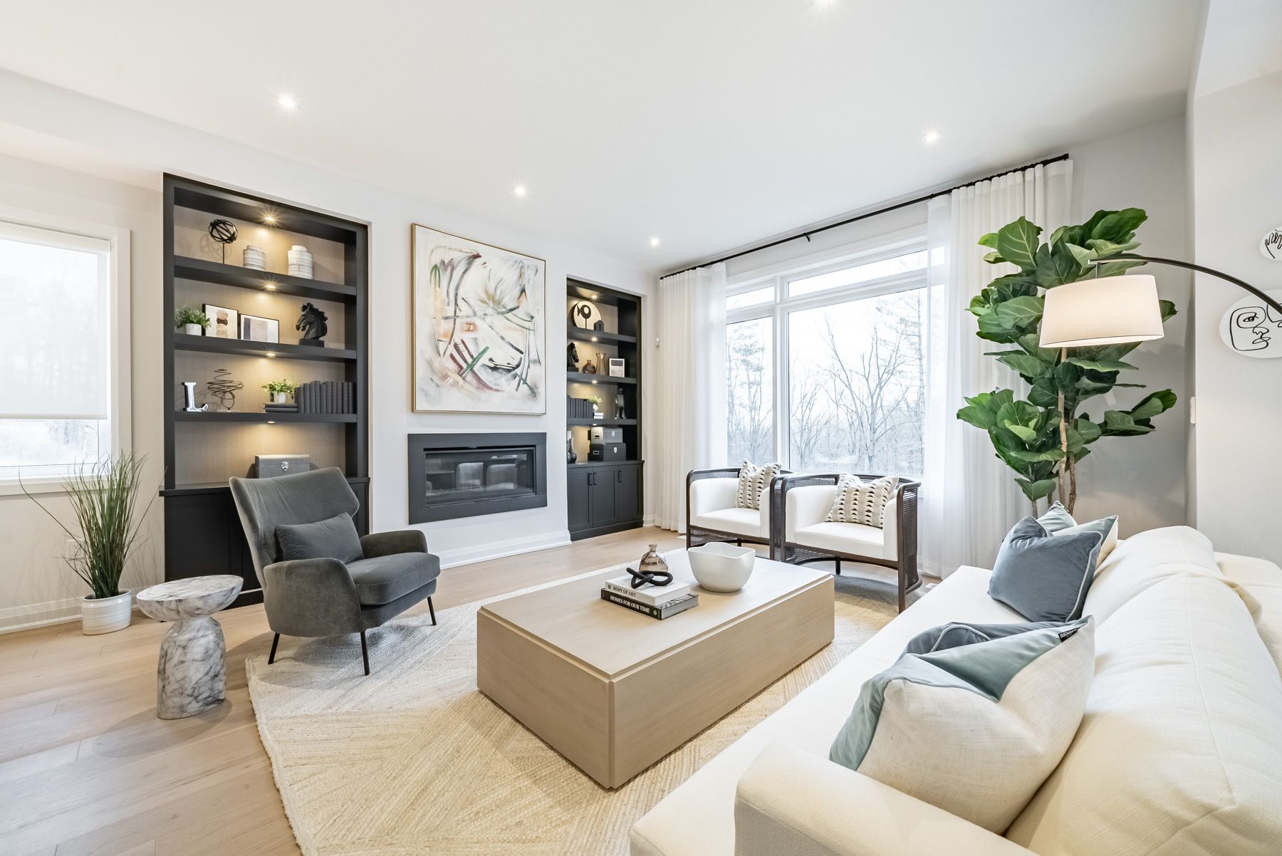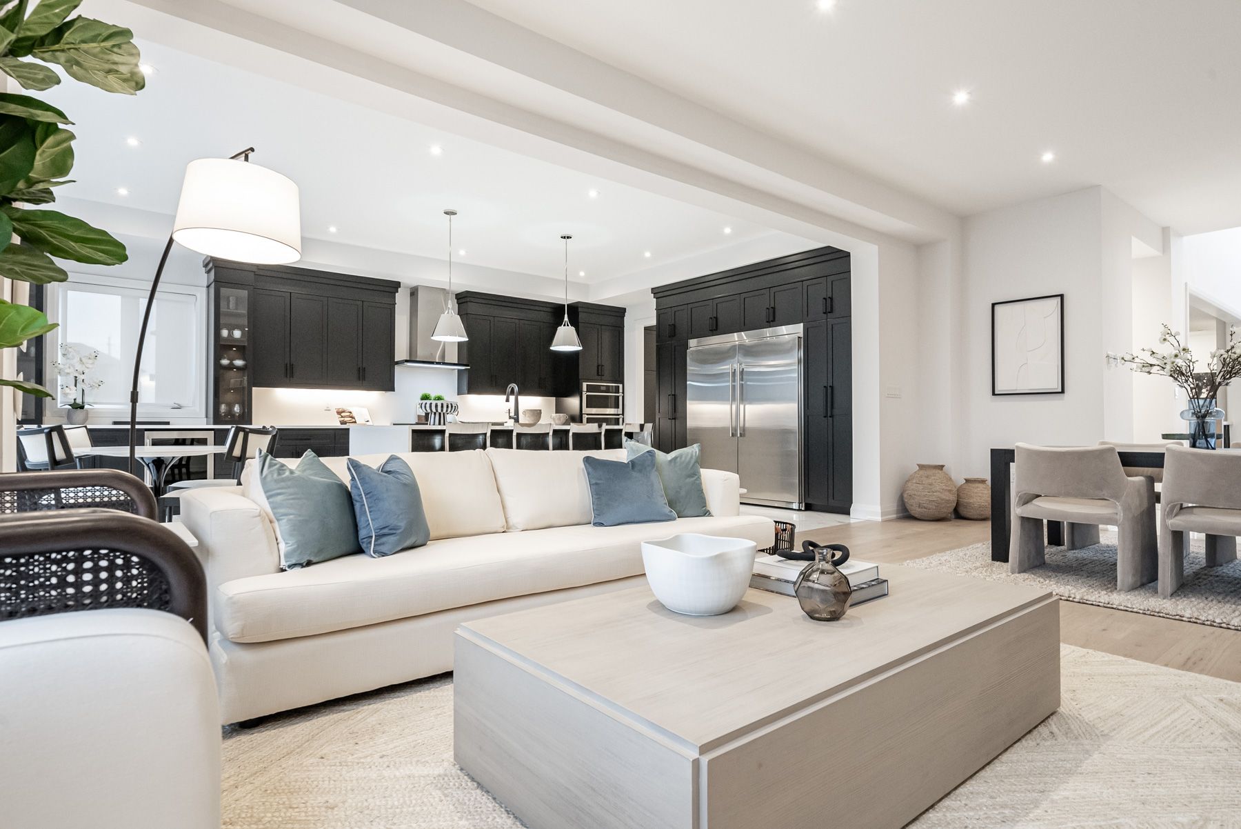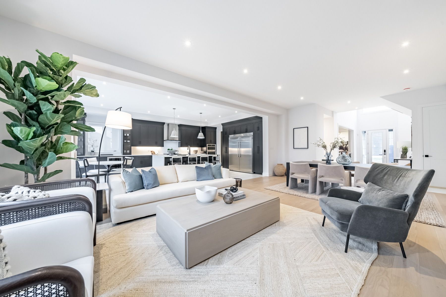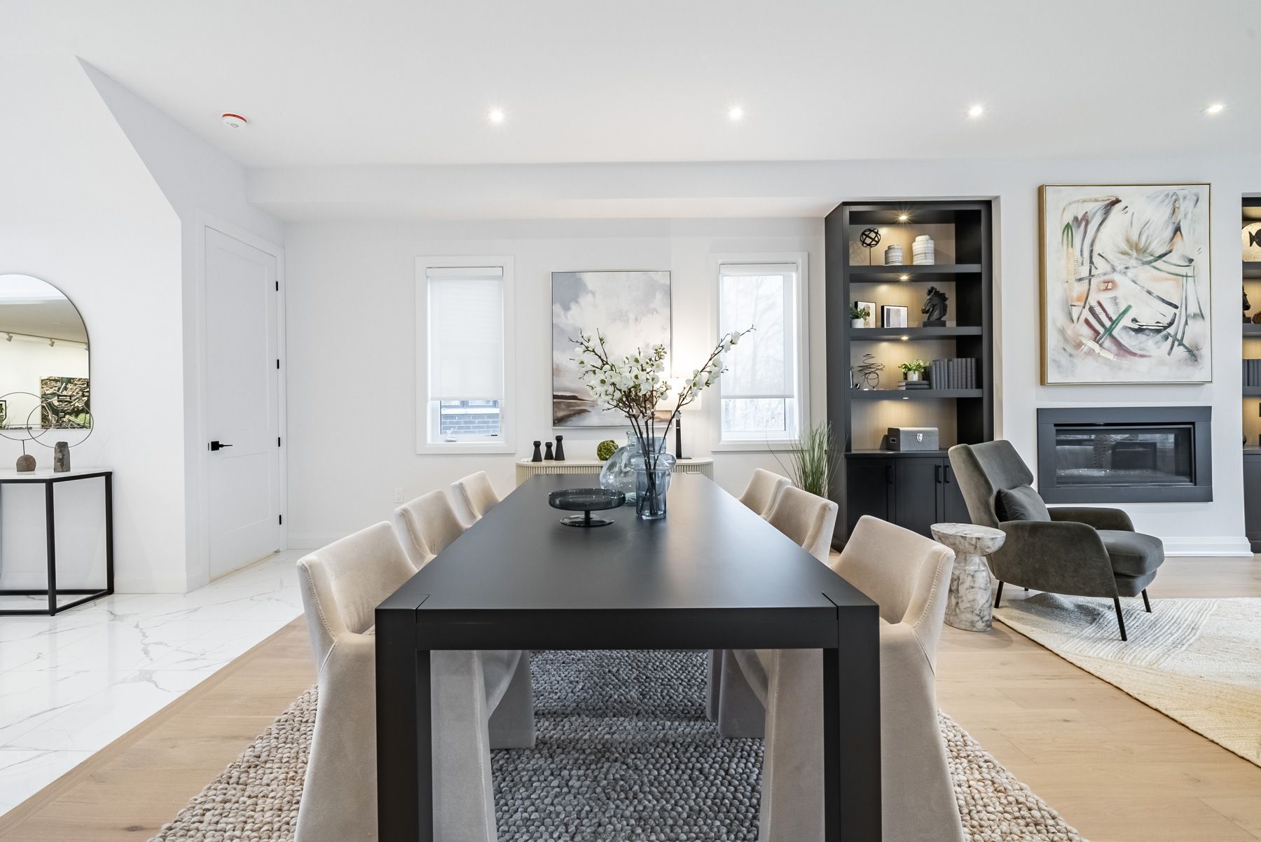 • Open-concept main floor with hardwood floors and high ceilings.