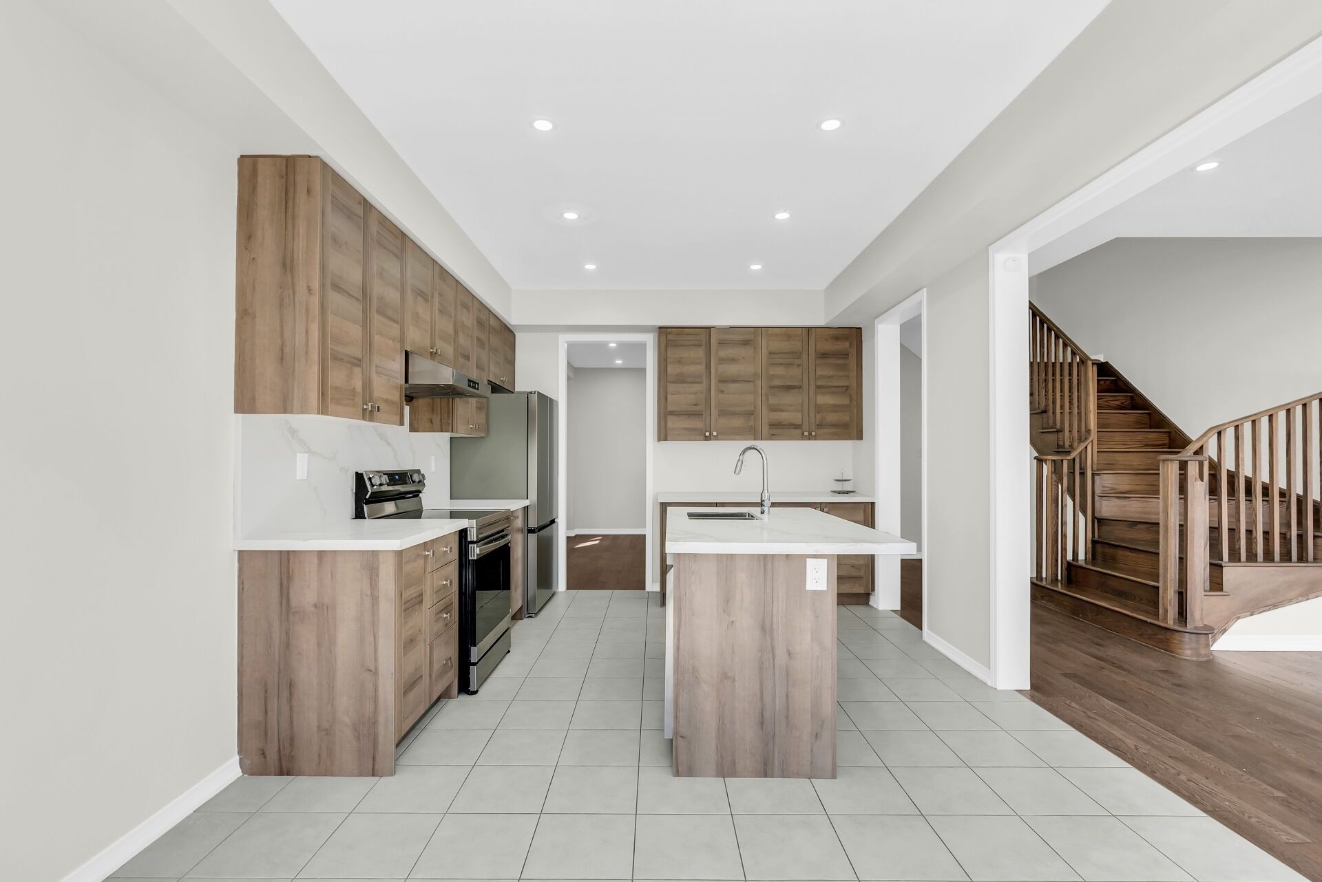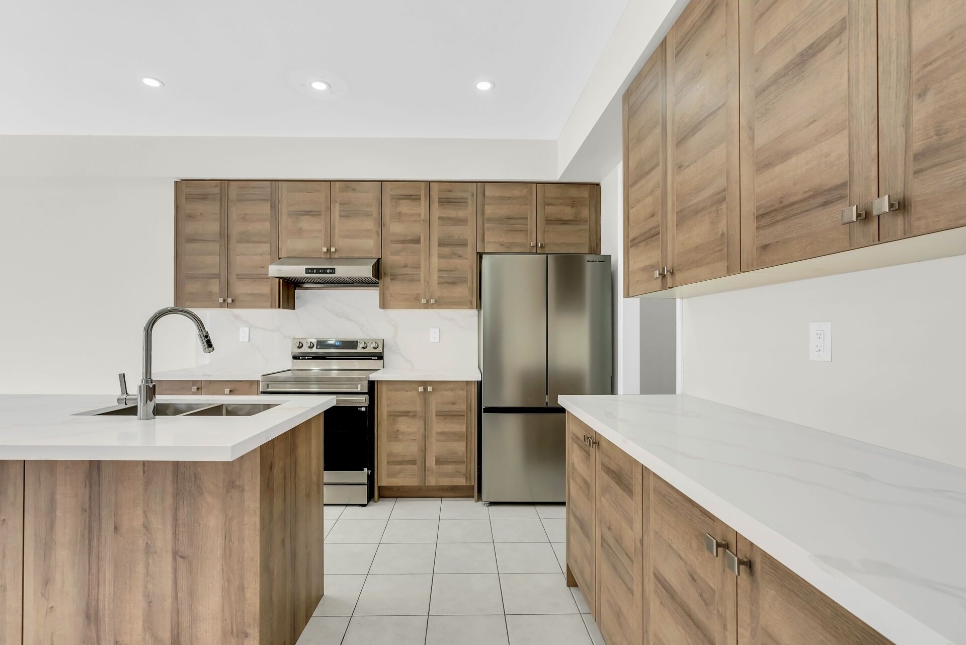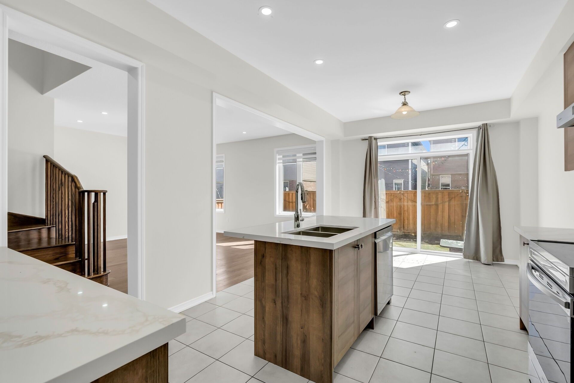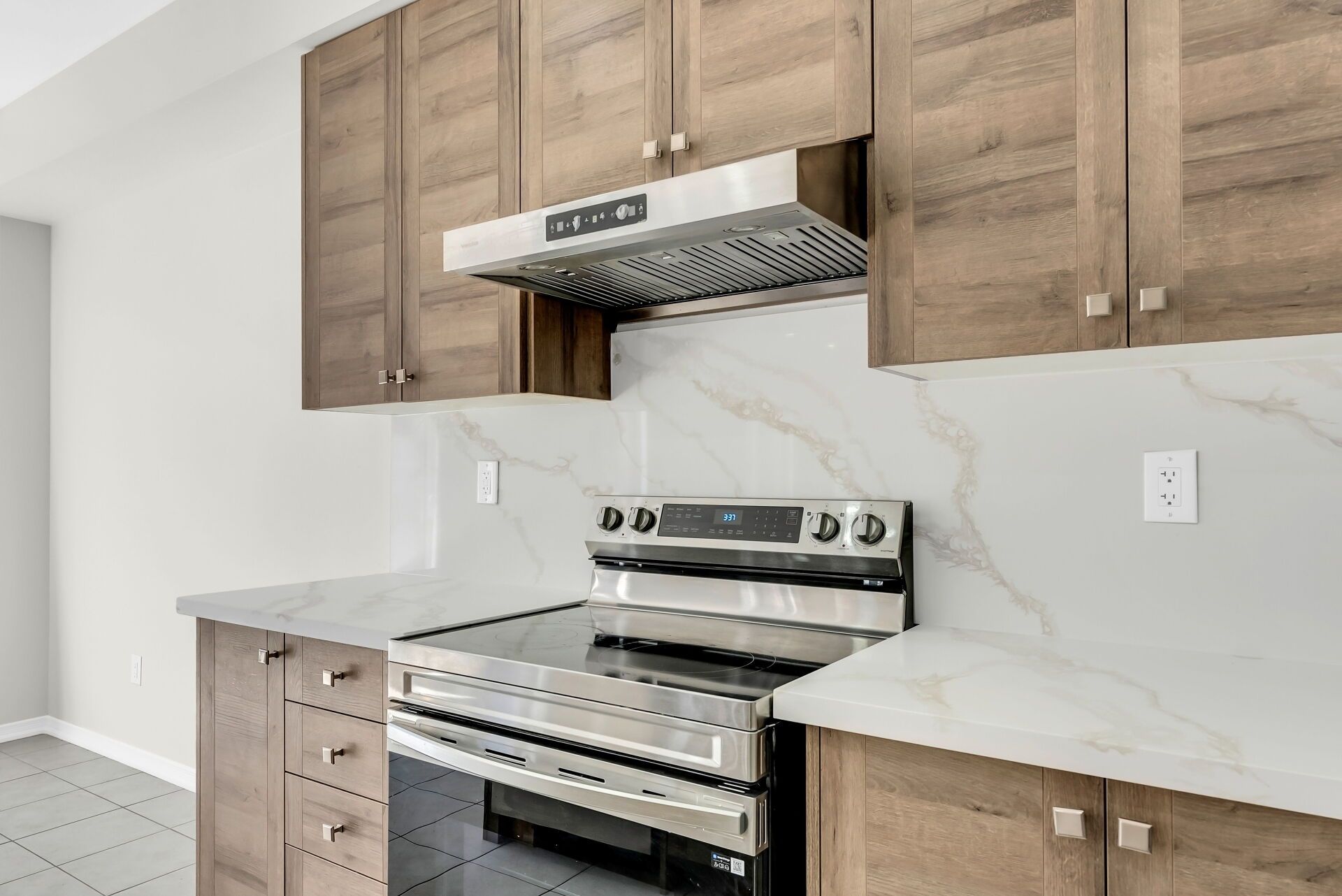 • Ample quartz counters and stainless steel appliances in the kitchen.