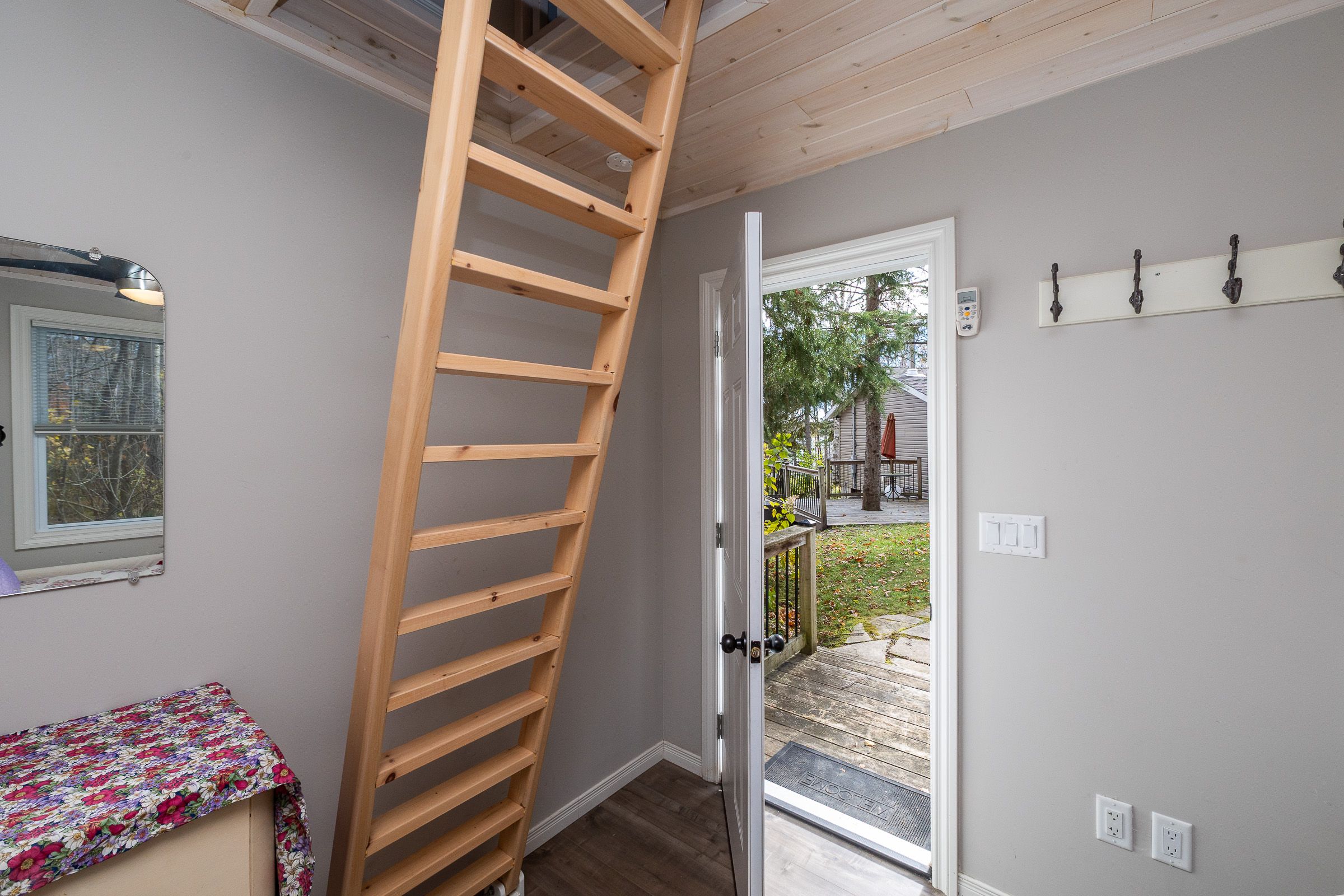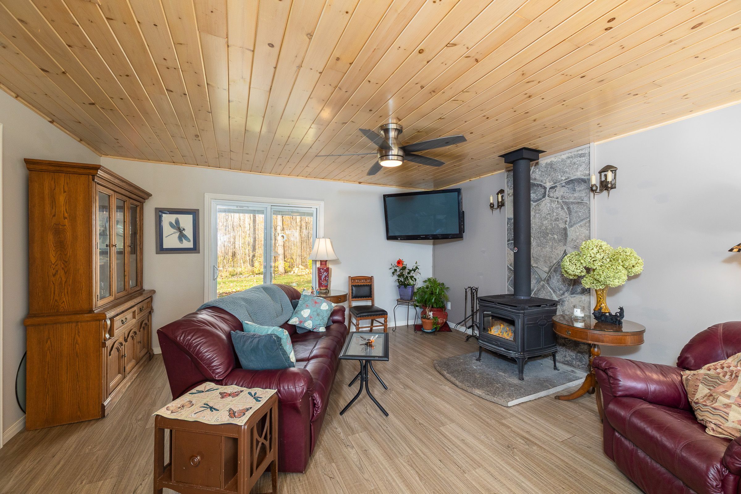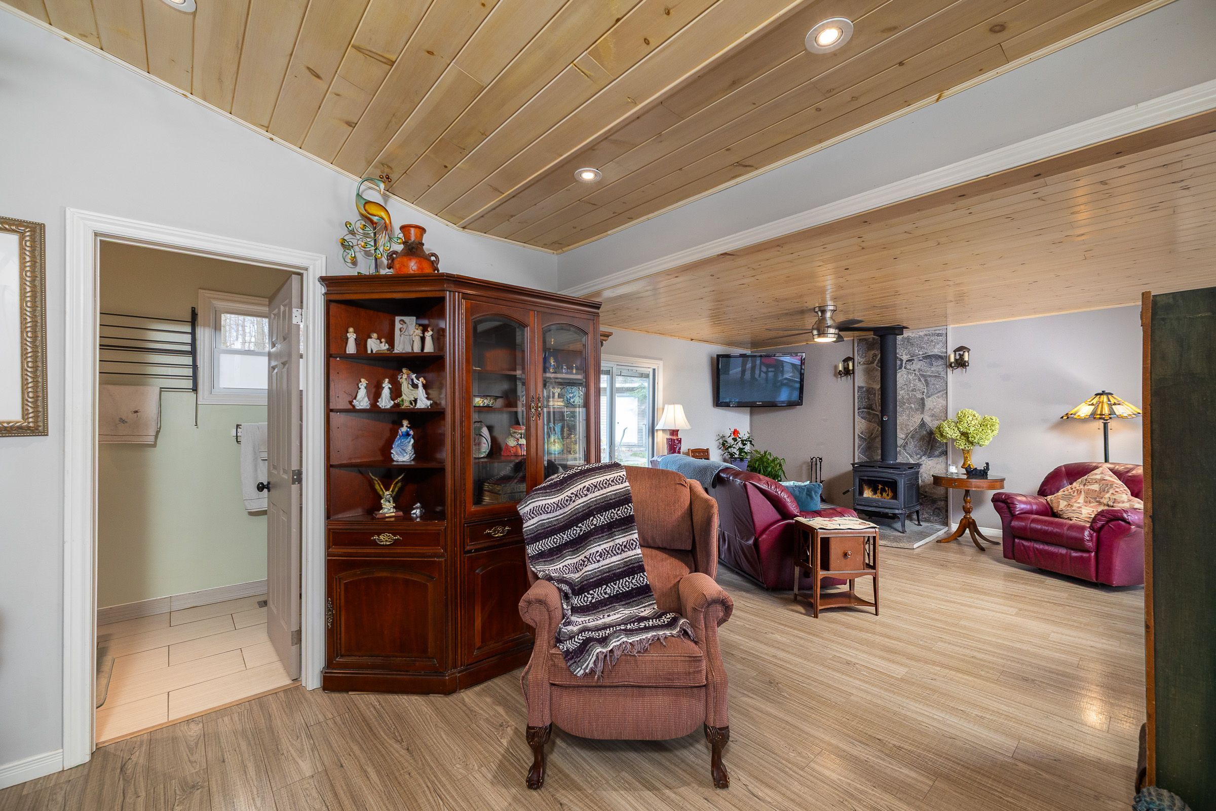 • Bright open-concept living area with vaulted pine ceilings and cozy wood stove.