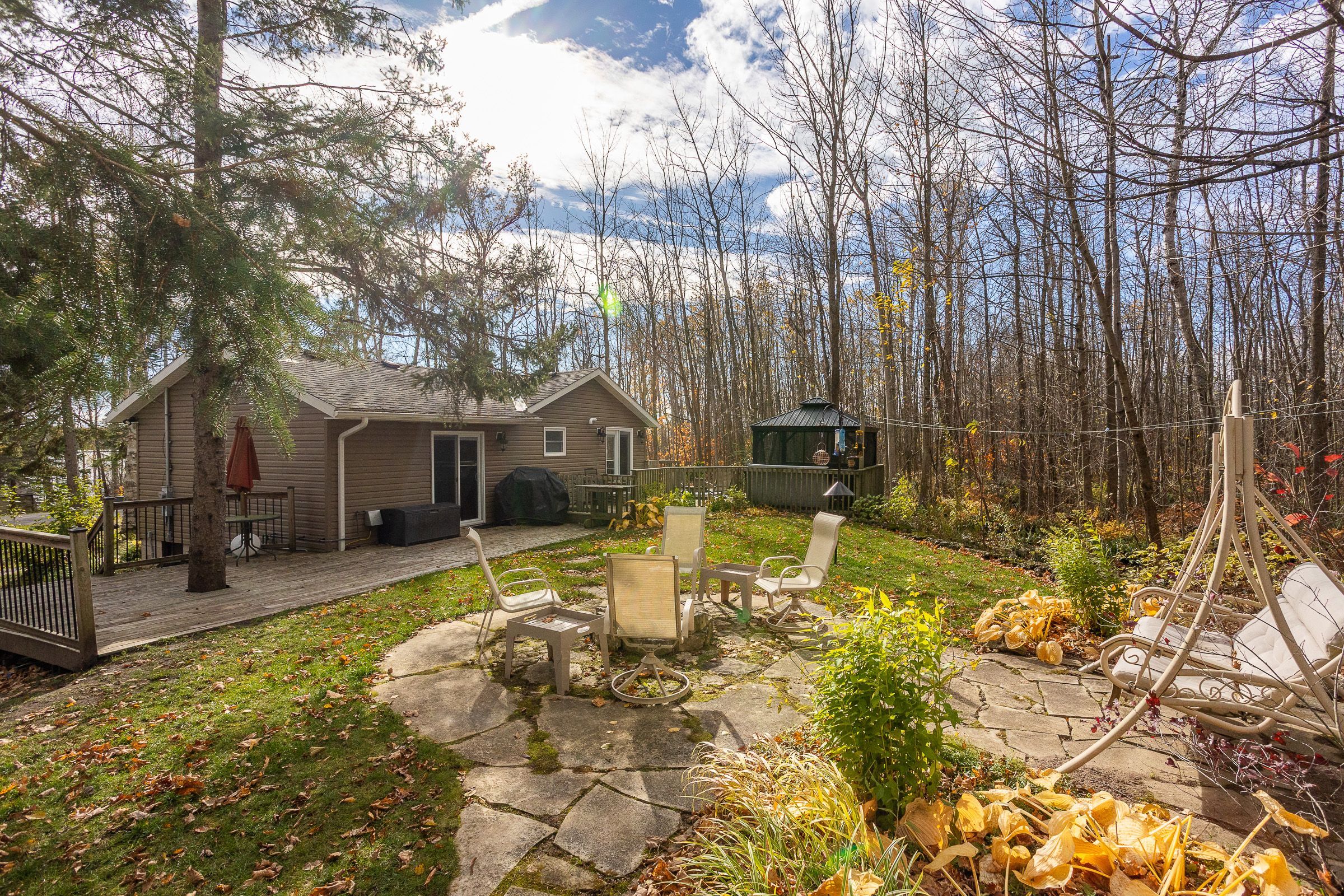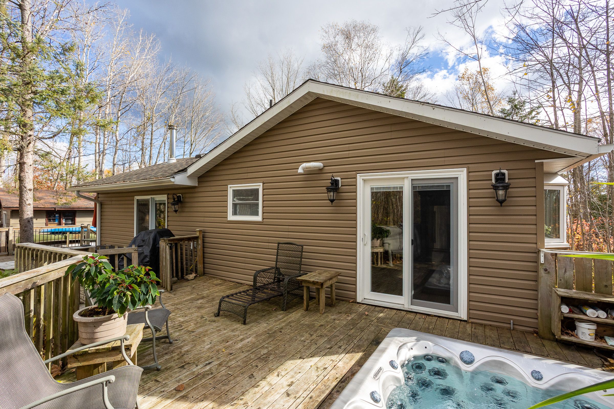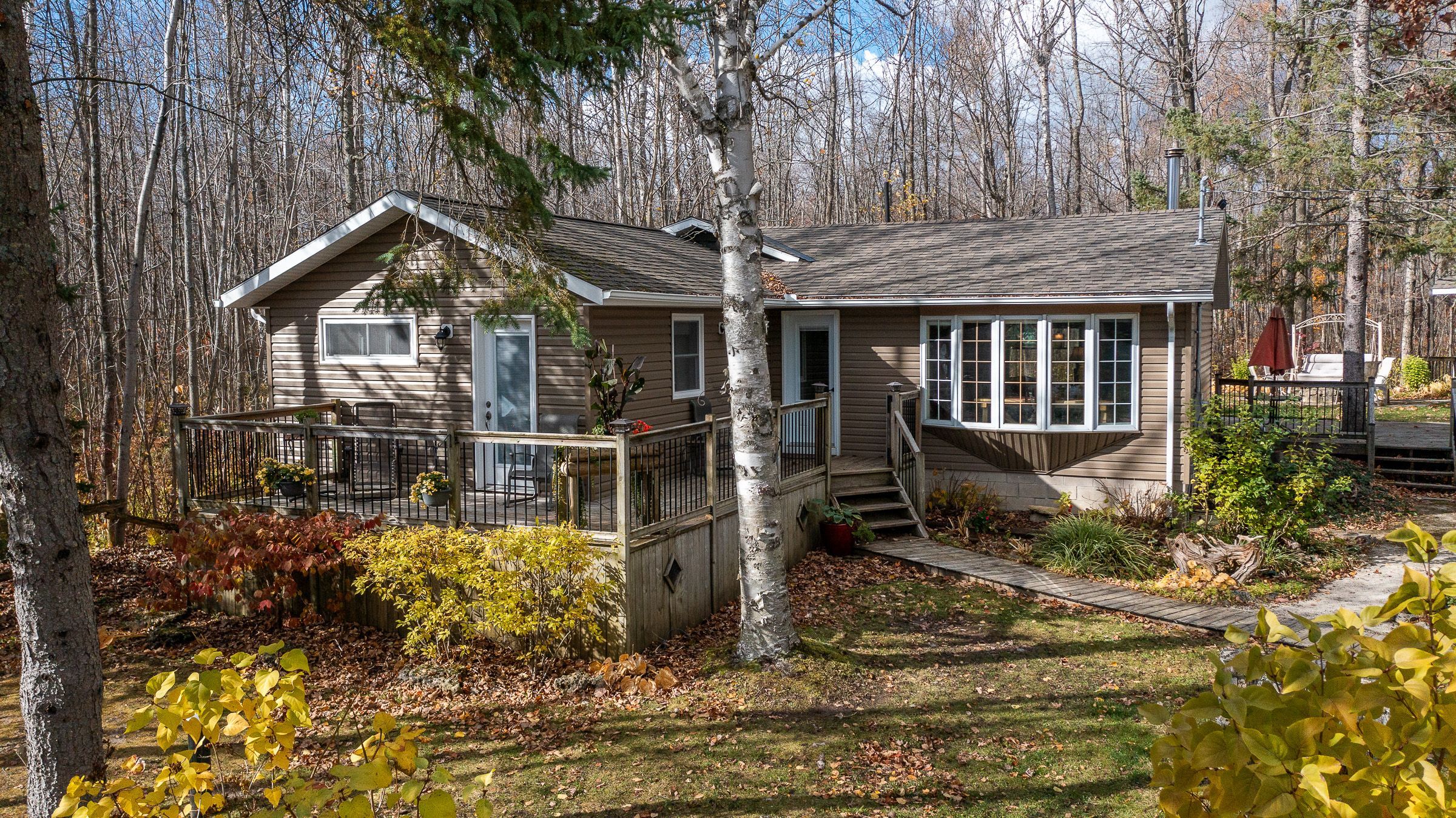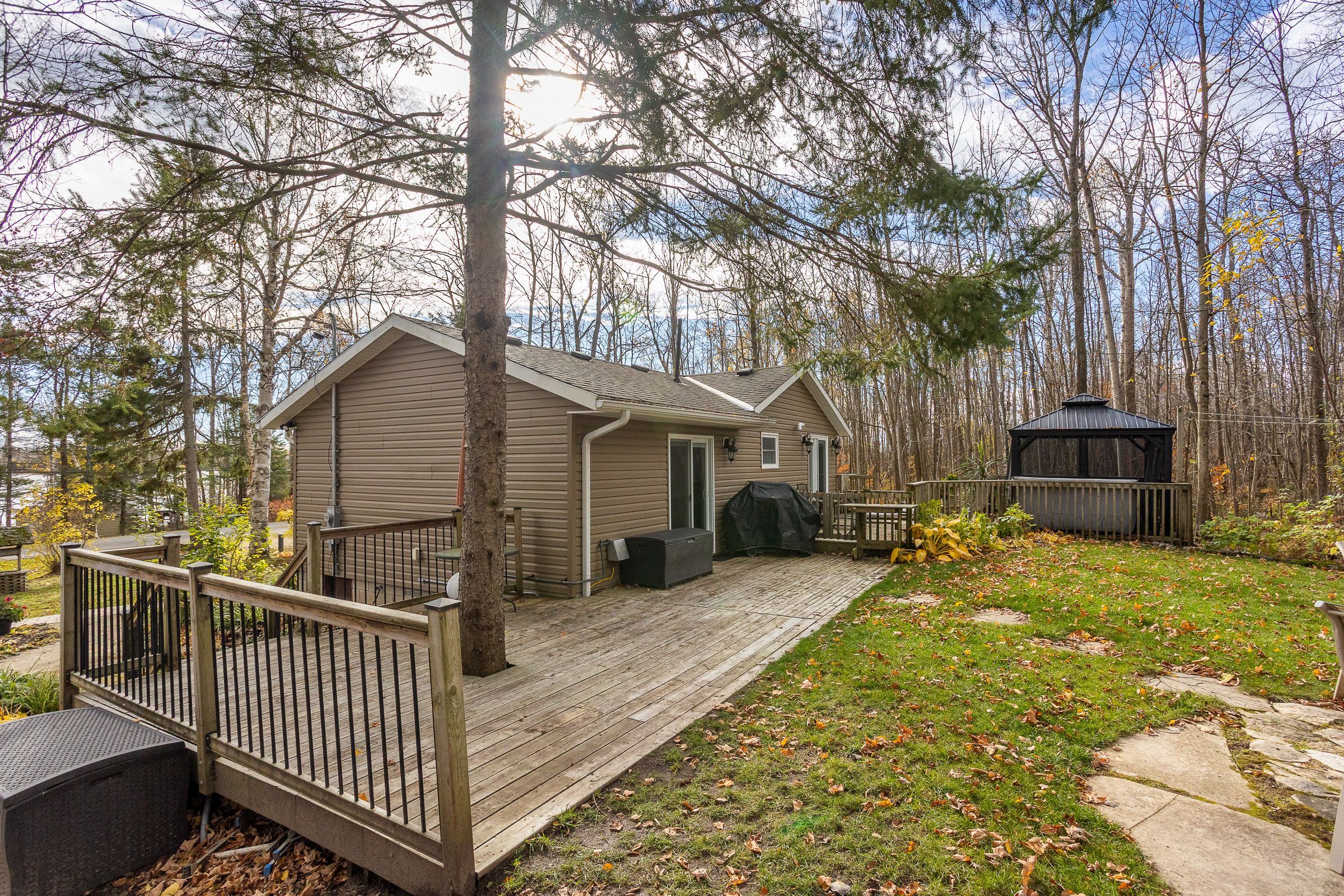 Charming year-round home or cottage just steps from miller lake! This beautifully renovated year-round retreat offers the perfect blend of comfort, craftsmanship, and convenience--ideally located just 100 feet from public lake access. Set on a hardwood tree-lined lot, this home has been substantially updated between 2016 and 2018, inside and out. The bright open-concept living area features vaulted pine ceilings, new flooring, and a cozy wood stove accented by custom stonework. The chef's kitchen is a true highlight, showcasing handcrafted mennonite cabinetry with soft-close drawers and pull-outs, granite double sink, peninsula with bar seating, and stainless appliances including a propane convection double oven. The home provides two spacious bedrooms, including a primary suite with a 2-piece ensuite and walkout to the deck. The second bedroom features custom-built double bunk beds and double insulation for privacy. Additional features include a modern stackable washer/dryer, hallway cabinetry with built-in desk, propane furnace, on-demand hot water, and custom insulated blinds. Enjoy outdoor living at its best with a forest lined deck and hot tub, screened-in hard-roof gazebo, and professionally landscaped yard with gardens, stonework, and dedicated firepit area. A detached garage/workshop offers plenty of storage, while the insulated two-storey bunky--finished in pine with pot lights, ceiling fan, and space to sleep up to six--provides a great space for guests. Meticulously maintained and move-in ready, this charming property is perfect for full-time living or as a four-season getaway. Experience the beauty and tranquility of miller lake living--just minutes from boating, fishing, and exploring the wonders of the bruce peninsula!