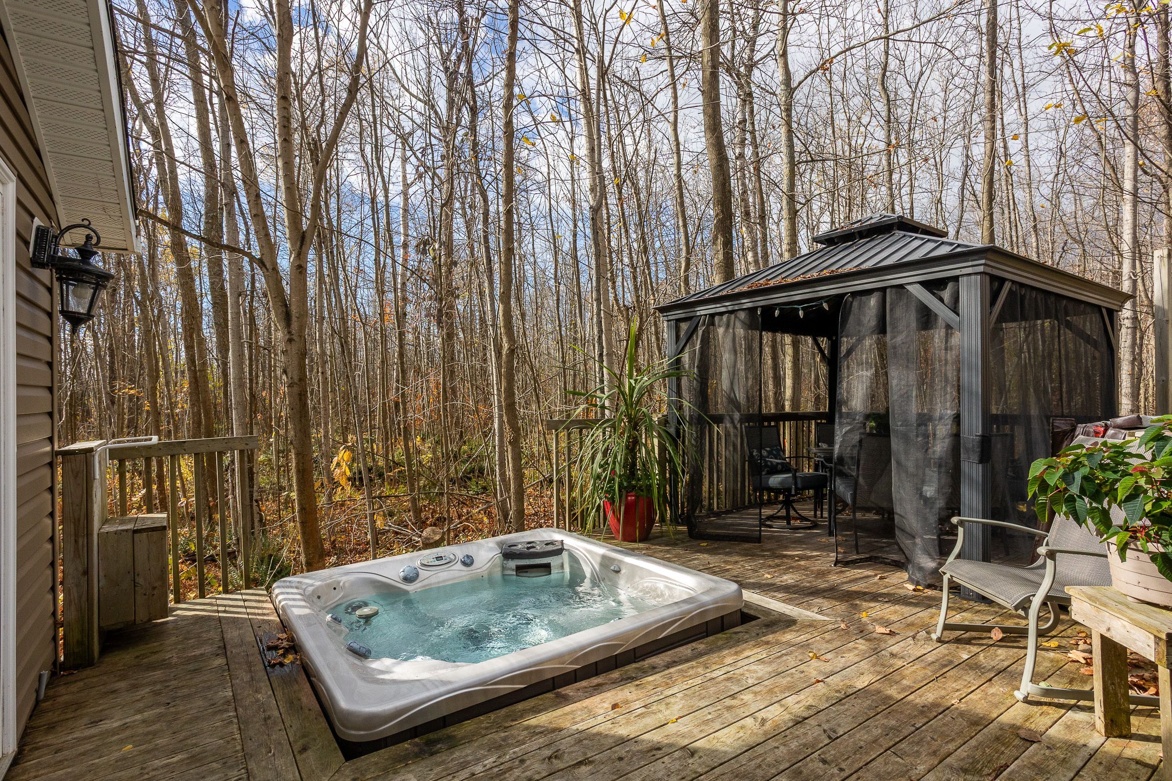 • Outdoor living includes a hot tub, gazebo, and landscaped yard with firepit.