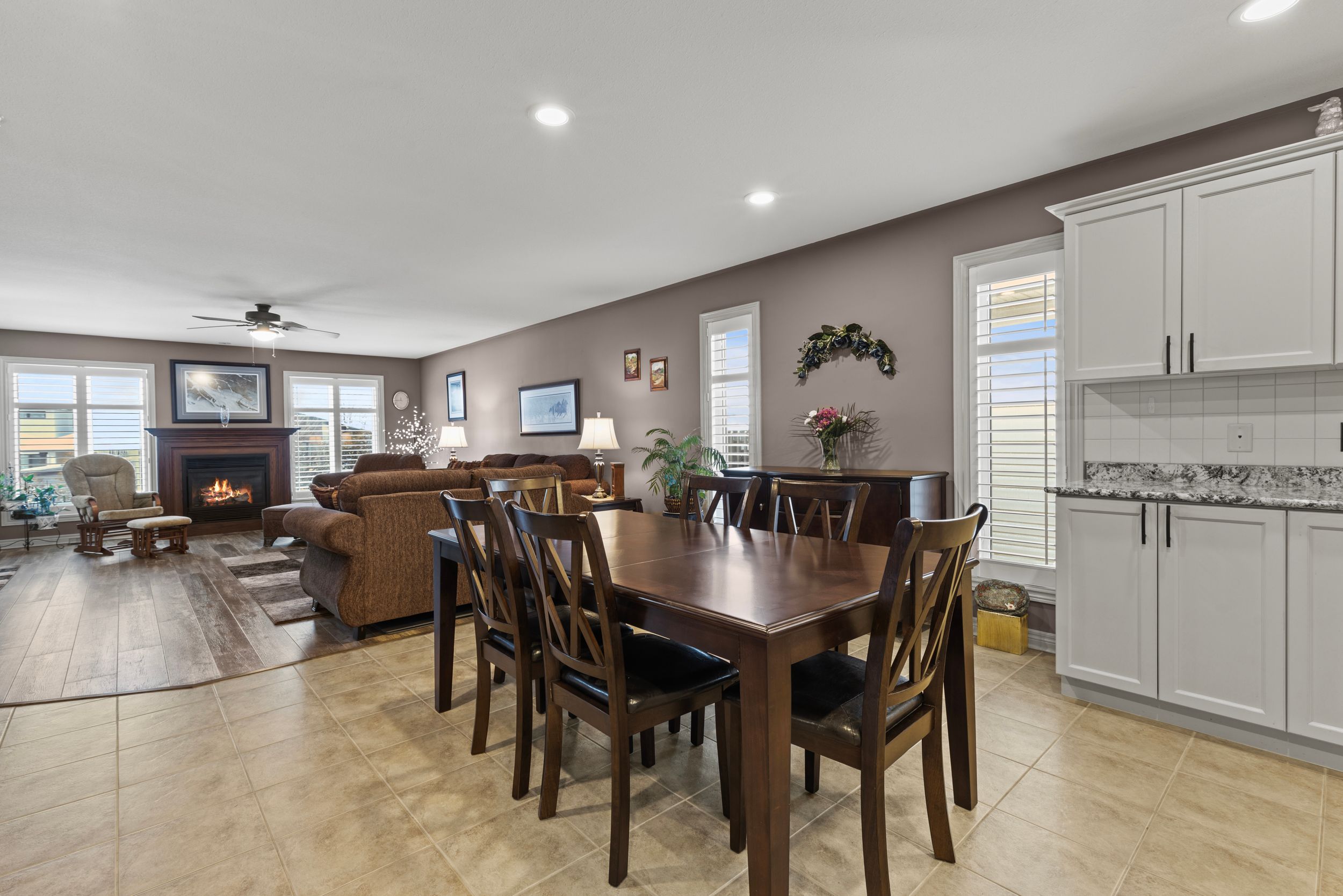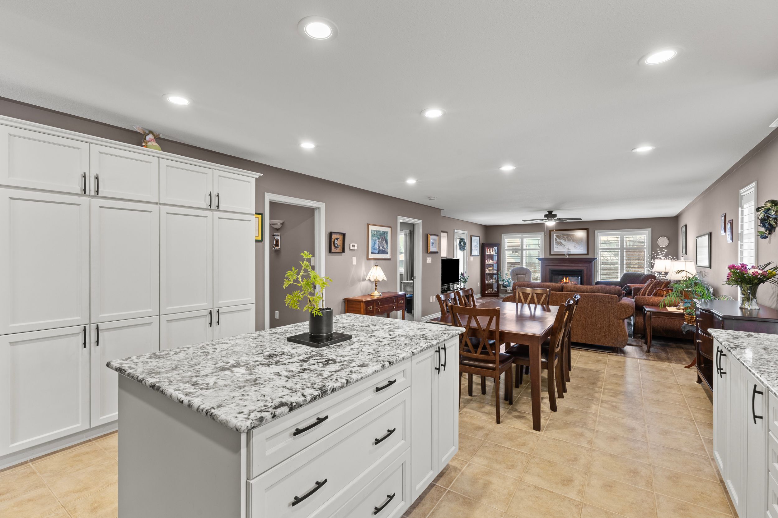 • Bright kitchen features white cabinetry, granite countertops, and a generous island.