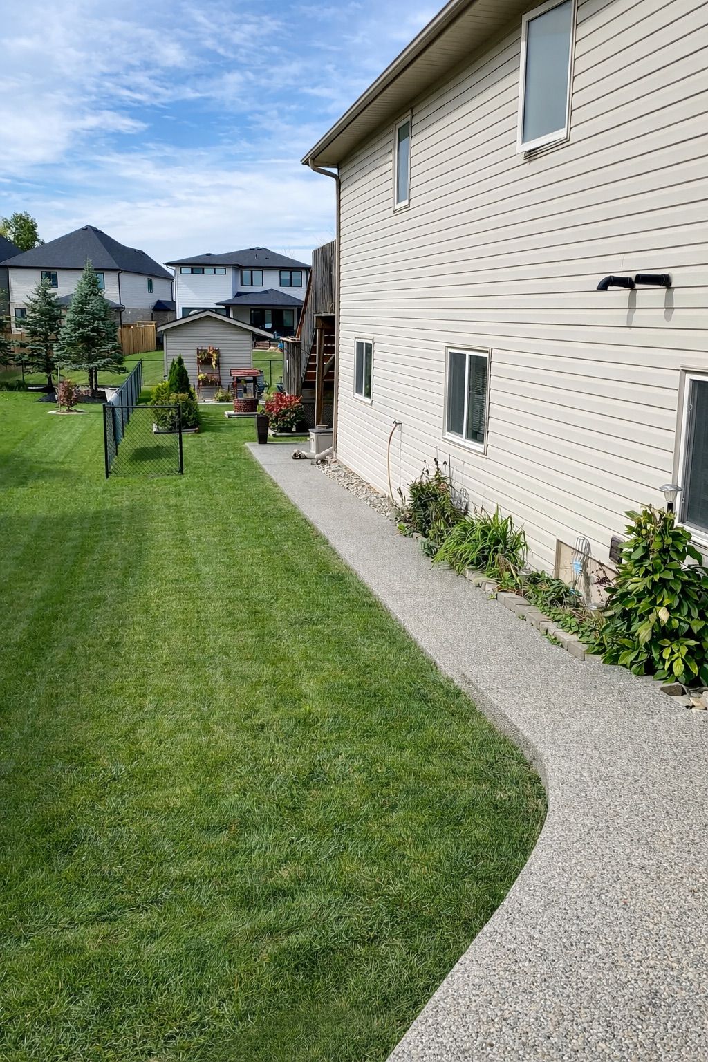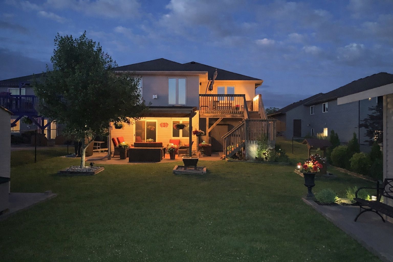 • Landscaped backyard with custom pathways and a two-tiered deck for gatherings.