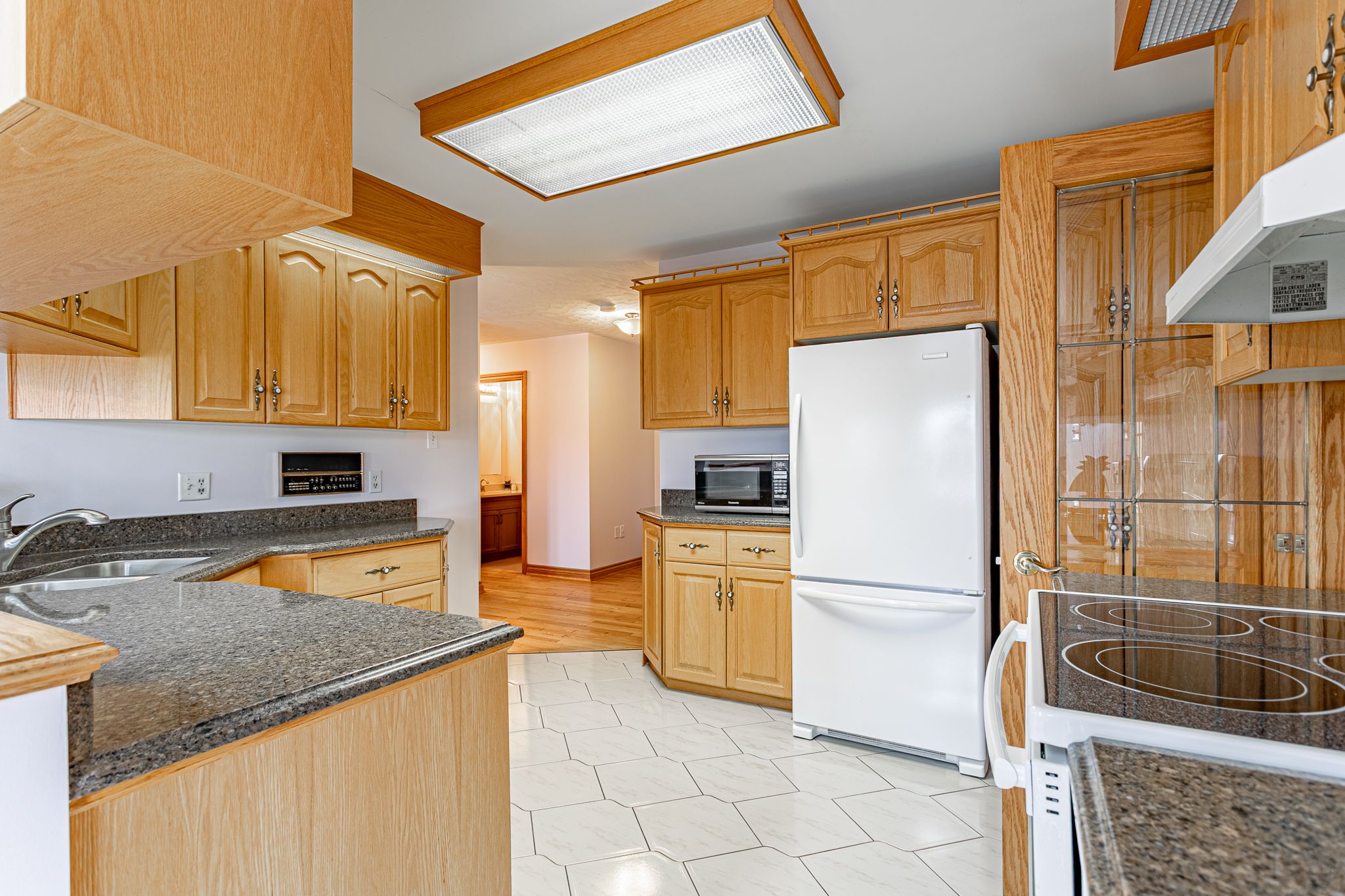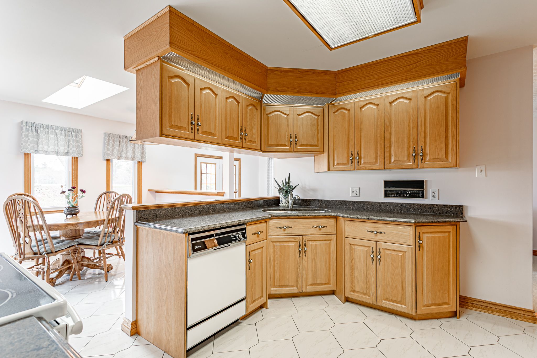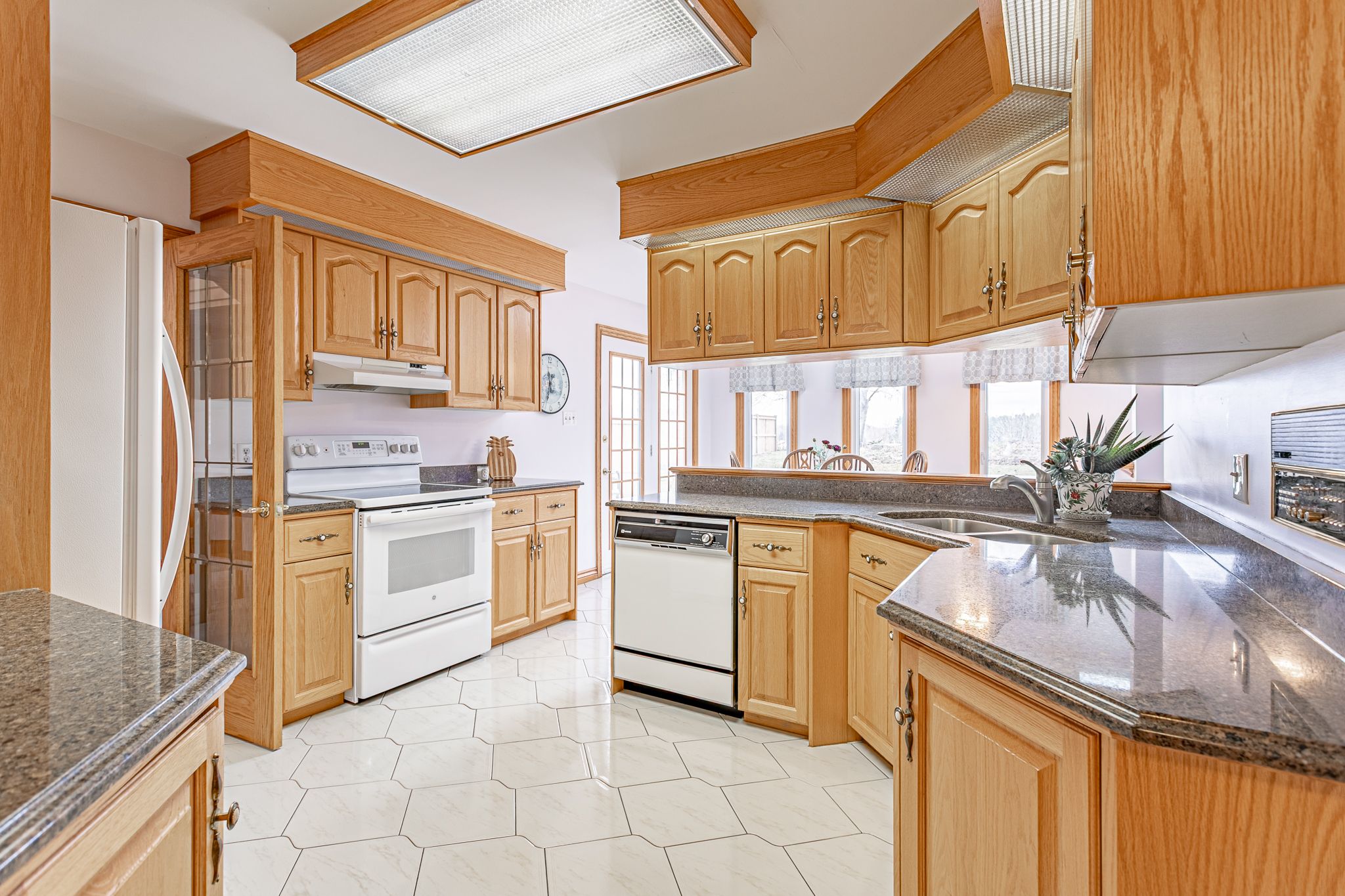 • Bright kitchen features granite countertops and views of the neighboring farmland.