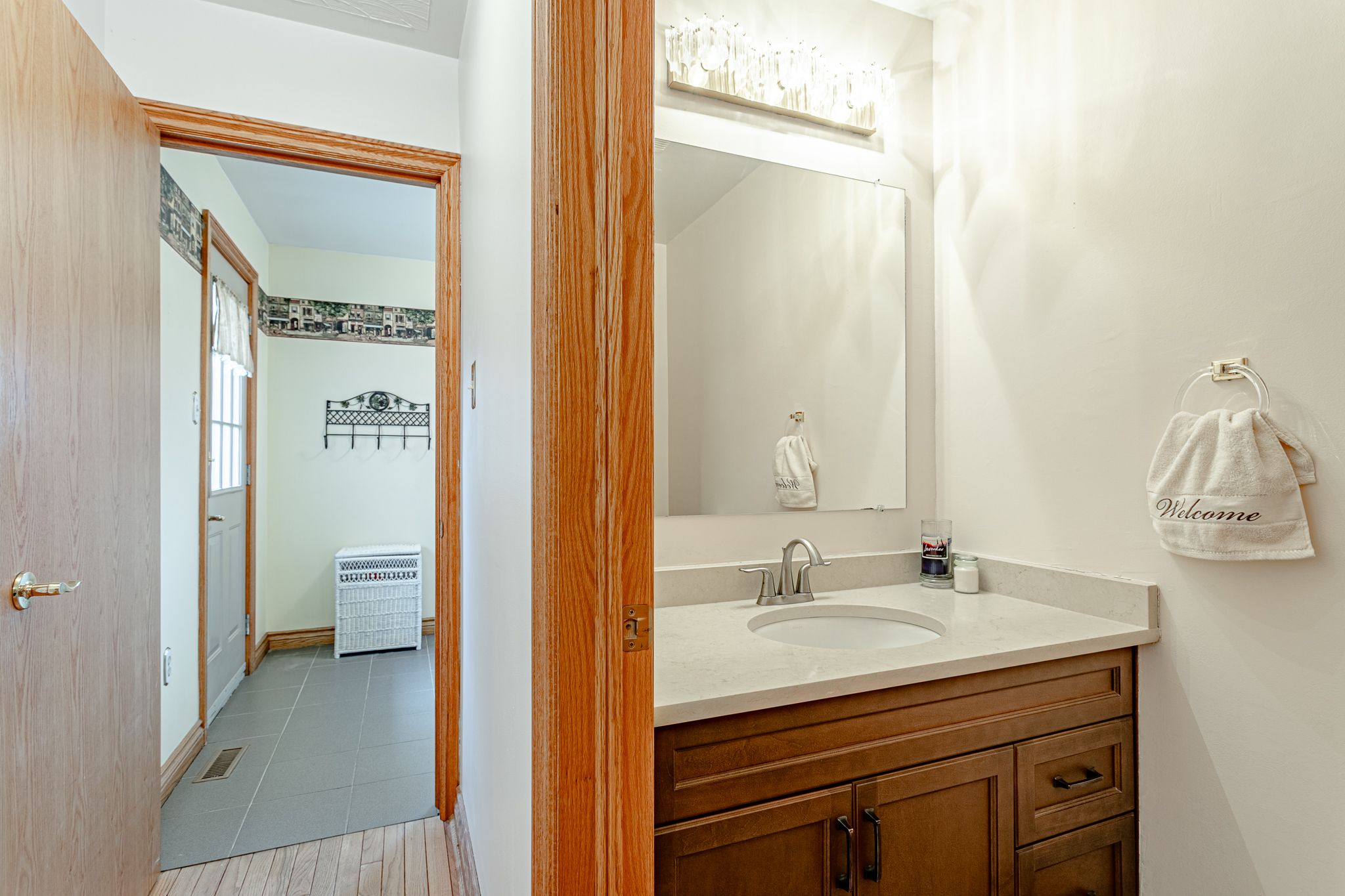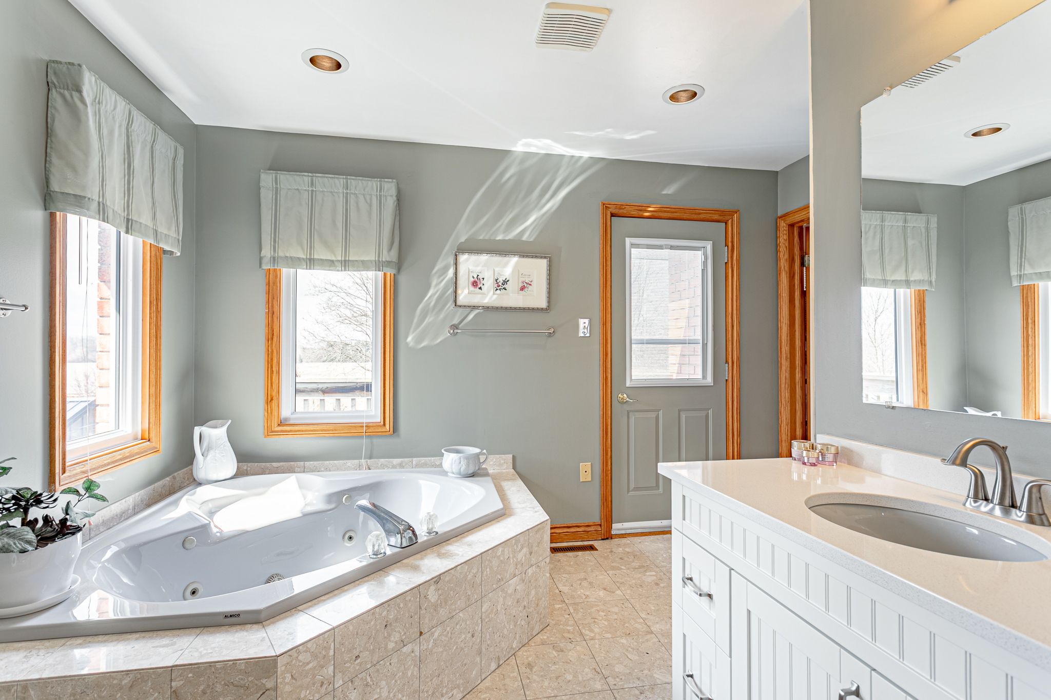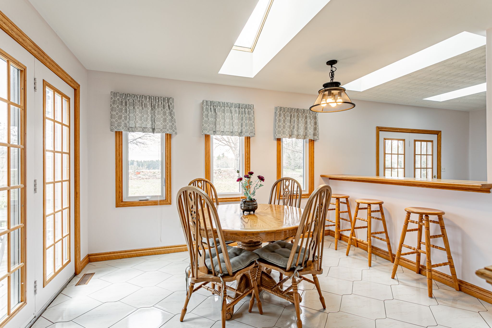 • Bright kitchen features granite countertops and views of the neighboring farmland.