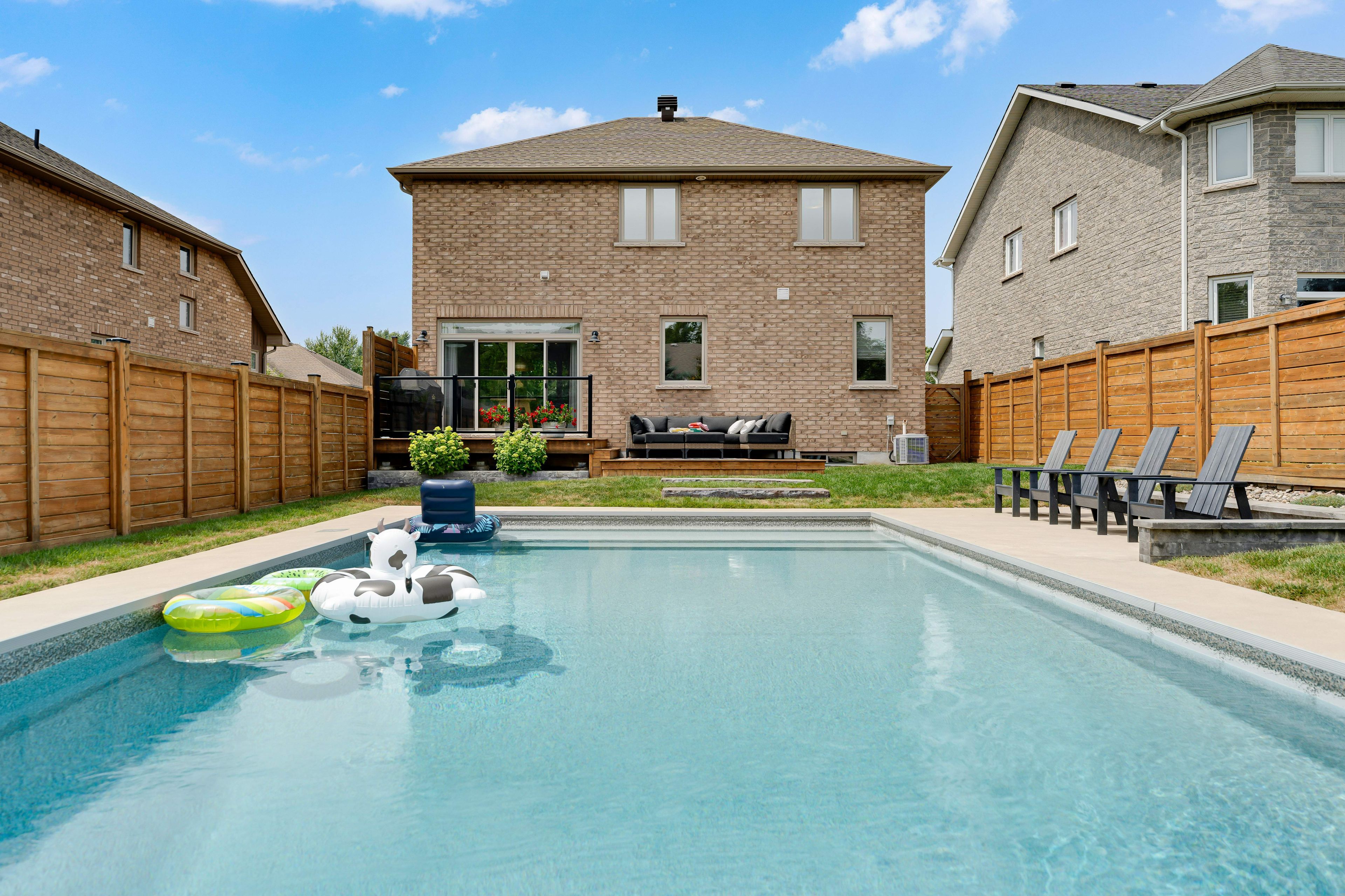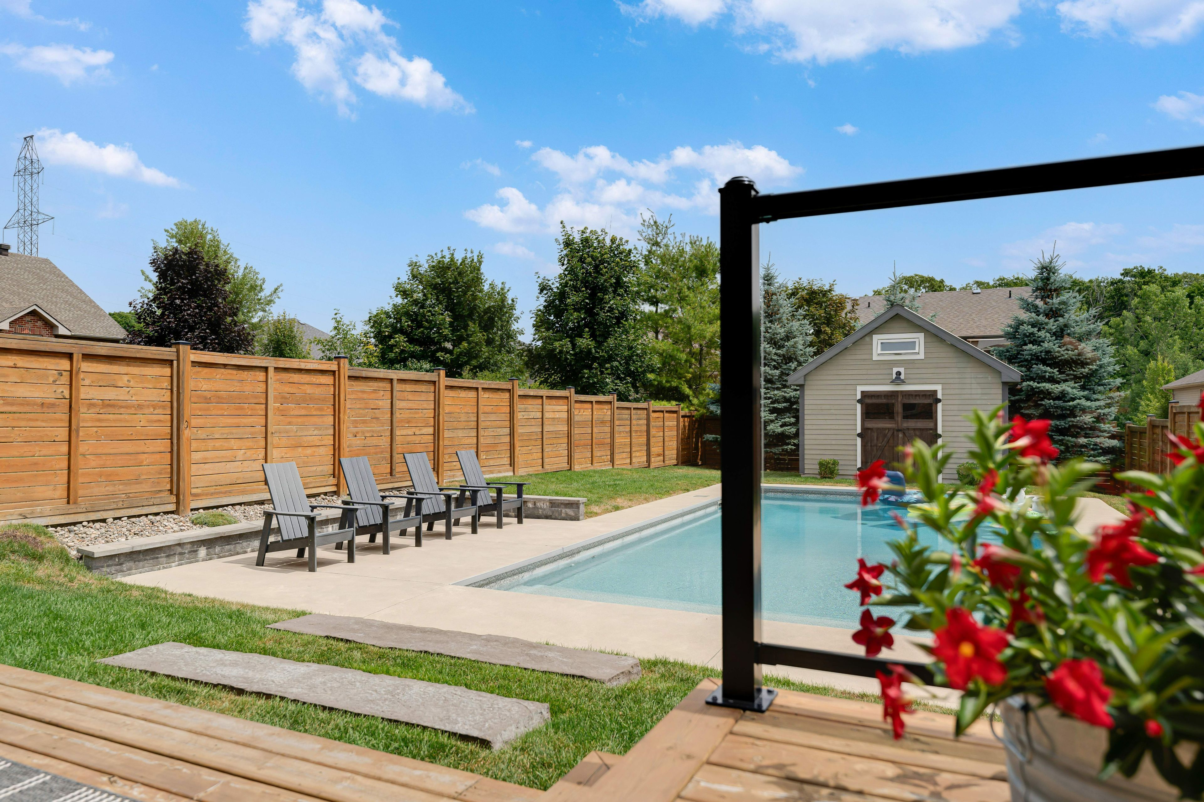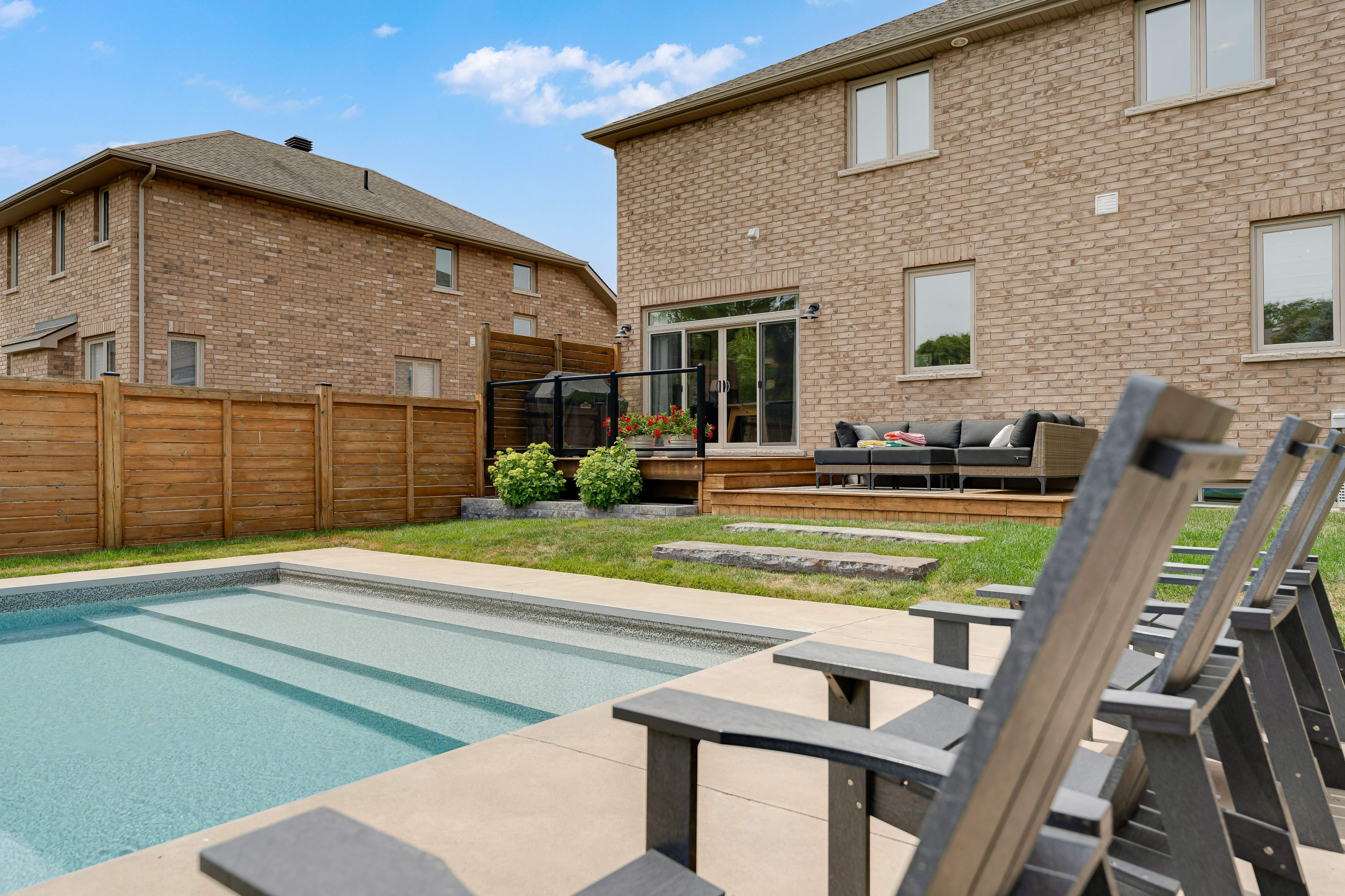 • Fully fenced backyard with a salt-water pool and seating areas.
