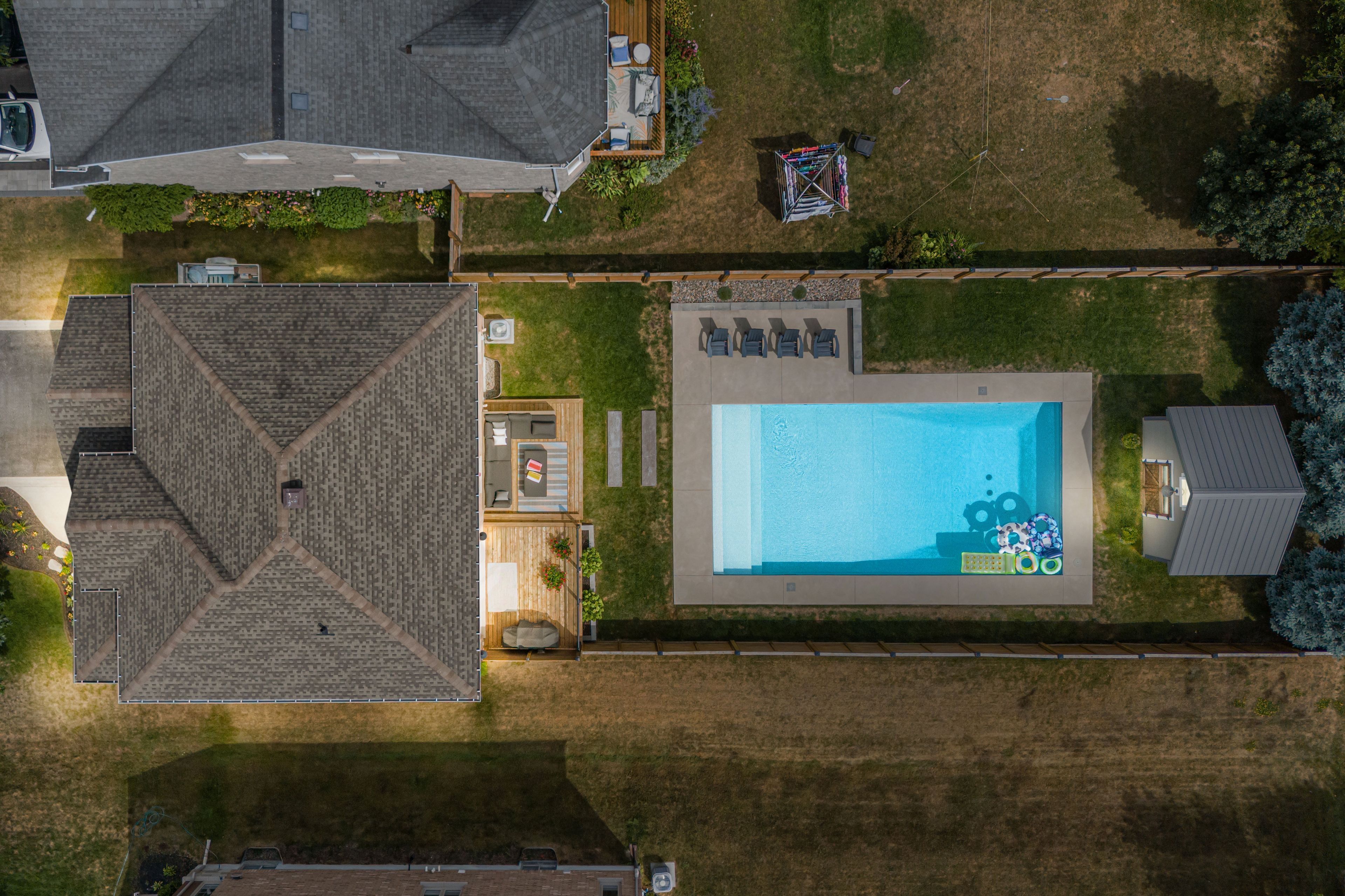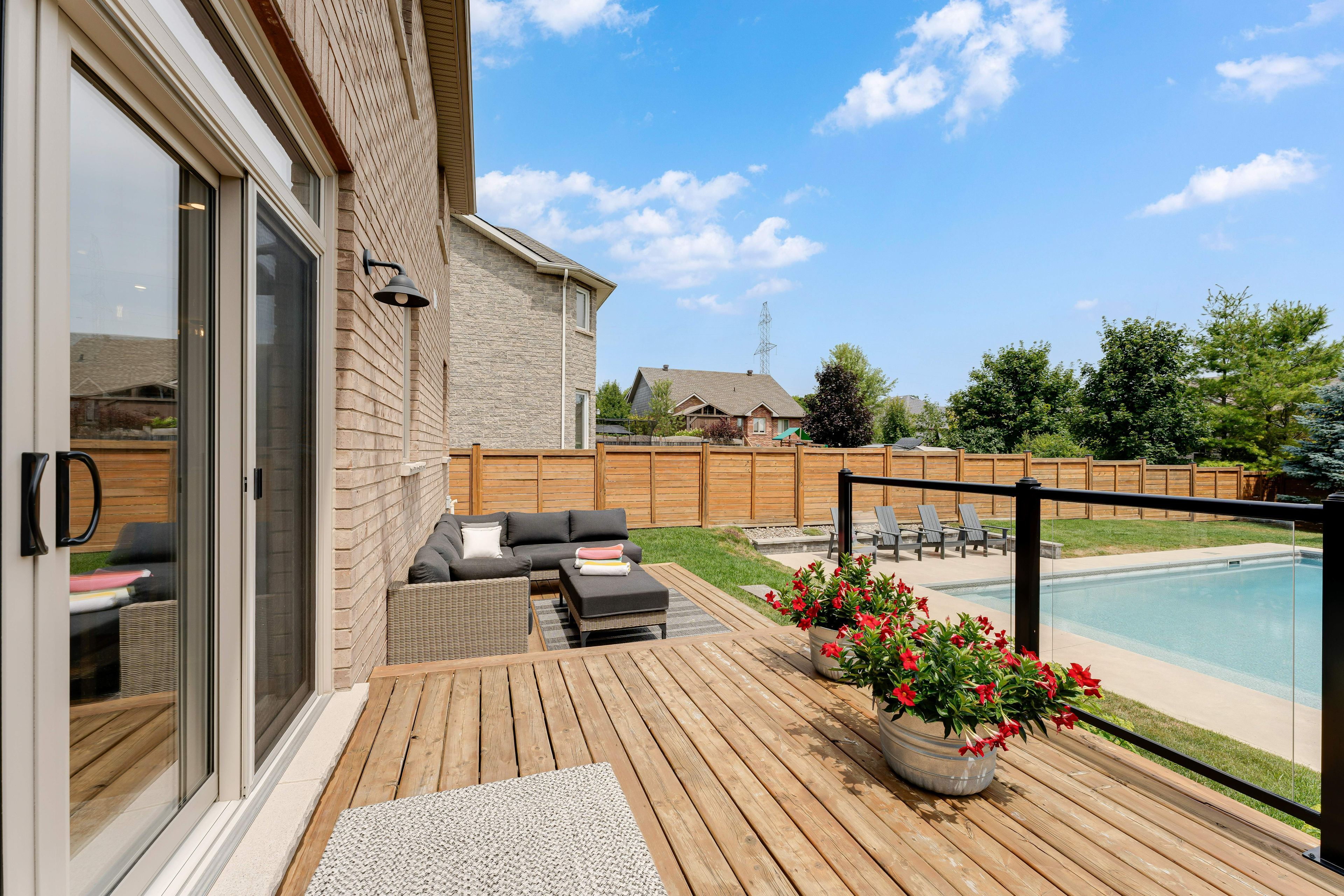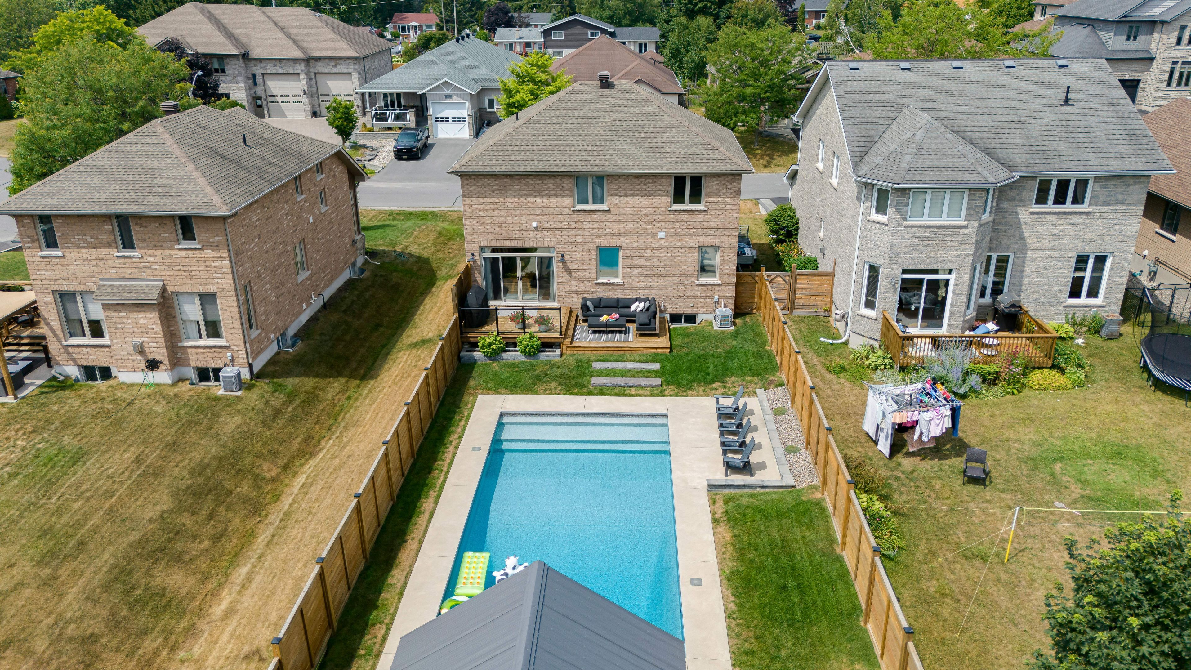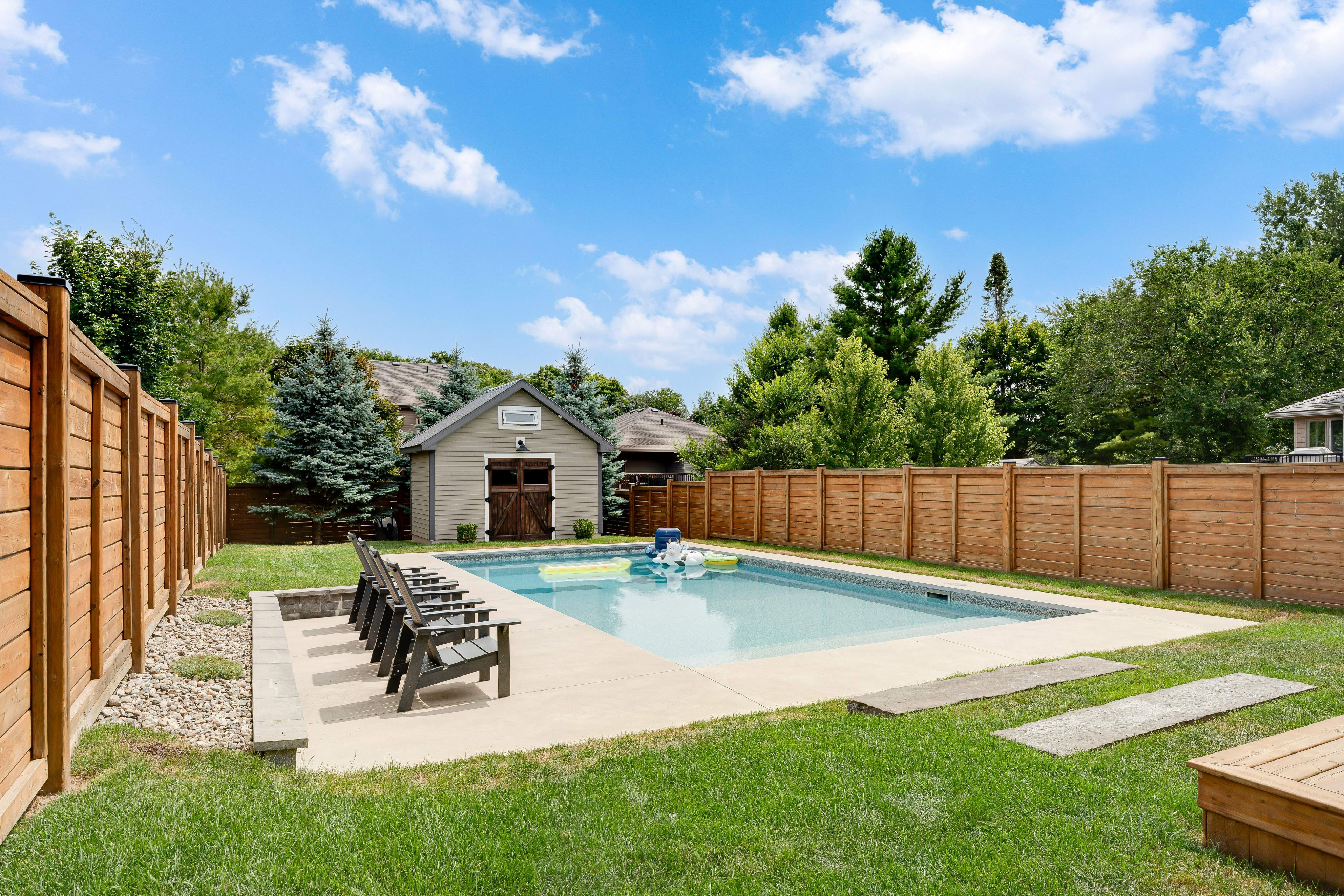 • Fully fenced backyard with a salt-water pool and seating areas.
