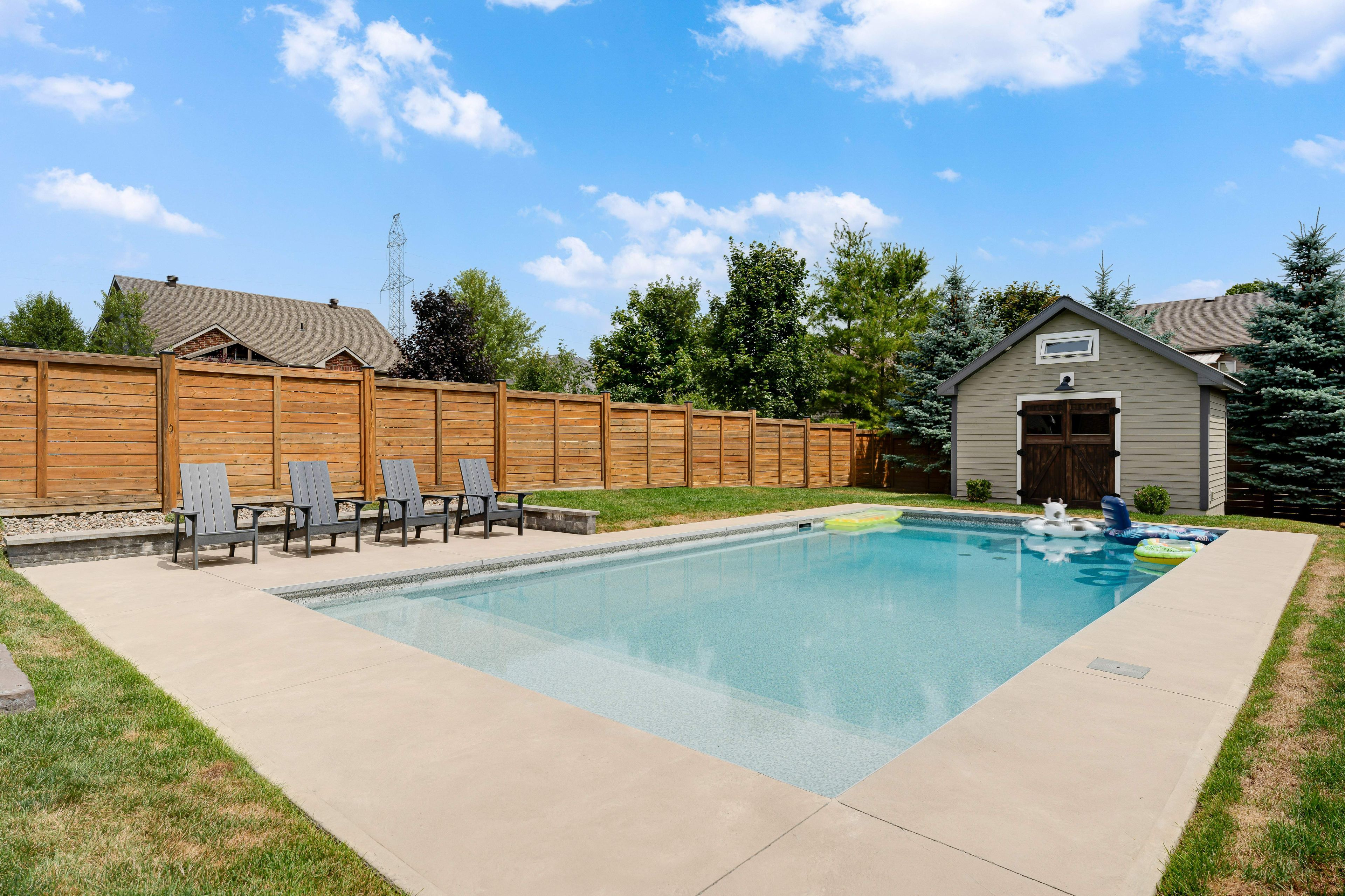Tucked away on a quiet cul-de-sac, this all-brick home offers a rare combination of privacy, function, and outdoor enjoyment. The fully fenced backyard is an entertainers dream featuring an inground salt-water pool, multiple seating areas, a spacious shed, and beautifully landscaped grounds for year-round relaxation. Inside, the main floor impresses with an inviting open-concept layout. The living room, complete with a sleek gas linear fireplace, flows seamlessly into the dining area and newly updated kitchen highlighted by warm wooden cabinetry, a dedicated coffee station, and a handy mud area with a 2-piece bath. Upstairs you will find three bedrooms, including a primary suite with a walk-in closet and a stylishly renovated 4-piece ensuite. A full second bathroom and convenient second-floor laundry add everyday ease. The fully finished lower level provides ample space for recreation, a 4-piece bath, and additional storage or utility needs. This well-maintained home offers both comfort and lifestyle perfect for families or those who love to entertain.