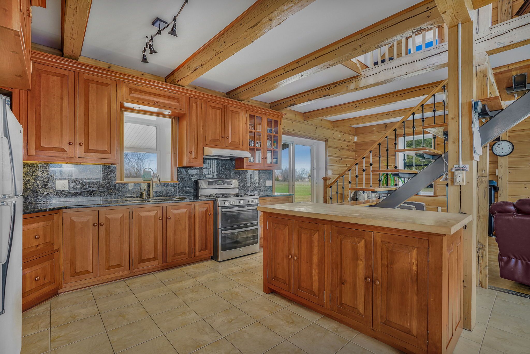 • Stylish kitchen with granite countertops, custom cabinetry, and movable island.
