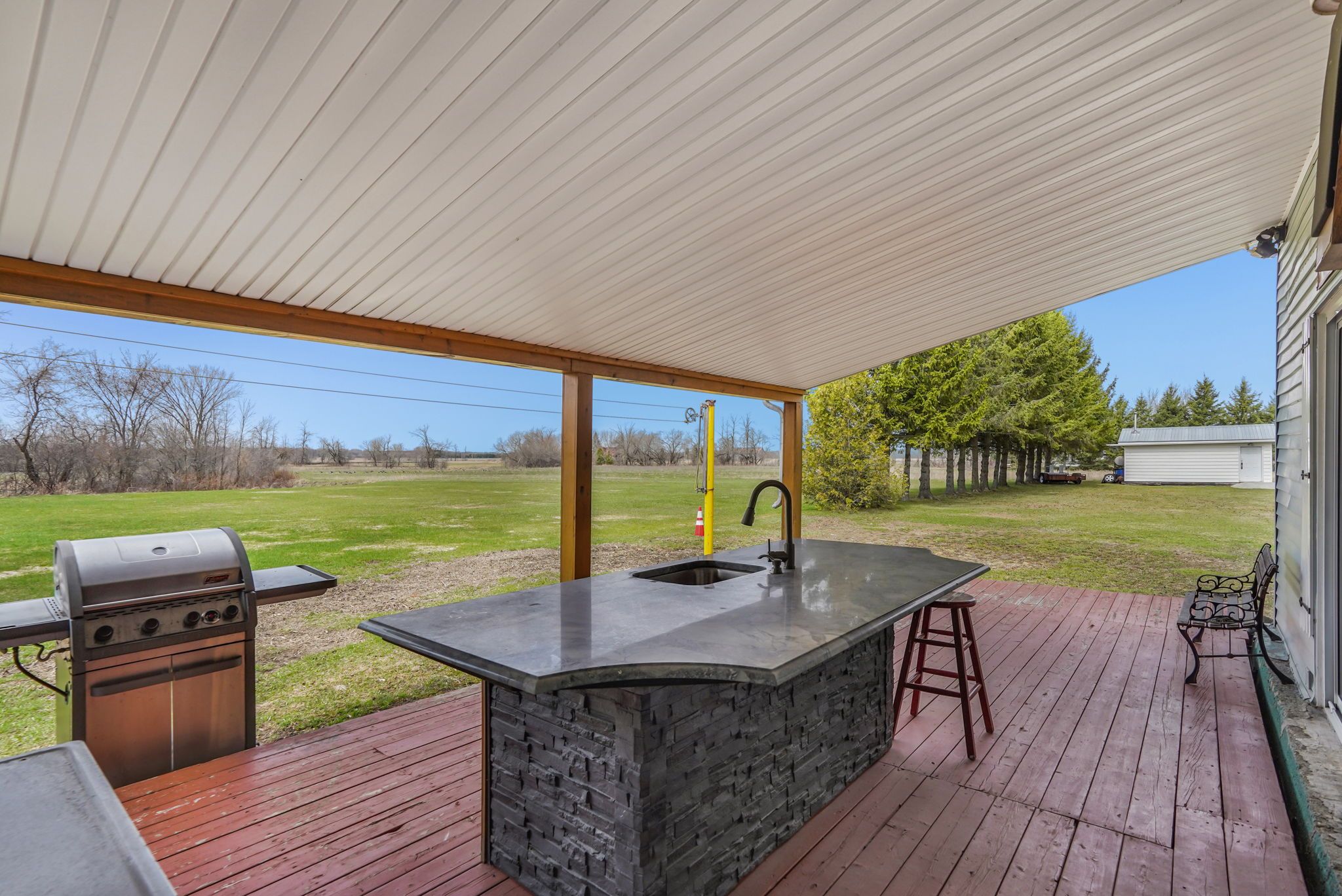 • Peaceful creek-side backyard with outdoor kitchen and large covered deck.