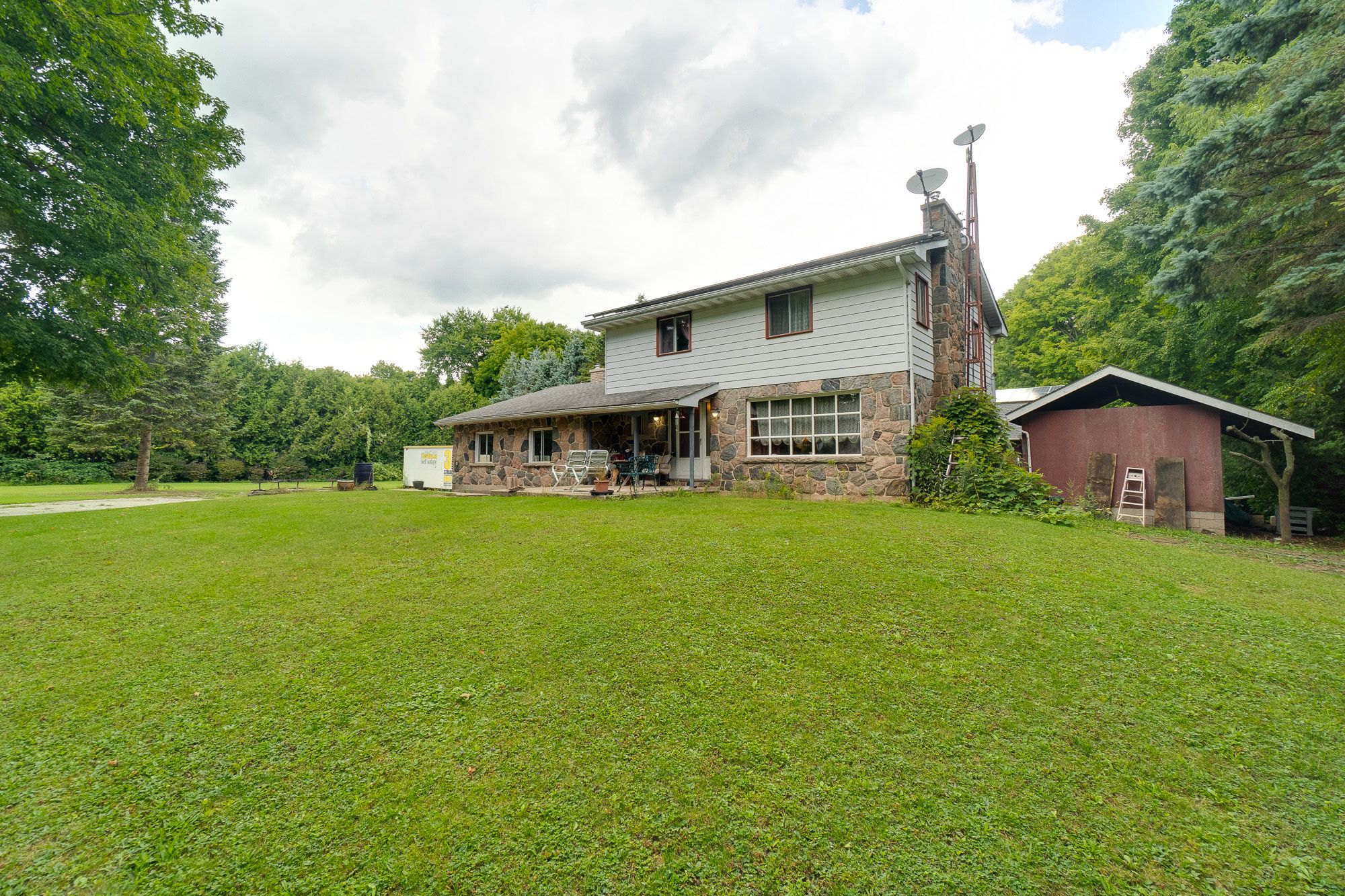 An exceptional 10 +/- acre country escape in the sought-after community of limehouse esquesing minutes from acton. Surrounded by highly gentrified properties, this peaceful estate sized property features; a solid 2400 sq. Ft +/- 1970's 4 bedroom brick home, 24' x 30' two storey barn/shop, outbuildings, level topography with a wandering river feature, partially cleared lands and mixed forest canopy with trails throughout and backing onto the bruce trail system! Opportunity abounds with your bold vision, in this charming locale. Renovate, re-build, or lightly upgrade to make this home, your home. Enjoy the best of both worlds; the peace and privacy of country living, with easy access to hiking and biking trails, and all the conveniences of modern life just a short drive away to acton; about 8 minutes. Whether you're looking for a full-time residence, weekend retreat, or profitable investment, this property checks every box. The property is being sold on an as-is basis. Additional structures: i) steel building 40' x 14', ii) freestanding garage 20' x 18' iii) carport 20' x32'. $240,000 solar microfit system produces annual income of $6,000 to $9,000