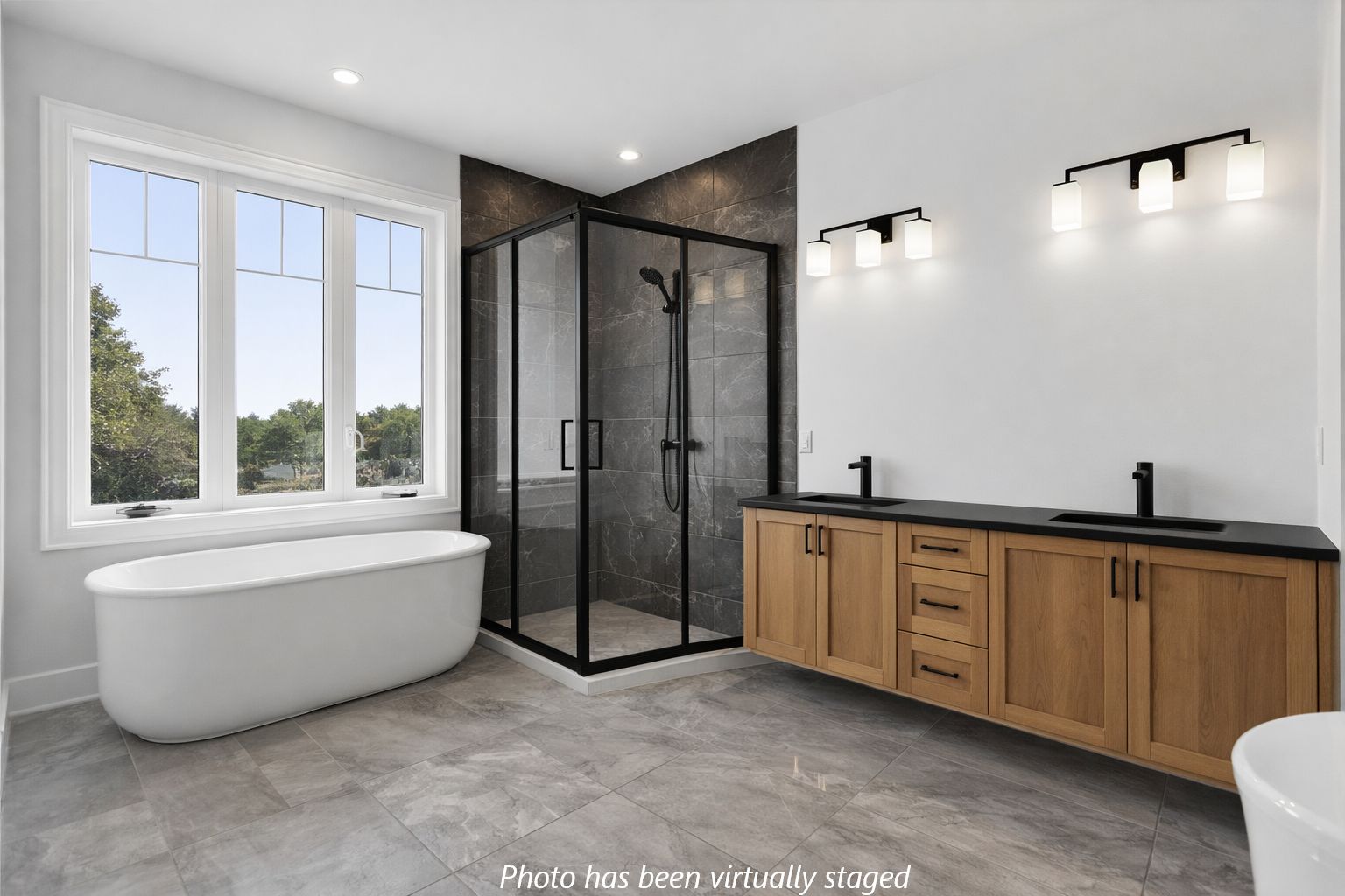 • Luxurious master suite features a soaker tub and tiled shower.