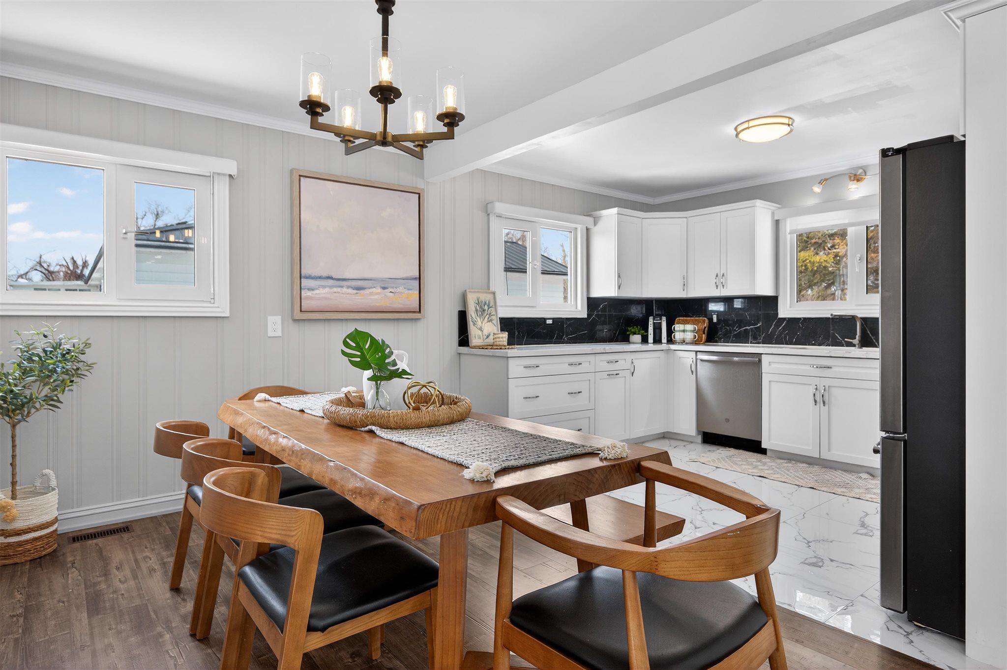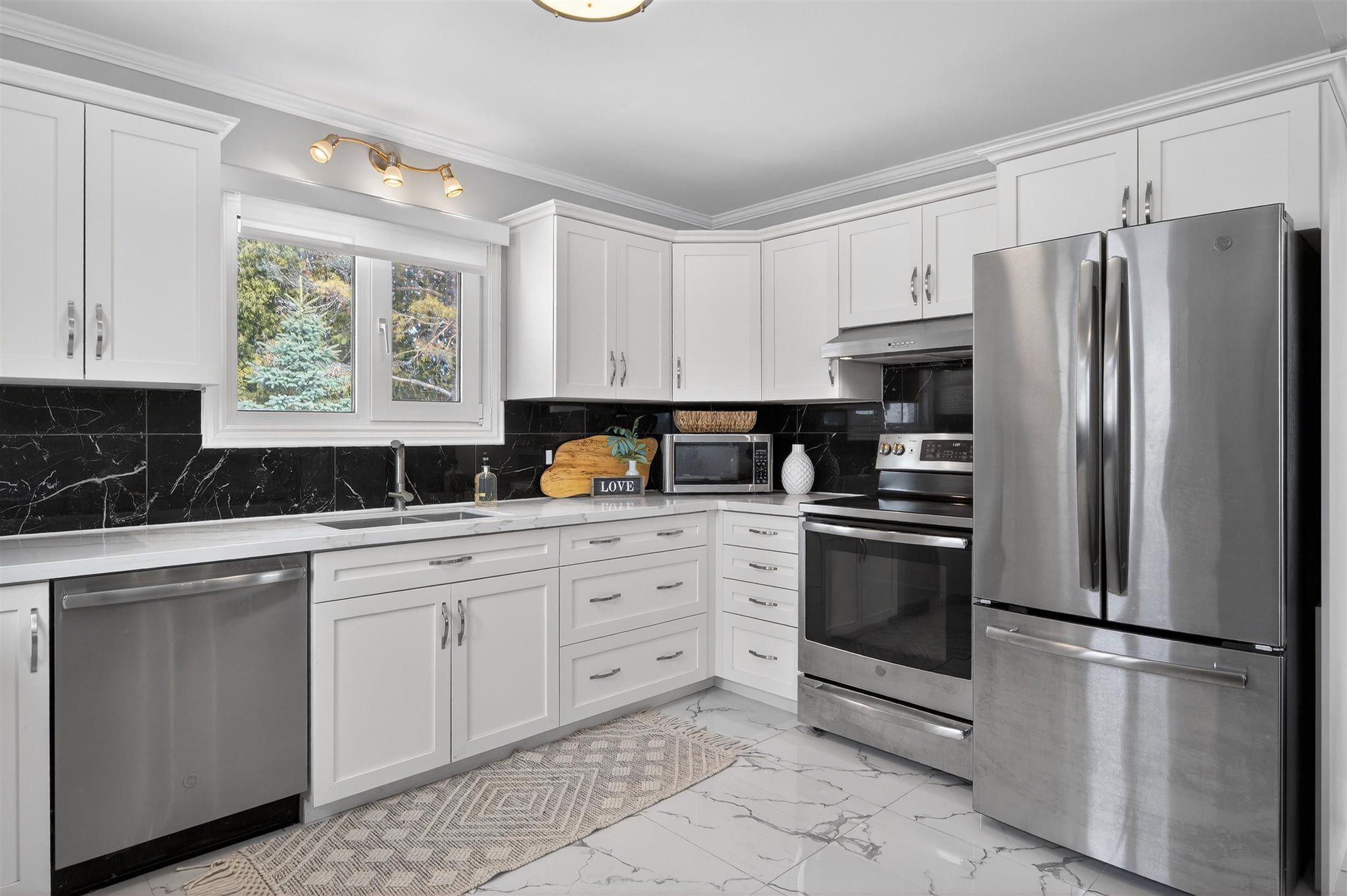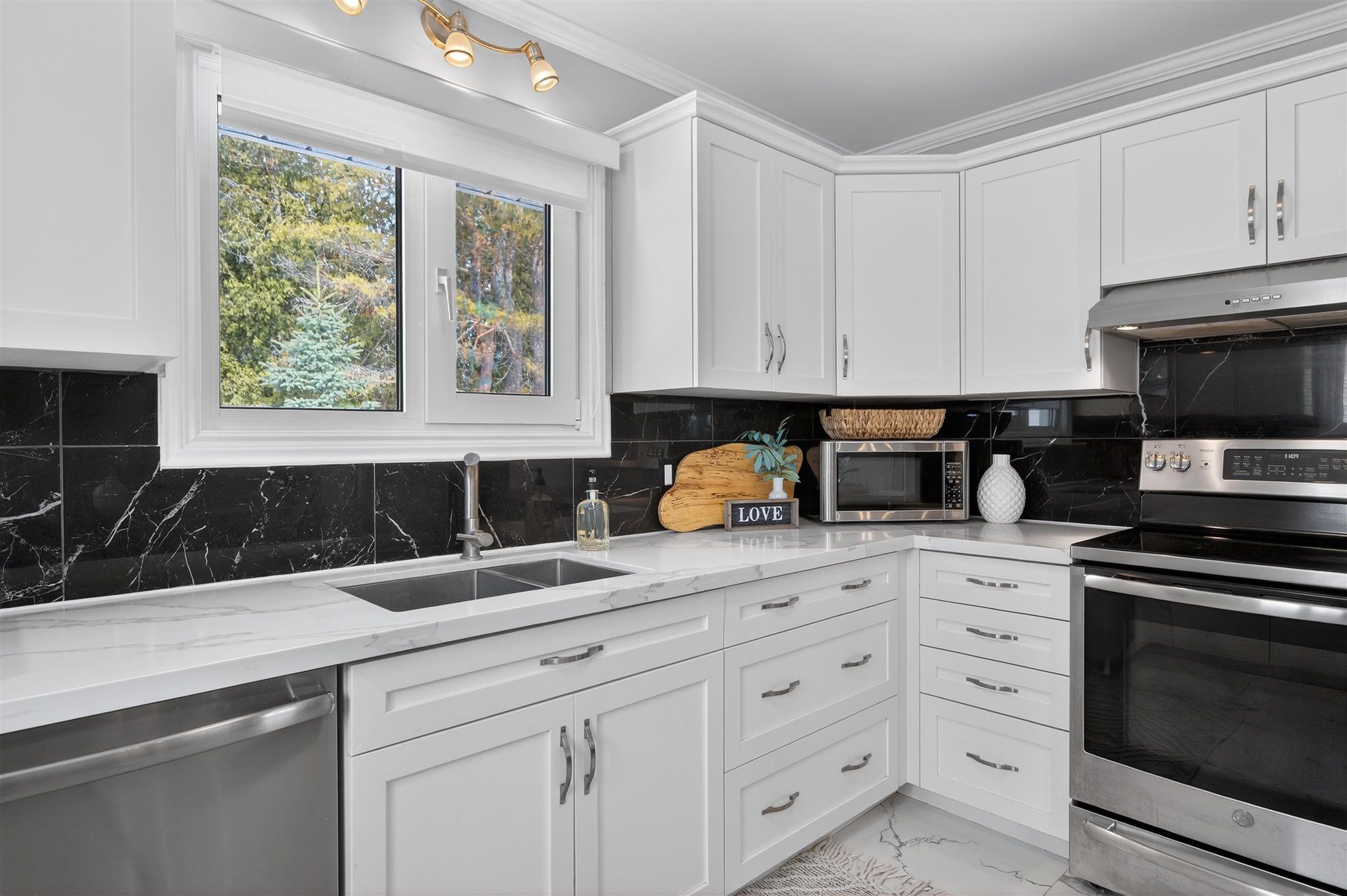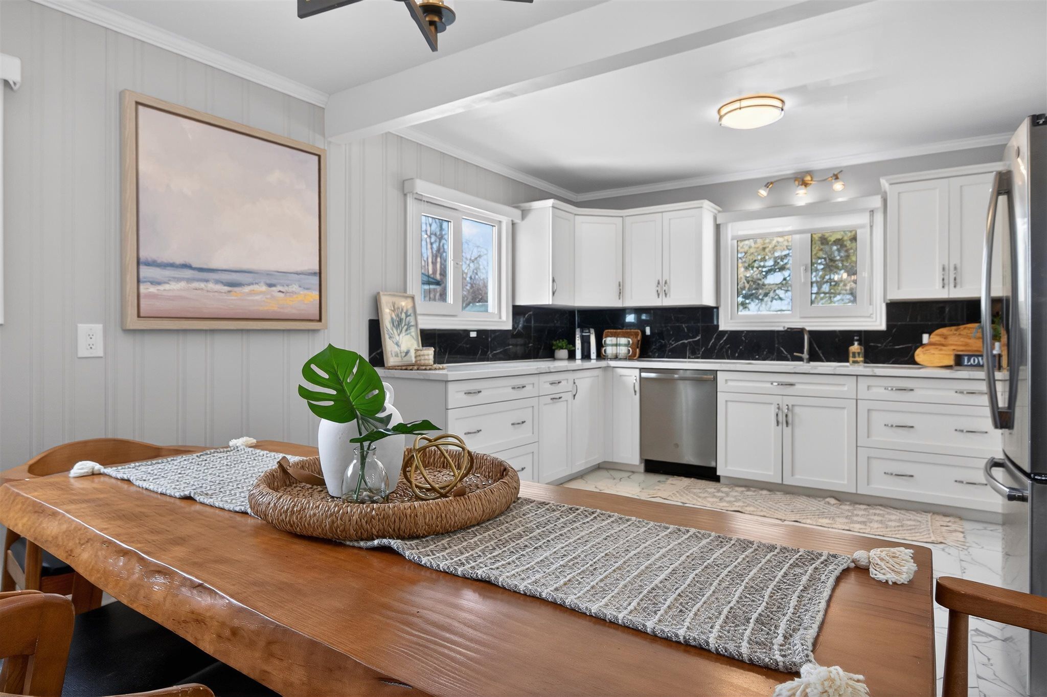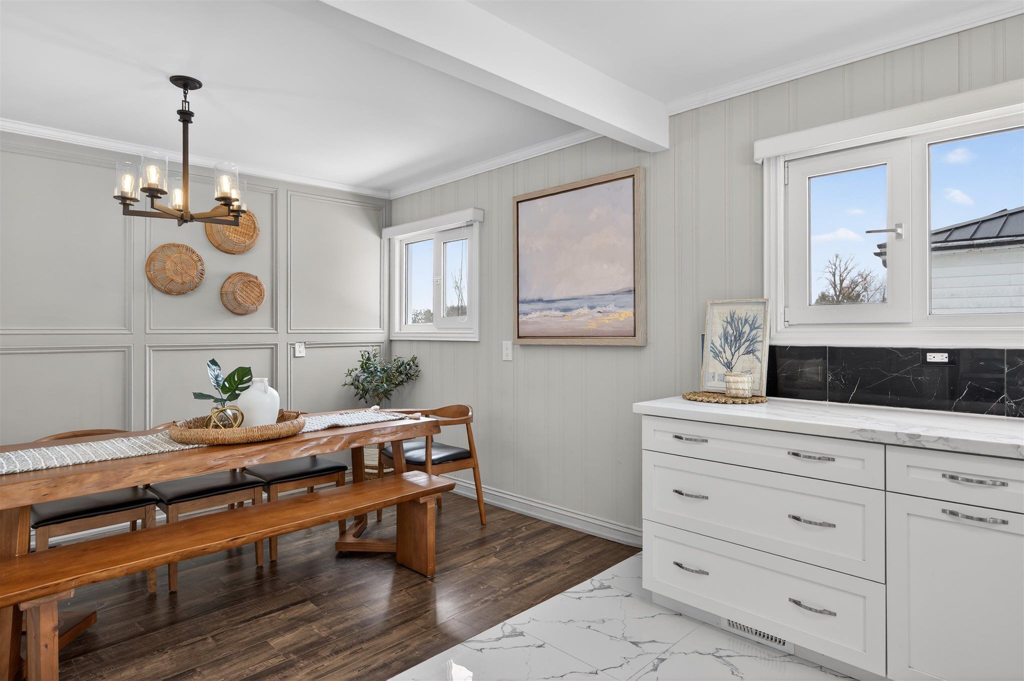 • Stunning eat-in kitchen with custom cabinetry and stainless steel appliances.