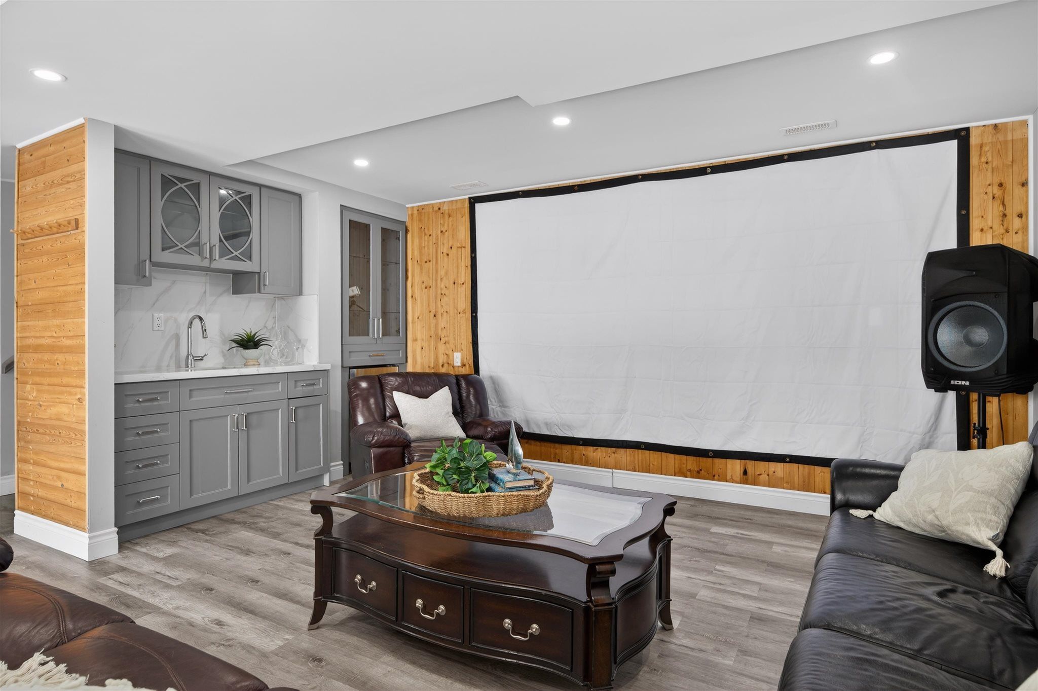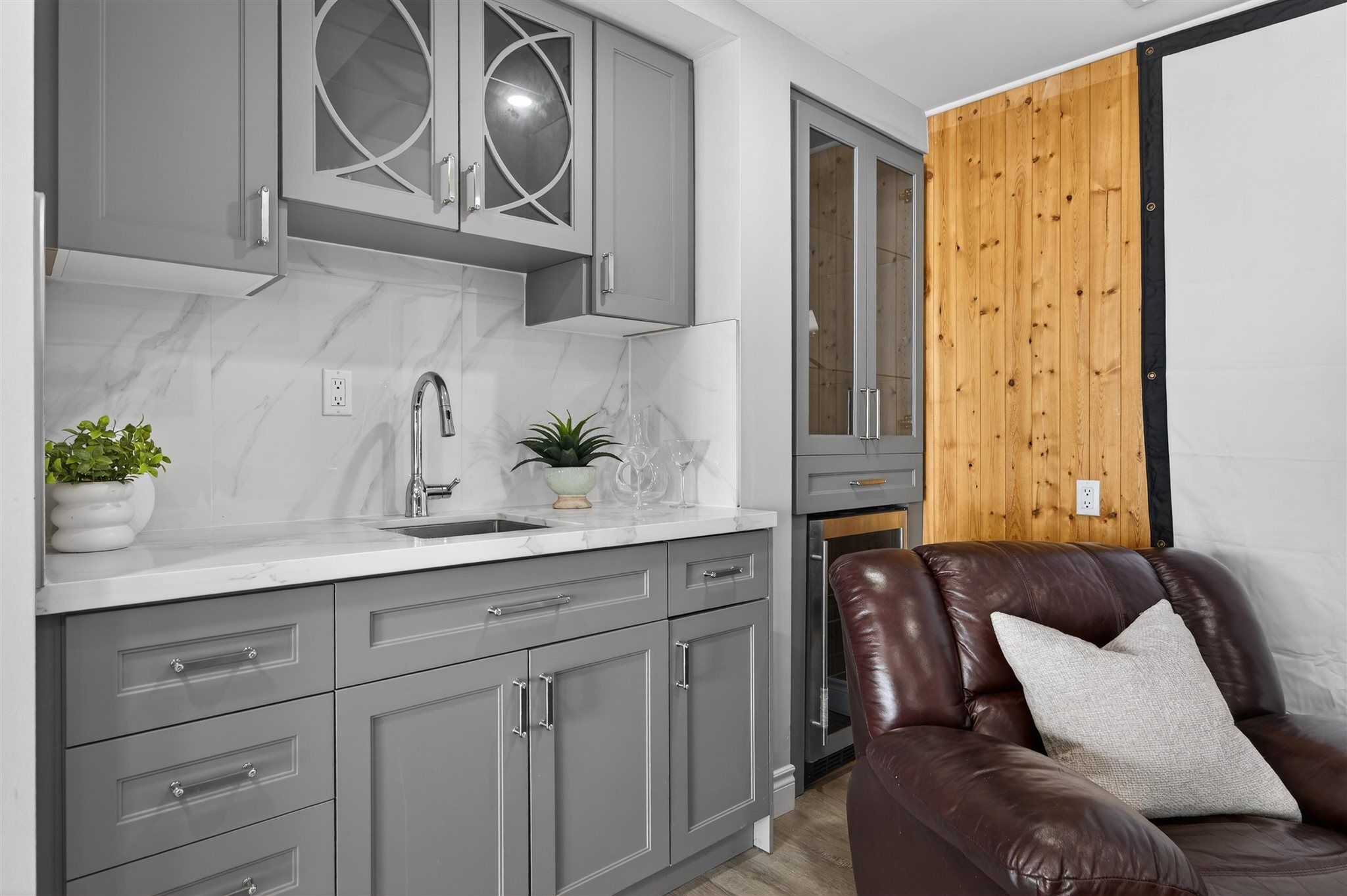 • Cozy family room with wet bar, wood fireplace, and high ceilings.