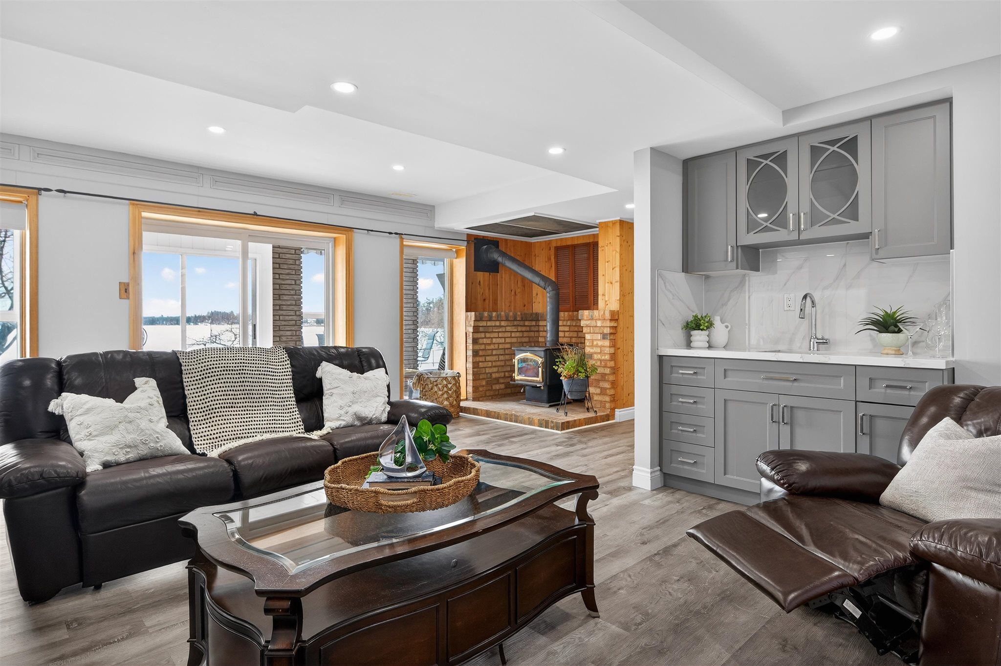 • Lower level features a cozy family room, wet bar, and a wood-burning fireplace.