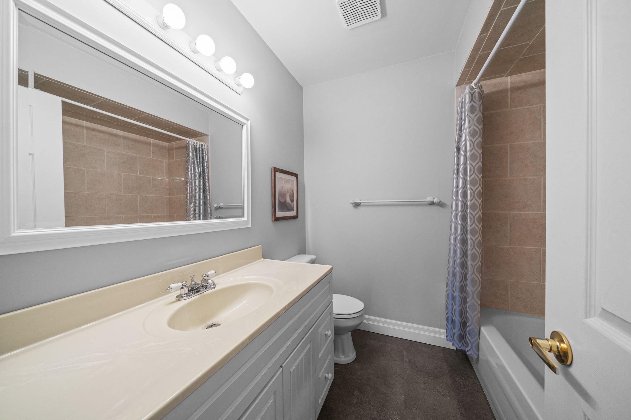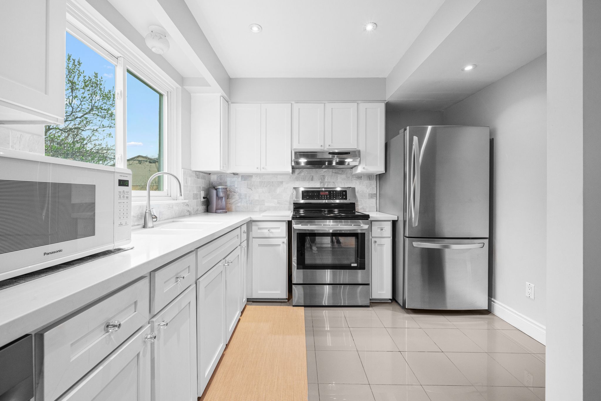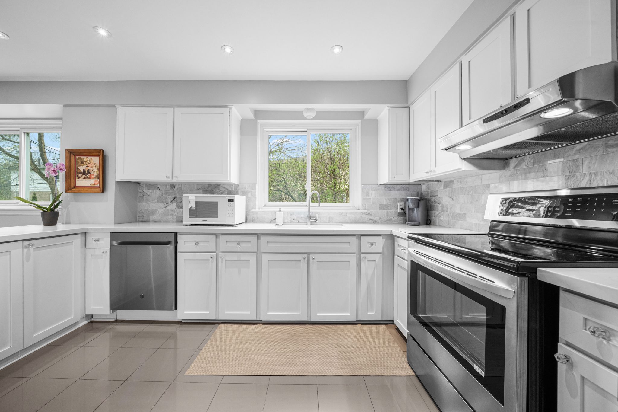 • Modern kitchen with quartz countertops, great for family gatherings.