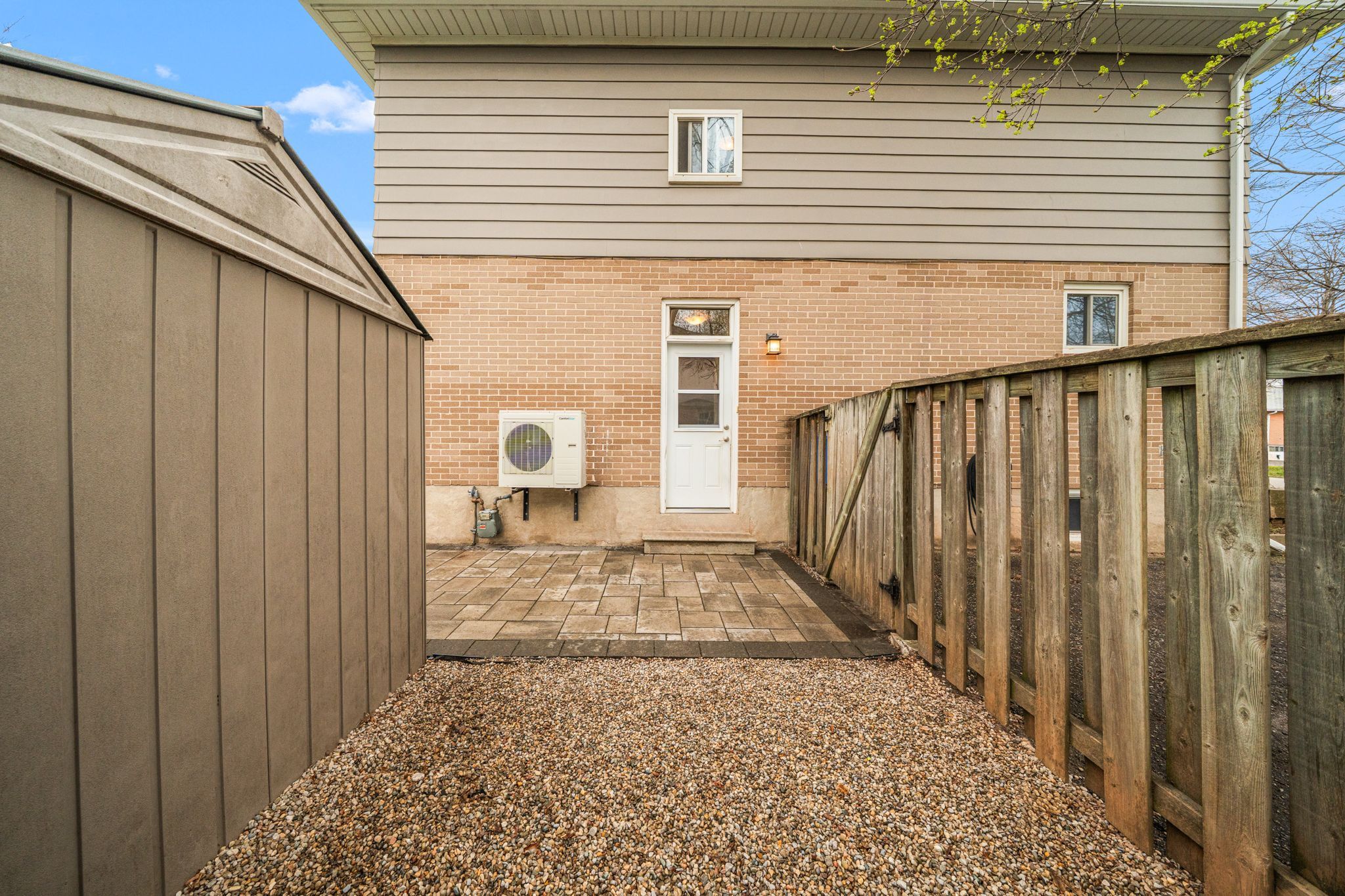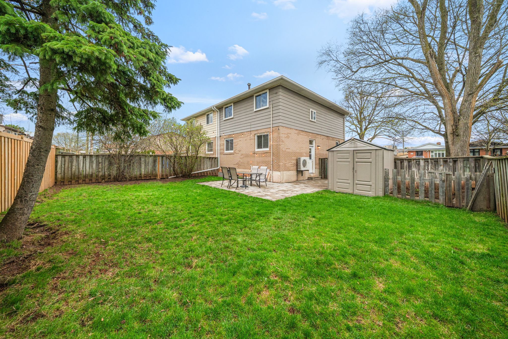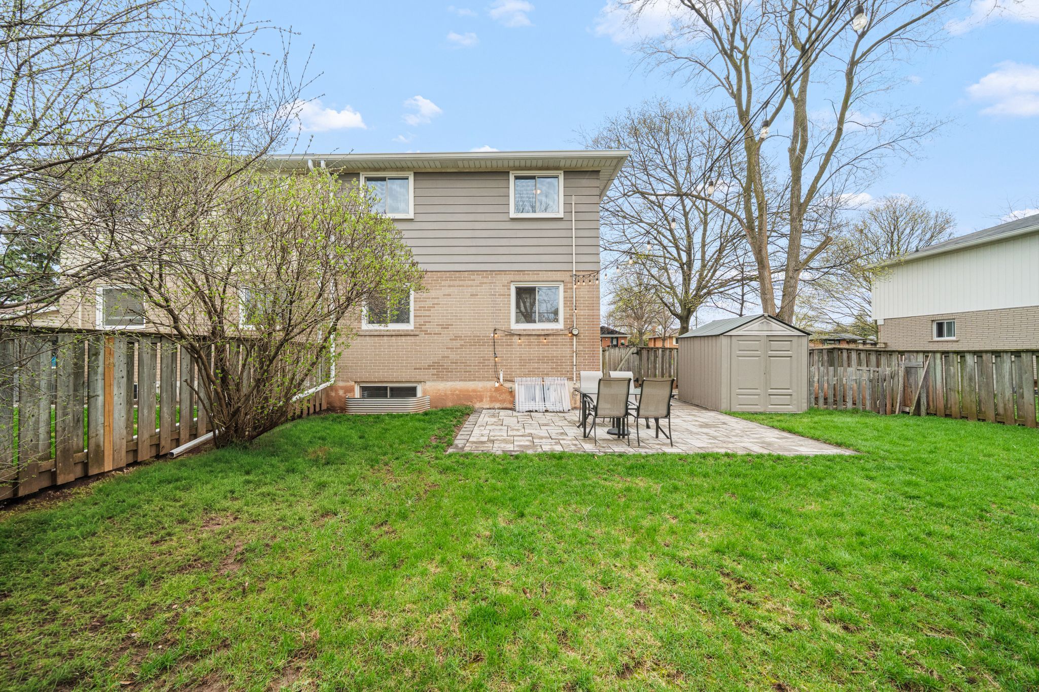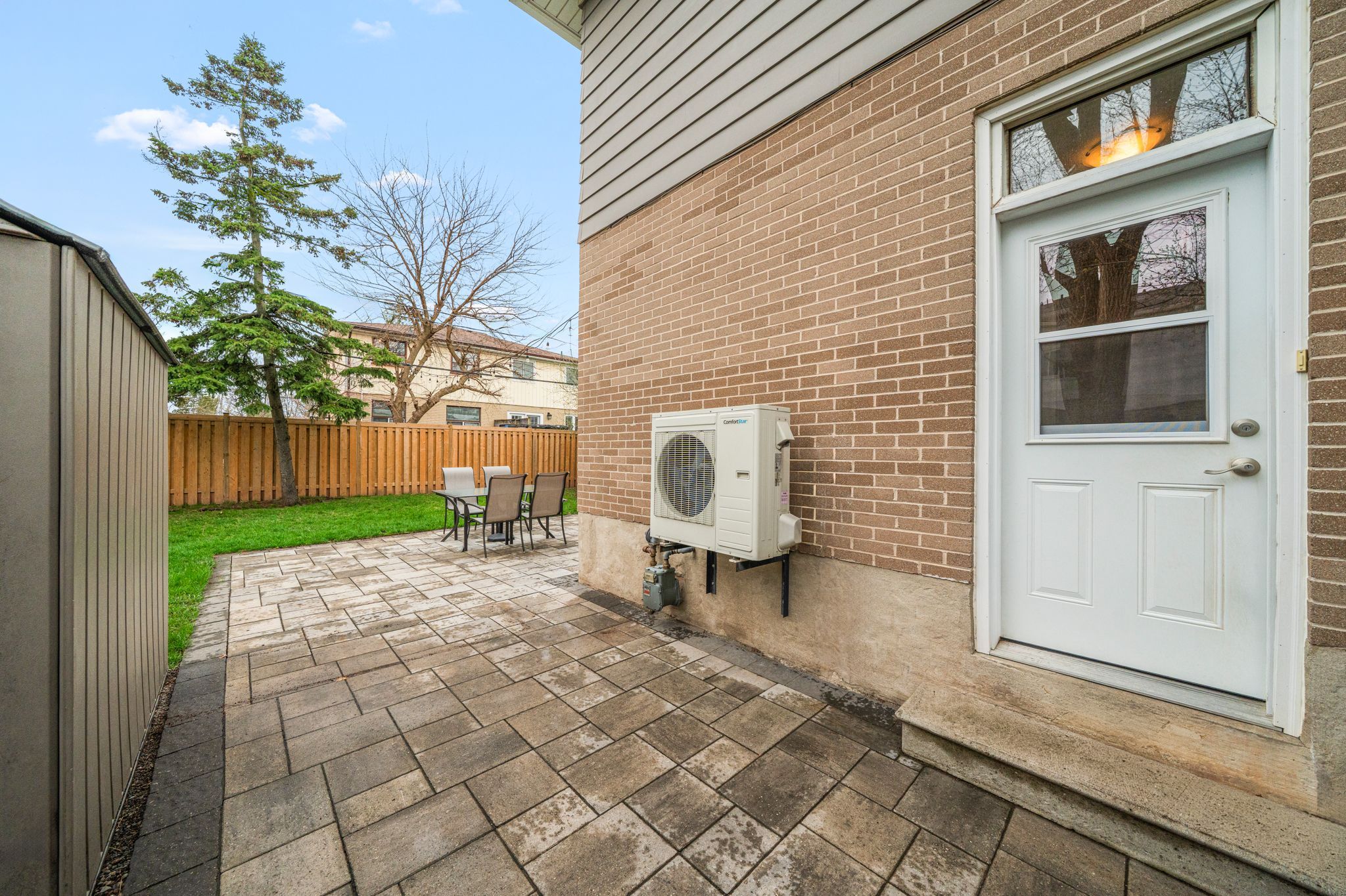 • Private backyard with stonework and mature trees, perfect for relaxing.