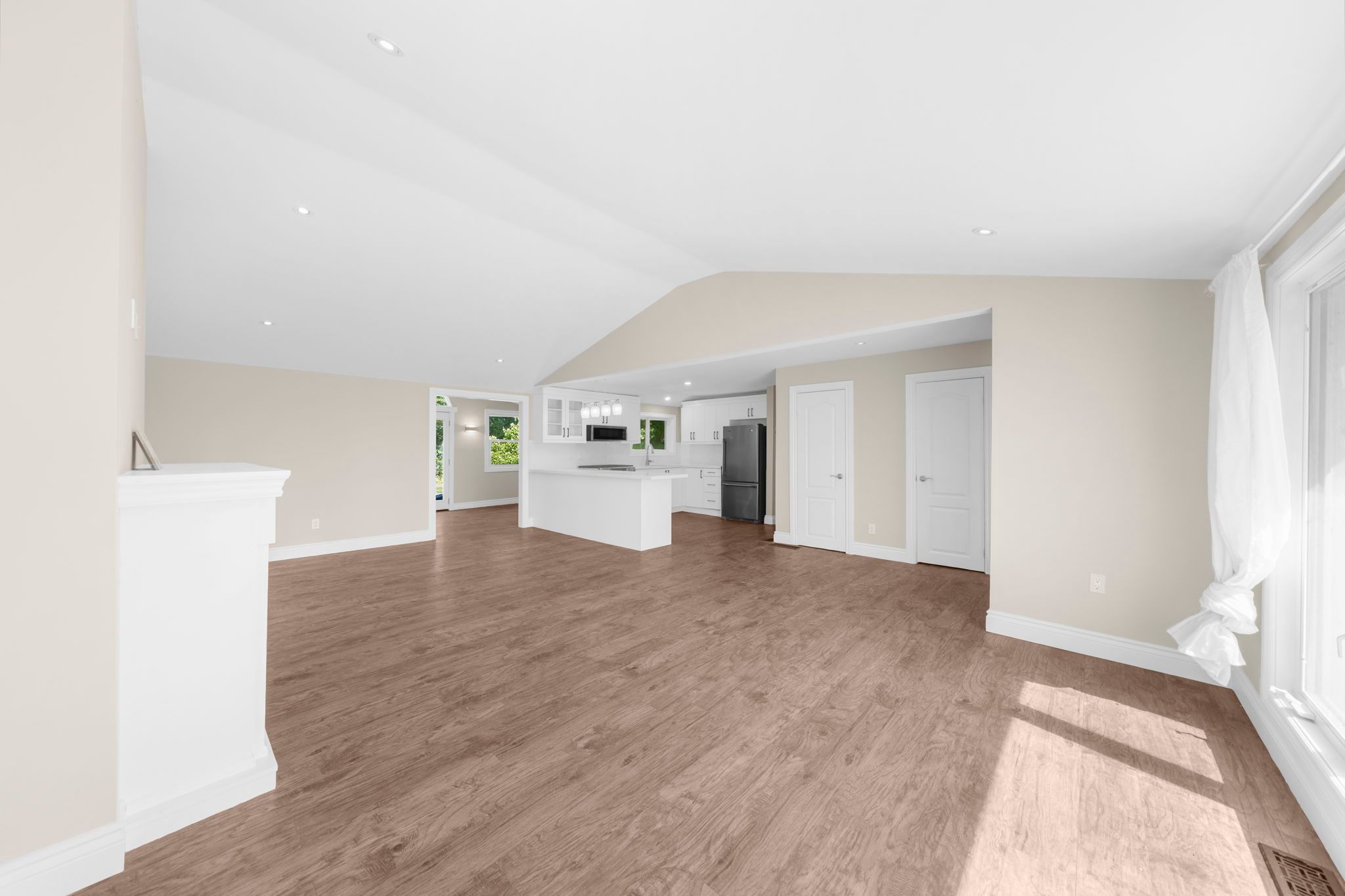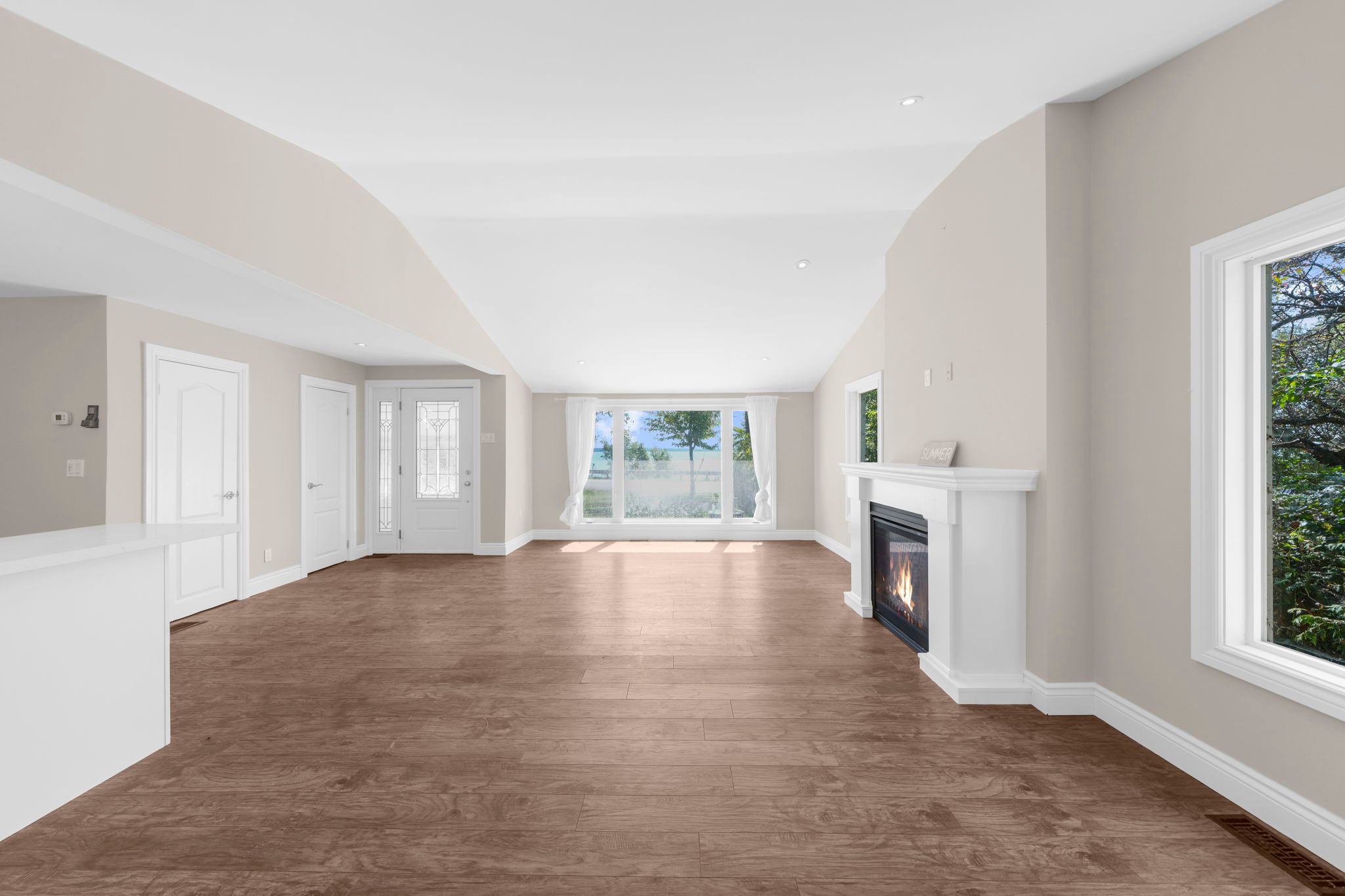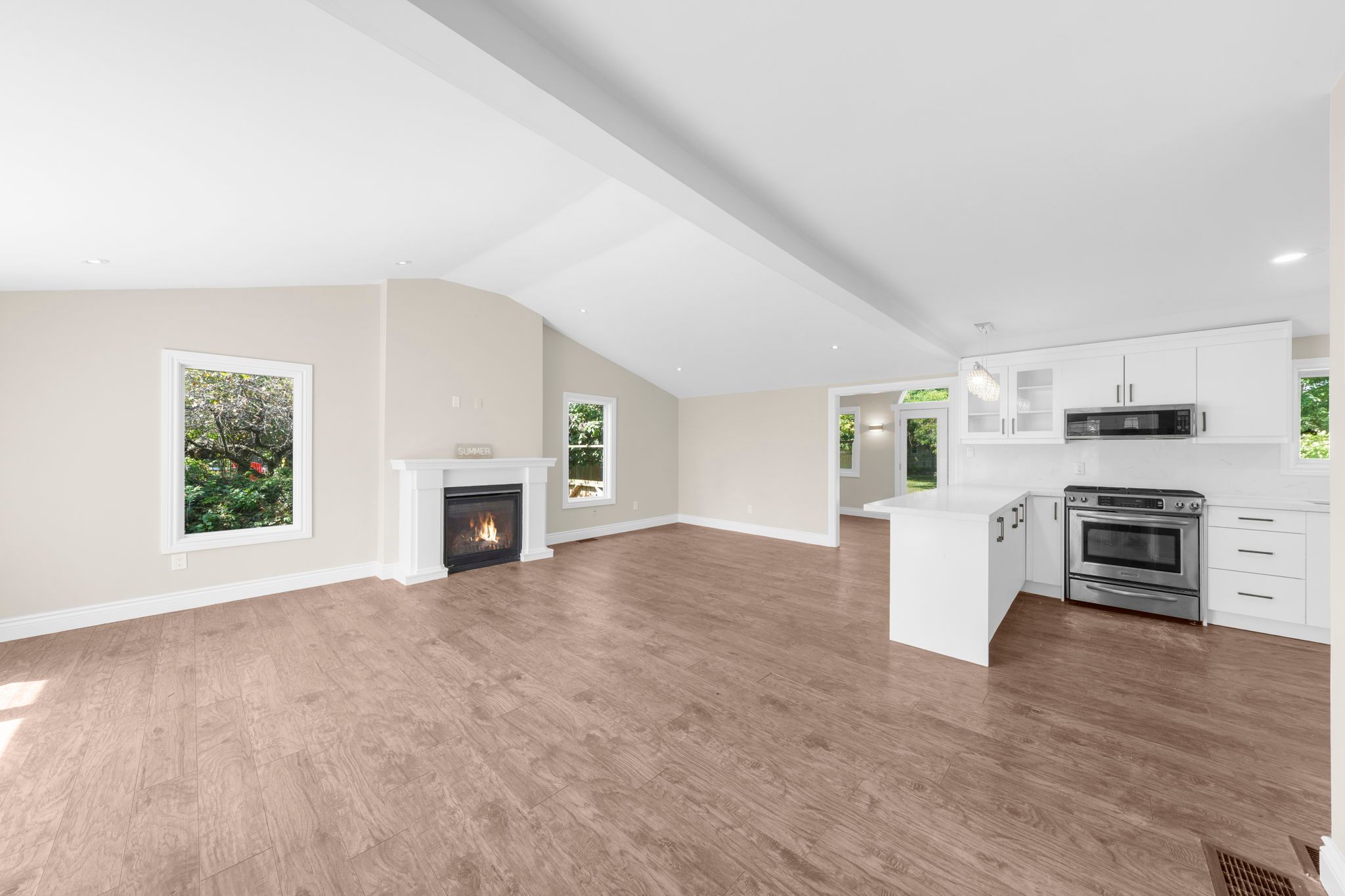 • Open-concept living and dining area with tall ceilings and cozy fireplace.