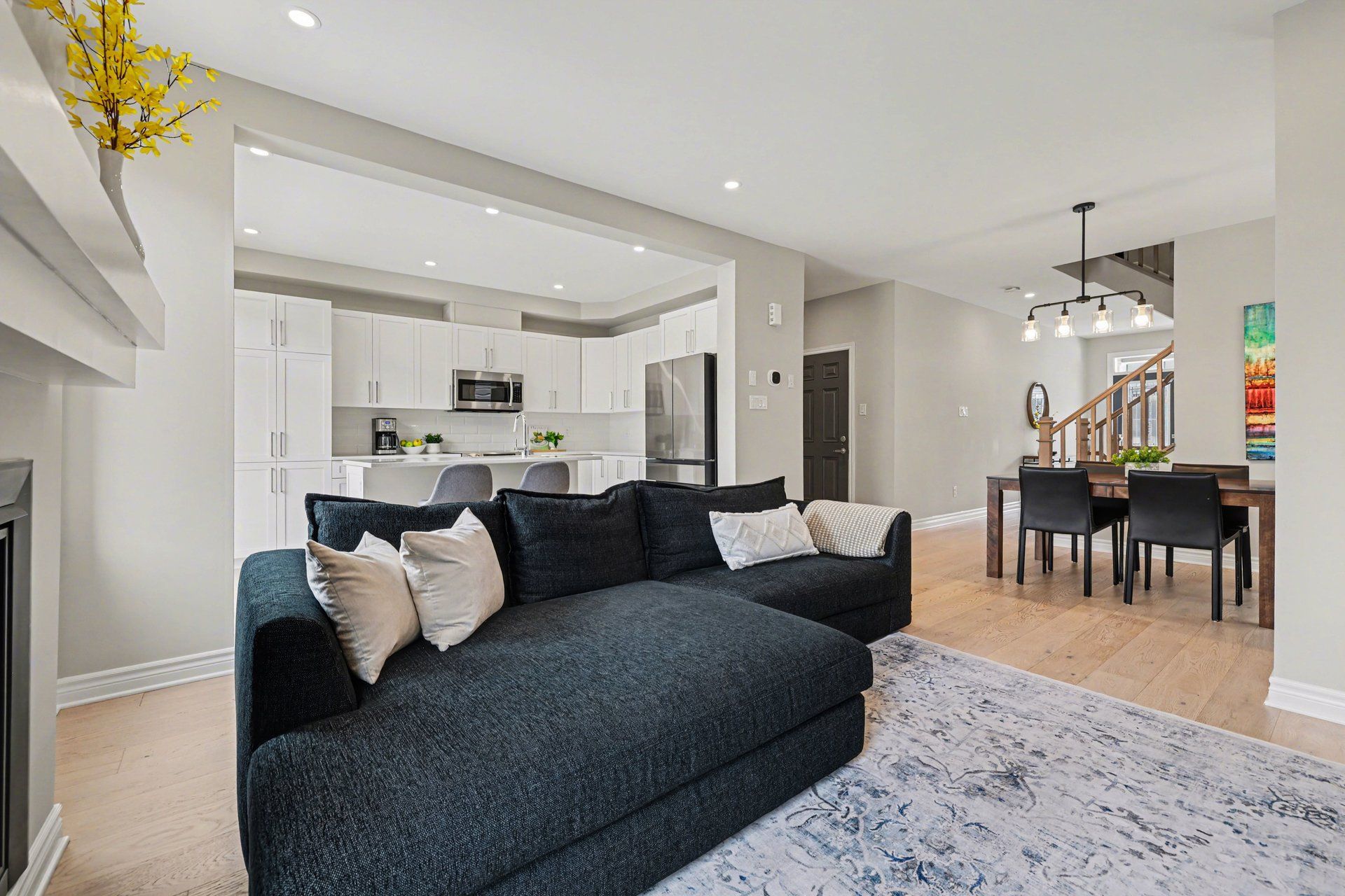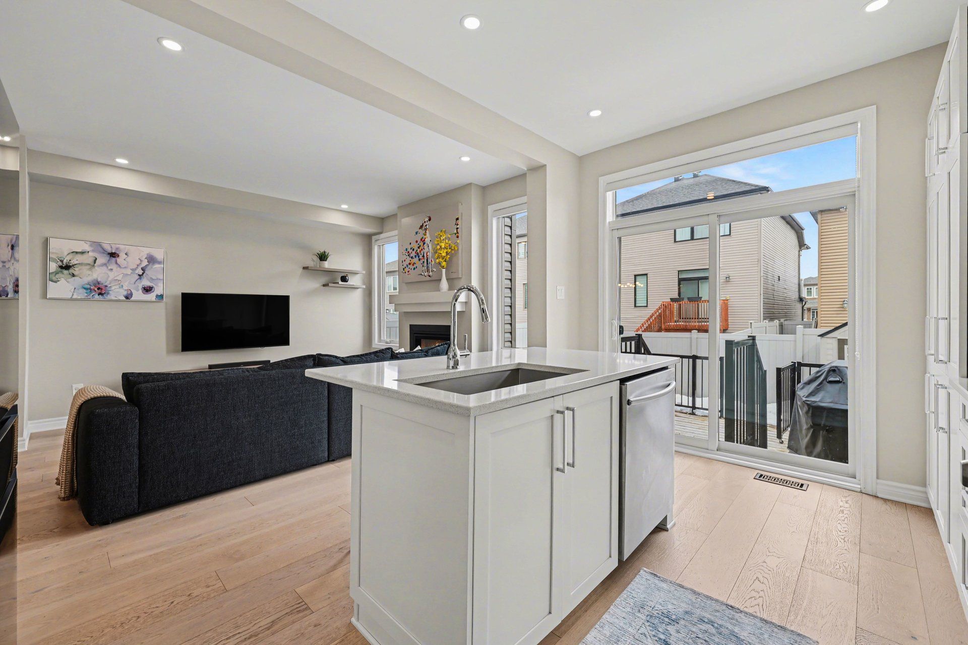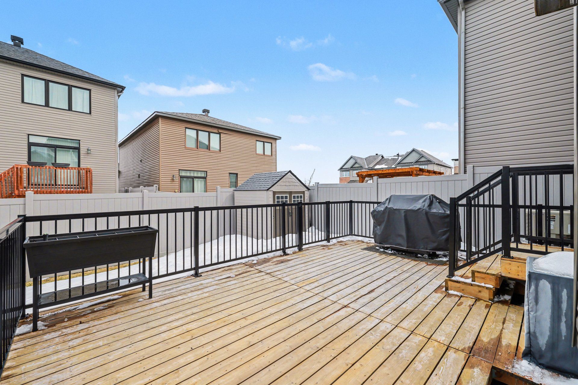 Offering the ideal blend of style and walkability, this impeccable 3 bedroom 4 bathroom home is situated on a popular family friendly street. Located walking distance to shops, restaurants, farm boy, starbucks, parks, trails, schools and amenities & close proximity to hwy 417. The main level features a sun filled open concept living and dining room with wide-plank engineered hardwood floors, pot lighting, custom roller shades and gas fireplace. Chef's will delight in this bright kitchen with stainless steel appliances, generous pantry, large island with oversize sink & breakfast bar. A walk-in closet and powder room complete this level. The second level features a spacious primary bedroom with walk in closet & 3-piece ensuite, 2 additional good sized bedrooms, main bathroom & convenient laundry room. The finished basement (2023) provides additional living space, including a family room with pot lighting, an electric fireplace, a 3-piece bathroom, and a flex space currently used as an exercise room. The exterior is perfect for entertaining, featuring a fully fenced backyard with a spacious cedar deck (2020). For added convenience, the property includes an irrigation system, a natural gas bbq hookup, a garden shed, and a garage wired for an ev charger.