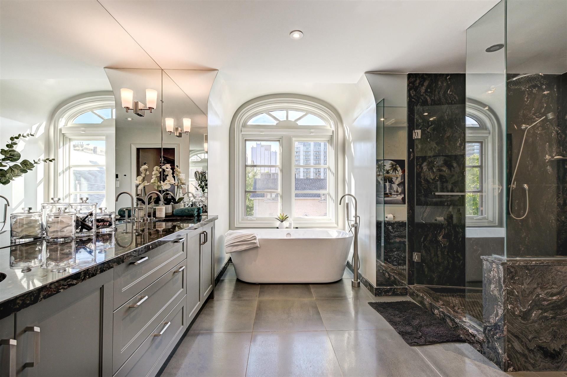 This stunning and luxurious semi-detached is located in the prestigious summerhill neighbourhood. Walk into an elegant grand foyer which opens up to a beautifully designed and decorated living and dining room. Renovated and updated with top quality materials showcase the pride of ownership in this grand home. With high ceilings throughout, at the heart of the home is a chef's dream gourmet kitchen featuring a custom built-in gaggenau french door fridge and la cornue french 5-burner gas stove. This family-sized kitchen also boasts granite countertops, custom cabinetry and opens up to a juliet balcony. The main level has a walkout to a large balcony overlooking a fully fenced backyard oasis in the heart of the city. On the upper levels you will find three spacious bedrooms including a private primary bedroom with a lavish 5-piece ensuite featuring brazilian granite walled shower and counter with garnet inclusions, and heated floors for spa-like comfort year-round. The custom walk-in closet and built-ins within the bedroom are made of exotic wood veneers with cherry frames. The onyx stone step leads to the primary bedroom balcony which offers a beautiful view of the cn tower and city. The skylight over stairs on the upper level provides a warm and bright interior showcasing the newer hardwood floors. The lower level can be used for multiple purposes, including a recreation room, home office, gym, or a fourth bedroom which includes custom california closets and a built-in murphy bed. Enjoy a convenient walkout to a tranquil garden and covered stone deck. Located close to all amenities, including public transit, shopping, private and public schools, restaurants, and highways, this exceptional property offers it all!