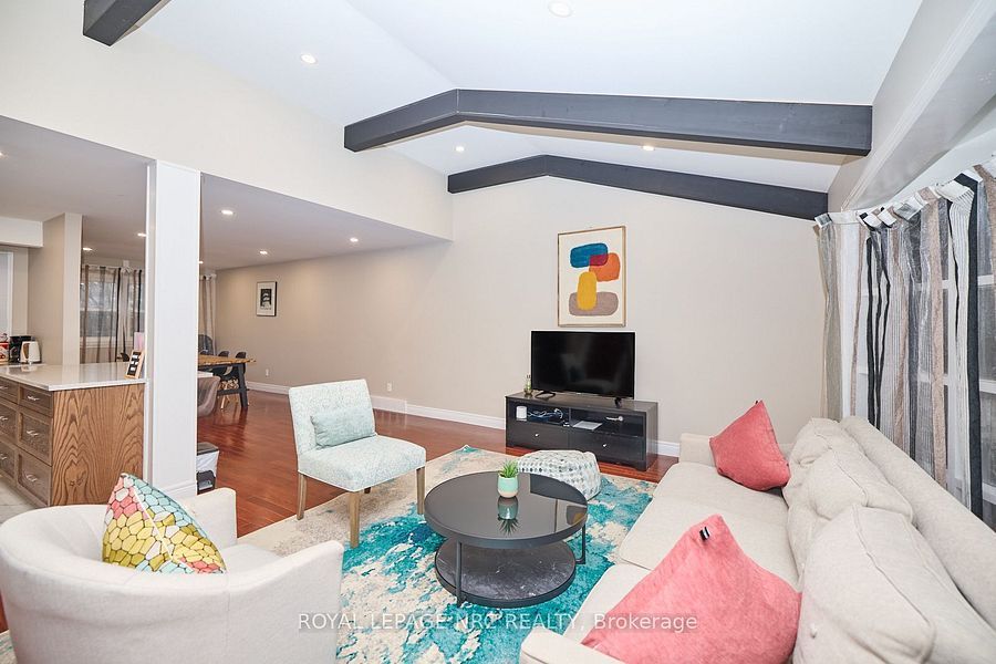 • Bright open-concept living area with vaulted ceilings and large windows.